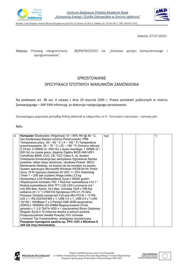 Centrum Badawcze Polskiej Akademii Nauk „Konwersja Energii i Źródła Odnawialne w Gminie Jabłonna” Kontakt: Lider Projektu: Instytut Maszyn Przepływowych PAN; ul. Fiszera 14; 80-231 Gdańsk; tel.: 58 341 60-71; NIP: 584-035-78-82 Gdańsk, 07.07.2015r. Dotyczy: Przetarg nieograniczony oprogramowania”. 38/PN/SKO/2015 na: „Dostawa sprzętu komputerowego i SPROSTOWANIE SPECYFIKACJI ISTOTNYCH WARUNKÓW ZAMÓWIENIA Na podstawie art. 38 ust. 4 ustawy z dnia 29 stycznia 2004 r. Prawo zamówień publicznych w imieniu Zamawiającego – IMP PAN informuję, że dokonuje następującego sprostowania: Zamawiający poprawia pomyłkę której dokonał w załączniku nr 6 - formularz rzeczowo – cenowy pkt. Było: 4 Komputer Środowisko: Wilgotność 10 ~ 95% RH @ 40 ° C, 1szt bez kondensacji Stopień ochrony Panel przedni: IP66 Temperatura pracy -20 ~ 60 ° C (-4 ~ 140 ° F) Temperatura przechowywania -30 ~ 70 ° C (-22 ~ 158 ° F) Ochrona wibracji Z CFast: 2 GRMS (5 ~500 Hz) z dysku twardego: 1 GRMS (5 ~ 500 Hz) (w czasie pracy, drgania) Ogólny BIOS AMI UEFI Certyfikaty BSMI, CCC, CE, FCC Class A, UL System Chłodzenia Konstrukcja bez wentylatora Ogrodzenie Ramka przednia: odlew stopu aluminium, obudowa Powrót: SECC Montowanie Desktop, na ścianie lub do montażu na panelu, System operacyjny Microsoft® Windows WES8 64 bit; Pobór mocy 18 W (typowo) Zasilanie 24 VDC +/- 20% Watchdog Timer 1 ~ 255 sek (system) Waga (netto) 2,5 kg Wyświetlacz LCD Podświetlenie Życie ≥ 50000 godzin Współczynnik kontrastu 700: 1 Rozmiar wyświetlacza ≥12.1 " Rodzaj wyświetlacza XGA TFT LCD LED Luminancji (cd / m2) 600 Max. Kolory 16,2 Max. Uchwała 1024 x 768 Kąt widzenia (H / V °) ≥160/140 Sprzętowa CPU ≥1,75 GHz Procesor Gniazda rozszerzeń Full-size Mini PCI-E I / O RS232 x 1, RS-232/422/485 x 1, USB 3.0 x 1, USB 2.0 x 1 LAN 10/100 / 1000Base-T x 2 Pamięć 4GB (8GB opcjonalnie) DDR3L≥ 1600MHz SO-DIMM Magazynowanie CFast gniazdo x 1, 2.5 "SATA HDD x 1 (opcjonalnie) Ekran Dotykowy Długość Życia ≥ 10 milionów dotyka w jednym punkcie Przepuszczalność światła Powyżej 75% Uchwała Liniowość Typ 5-przewodowy, analogowy rezystancyjny Powyższe wymagania spełnia np. TPC-1251 z Windows 8 x64 lub inny równoważny Projekt współfinansowany przez Unię Europejską ze środków Europejskiego Funduszu Rozwoju Regionalnego w ramach Regionalnego Programu Operacyjnego Województwa Mazowieckiego 2007-2013 *) Centrum Badawcze Polskiej Akademii Nauk „Konwersja Energii i Źródła Odnawialne w Gminie Jabłonna” Kontakt: Lider Projektu: Instytut Maszyn Przepływowych PAN; ul. Fiszera 14; 80-231 Gdańsk; tel.: 58 341 60-71; NIP: 584-035-78-82 Powinno być: 4 Komputer Środowisko: Wilgotność 10 ~ 95% RH @ 40 ° C, 1szt bez kondensacji Stopień ochrony Panel przedni: IP66 Temperatura pracy -20 ~ 60 ° C (-4 ~ 140 ° F) Temperatura przechowywania -30 ~ 70 ° C (-22 ~ 158 ° F) Ochrona wibracji Z CFast: 2 GRMS (5 ~ 500 Hz) z dysku twardego: 1 GRMS (5 ~ 500 Hz) (w czasie pracy, drgania) Ogólny BIOS AMI UEFI Certyfikaty BSMI, CCC, CE, FCC Class A, UL System Chłodzenia Konstrukcja bez wentylatora Ogrodzenie Ramka przednia: odlew stopu aluminium, obudowa Powrót: SECC Montowanie Desktop, na ścianie lub do montażu na panelu, System operacyjny Microsoft® Windows 8 Pro 64 bit; Pobór mocy 18 W (typowo) Zasilanie 24 VDC +/- 20% Watchdog Timer 1 ~ 255 sek (system) Waga (netto) 2,5 kg Wyświetlacz LCD Podświetlenie Życie ≥ 50000 godzin Współczynnik kontrastu 700: 1 Rozmiar wyświetlacza ≥12.1 " Rodzaj wyświetlacza XGA TFT LCD LED Luminancji (cd / m2) 600 Max. Kolory 16,2 Max. Uchwała 1024 x 768 Kąt widzenia (H / V °) ≥160/140 Sprzętowa CPU ≥1,75 GHz Procesor Gniazda rozszerzeń Full-size Mini PCI-E I / O RS-232 x 1, RS232/422/485 x 1, USB 3.0 x 1, USB 2.0 x 1 LAN 10/100 / 1000Base-T x 2 Pamięć 4GB (8GB opcjonalnie) DDR3L≥ 1600MHz SO-DIMM Magazynowanie CFast gniazdo x 1, 2.5 "SATA 3 SDD 120GB; Ekran Dotykowy Długość Życia ≥ 10 milionów dotyka w jednym punkcie Przepuszczalność światła Powyżej 75% Uchwała Liniowość Typ 5-przewodowy, analogowy rezystancyjny; w zestawie musi znajdować się : zasilaczem do gniazdkowym Powyższe wymagania spełnia np. TPC-1251 z Windows 8 Pro x64 lub inny równoważny *) Zamawiający dokonał zmiany załącznika nr 6 bez konieczności zmiany treści ogłoszenia. Termin składania ofert nie ulega zmianie. Powyższa zmiana stanowi integralną część SIWZ. Projekt współfinansowany przez Unię Europejską ze środków Europejskiego Funduszu Rozwoju Regionalnego w ramach Regionalnego Programu Operacyjnego Województwa Mazowieckiego 2007-2013