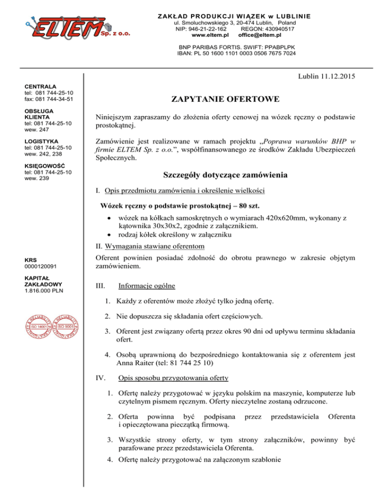 Z AK Ł AD PR O D UK CJ I W I ĄZ E K w L UBL IN I E ul. Smoluchowskiego 3, 20-474 Lublin, Poland NIP: 946-21-22-162 REGON: 430940517 www.eltem.pl [email protected] BNP PARIBAS FORTIS. SWIFT: PPABPLPK IBAN: PL 50 1600 1101 0003 0506 7675 7024 Lublin 11.12.2015 CENTRALA tel: 081 744-25-10 fax: 081 744-34-51 ZAPYTANIE OFERTOWE OBSŁUGA KLIENTA tel: 081 744-25-10 wew. 247 Niniejszym zapraszamy do złożenia oferty cenowej na wózek ręczny o podstawie prostokątnej. LOGISTYKA tel: 081 744-25-10 wew. 242, 238 Zamówienie jest realizowane w ramach projektu „Poprawa warunków BHP w firmie ELTEM Sp. z o.o.”, współfinansowanego ze środków Zakładu Ubezpieczeń Społecznych. KSIĘGOWOŚĆ tel: 081 744-25-10 wew. 239 Szczegóły dotyczące zamówienia I. Opis przedmiotu zamówienia i określenie wielkości Wózek ręczny o podstawie prostokątnej – 80 szt. wózek na kółkach samoskrętnych o wymiarach 420x620mm, wykonany z kątownika 30x30x2, zgodnie z załącznikiem. rodzaj kółek określony w załączniku II. Wymagania stawiane oferentom KRS 0000120091 Oferent powinien posiadać zdolność do obrotu prawnego w zakresie objętym zamówieniem. KAPITAŁ ZAKŁADOWY 1.816.000 PLN III. Informacje ogólne 1. Każdy z oferentów może złożyć tylko jedną ofertę. 2. Nie dopuszcza się składania ofert częściowych. 3. Oferent jest związany ofertą przez okres 90 dni od upływu terminu składania ofert. 4. Osobą uprawnioną do bezpośredniego kontaktowania się z oferentem jest Anna Raiter (tel: 81 744 25 10) IV. Opis sposobu przygotowania oferty 1. Ofertę należy przygotować w języku polskim na maszynie, komputerze lub czytelnym pismem ręcznym. Oferty nieczytelne zostaną odrzucone. 2. Oferta powinna być podpisana i opieczętowana pieczątką firmową. przez przedstawiciela Oferenta 3. Wszystkie strony oferty, w tym strony załączników, powinny być parafowane przez przedstawiciela Oferenta. 4. Ofertę należy przygotować na załączonym szablonie V. Kryteria oceny ofert Przy wyborze oferty Zamawiający będzie się kierował wyłącznie ceną (waga kryterium – 100%). Oceniana będzie cena brutto oferty, przy zastosowaniu następującego algorytmu: Liczba punktów oferty ocenianej = VI. Najniższa cena ---------------------------- × 100 Cena oferty ocenianej Termin i miejsce składania i otwarcia ofert a) Termin i miejsce składania ofert Ofertę należy przesłać (za pośrednictwem Internetu, firmy kurierskiej lub Poczty Polskiej) lub złożyć osobiście w siedzibie Zamawiającego do dnia 18.12.2015, do godz. 15:00. Decydująca jest data wpływu oferty do siedziby Zamawiającego. b) Termin i miejsce otwarcia ofert Otwarcie ofert i wybór wykonawcy zamówienia nastąpi w siedzibie Zamawiającego w dniu 21.12.2015 Z poważaniem Anna Raiter ELTEM Sp. z o.o. ul. Smoluchowskiego 3, 20-474 LUBLIN, POLSKA tel. (+48) 81 744 25 10, fax (+48) 81 7443451 [email protected]; www.eltem.pl Sąd Rejonowy w Lublinie, XI Wydział Gospodarczy KRS, KRS 0000120091, Kapitał zakładowy: 1.816.000 PLN Nr VAT: 9462122162