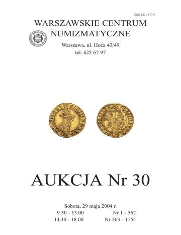 ISSN 1231-577X WARSZAWSKIE CENTRUM NUMIZMATYCZNE Warszawa, ul. Ho˝a 43/49 tel. 625 67 97 AUKCJA Nr 30 Sobota, 29 maja 2004 r. 9.30 - 13.00 Nr 1 - 562 14.30 - 18.00 Nr 563 - 1154 WARSZAWSKIE CENTRUM NUMIZMATYCZNE Warszawa, ul. Ho˝a 43/49 tel. (0-22) 625 67 97 fax. (0-22) 625 69 47 http://www.wcn.pl e-mail: [email protected] AUKCJA Nr 30 Sobota, 29 maja 2004 r. 9.30 - 13.00 Nr 1 - 562 14.30 - 18.00 Nr 563 - 1154 MIEJSCE AUKCJI Hotel Holiday Inn Warszawa, ul. Z∏ota 48 / 54 sale Scherzo i Ballada Przedmioty wystawione na aukcj´ b´dà udost´pnione do oglàdania z chwilà wydania katalogu aukcyjnego w biurze spó∏ki przy ulicy Ho˝ej 43/49 w Warszawie od 4 do 28 maja 2004 r. w godzinach od 10.00 do 18.00. Równie˝ w dniu aukcji w bardzo ograniczonym zakresie od godziny 8.30 w Hotelu Holiday Inn w Warszawie. Tabela stanów zachowania Polska St. Lustrz. Niemcy Polierte Platte (PP) Wielka Brytania Proof I Stempelglanz (Stgl) Uncirculated (Unc) II Vorzüglich (Vzgl) Extremely Fine (EF) III Sehr Schön (SS) Very Fine (VF) IV Schön (S) Fine (F) V Sehr Gut Very Good (VG) Opis przedmiotów, wycena i uk∏ad katalogu: Robert Buczak, Ryszard Kondrat i Jan W´c∏awski Zdj´cia i sk∏ad komputerowy: Marek Kondrat i Daniel Maksymiuk Profesjonalna Gie∏da Numizmatyczna odb´dzie si´ w niedziel´ 30 maja 2004 w budynku Aurum w Warszawie przy ulicy Waliców 11. Z uwagi na ograniczonà iloÊç miejsc uprzejmie prosimy wystawców o wczeÊniejszà rezerwacj´ stolików w naszej firmie. Kolejna 31 aukcja odb´dzie si´ 4.12.2004 r. Przedmioty na aukcj´ przyjmujemy stale w biurze spó∏ki ul. Ho˝a 43/49, Warszawa, w terminie do 30.09.2004 r. Wszelkie prawa zastrze˝one naÊwietlanie i druk: Semafic, Warszawa ul. Borzymowska 28 REGULAMIN AUKCJI Warszawskiego Centrum Numizmatycznego 1. Aukcja odbywa si´ na zlecenie i rachunek w∏aÊcicieli i w imieniu licytujàcych. 2. Warunkiem uczestniczenia w aukcji jest posiadanie katalogu oraz wykupienie numeru licytacyjnego stanowiàcego wadium. WCN mo˝e odstàpiç od ˝àdania wp∏acenia wadium. 3. Fakt przystàpienia do licytacji jest równoznaczny z akceptacjà niniejszego regulaminu. 4. Opisy w katalogu sà podane w dobrej wierze a autentycznoÊç przedmiotów jest zagwarantowana chyba, ˝e stwierdzono i˝ jest inaczej. 5. Ceny w katalogu sà cenami szacunkowymi a licytacja b´dzie si´ zaczynaç o 20% ni˝ej. 6. Udzia∏ w aukcji mo˝na braç równie˝ poprzez z∏o˝enie pisemnej oferty w WCN przes∏anej wraz z kopià dowodu wp∏aty wadium w wysokoÊci 25% ceny szacunkowej, dokonanej na konto WCN. 7. Uczestniczàcy w aukcji jest zobowiàzany po wygraniu przetargu op∏aciç wylicytowany przedmiot w z∏otych obiegowych lub czekiem potwierdzonym z gwarancjà zap∏aty. Klienci znani WCN mogà dokonaç op∏aty w terminie 3 dni od daty zakoƒczenia aukcji. Niedotrzymanie tego terminu spowoduje, ˝e WCN b´dzie pobieraç odsetki za ka˝dy dzieƒ zw∏oki 8. Uczestniczàcy w aukcji b´dà traktowani tak jakby widzieli i studiowali stan przedmiotów. Wszelkie zastrze˝enia dotyczàce okreÊleƒ podanych w katalogu mogà byç przyjmowane przez WCN wy∏àcznie na piÊmie w dniach przeznaczonych na oglàdanie przedmiotów. Z chwilà rozpocz´cia aukcji reklamacje nie b´dà przez WCN uwzgl´dniane. 9. 10. Miejscem rozstrzygania wszelkich sporów jest Sàd Rejonowy dla miasta st. Warszawy. Zakoƒczenie licytacji nast´puje po trzykrotnym wywo∏aniu ceny i jej przybiciu. Do wylicytowanej ceny WCN dolicza 10% op∏aty aukcyjnej. W kwestiach wàtpliwych licytator ma prawo jeszcze raz wywo∏aç cen´. 11. Zezwolenia na wywóz za granic´ nie wymagajà przedmioty niewpisane do rejestru zabytków i majàce nie wi´cej ni˝ 55 lat. Tryb wywozu i zezwoleƒ na wywóz zabytków reguluje ustawa z dnia 23 lipca 2003 "O ochronie zabytków i opiece nad zabytkami". 12. Moc prawnà ma polski tekst regulaminu. 13. Wszelkie nale˝noÊci prosimy wp∏acaç na nasz rachunek: Warszawskie Centrum Numizmatyczne ul. Ho˝a 43/49 00-681 Warszawa Bank Przemys∏owo Handlowy PBK SA IX Oddzia∏/Warszawa 28-10600076-0000401040204335 TERMS OF AUCTION Warsaw Numismatic Centre 1. The auction is conducted on order and for the account of the proprietors and on the behalf of the bidders. 2. Only persons interested in the auction who are in the possession of the catalogue and who payed the registration card, that constitues a deposit, will be admitted. WCN can abandon requirements of deposit payment. 3. Bidding in the auction constitutes full acceptance by the bidder of the foregoing terms of sale. 4. The descriptions in the catalogue are set out in all good faith and authenticity of items is guaranted, if not otherwise stated. 5. Catalogue prices are our estimates, we shall start bidding at prices 20% lower. 6. Written orders are accepted on the condition of paying the deposit of 25% of estimates on the account of WCN. 7. The successful bidders present at the auction are obliged to make their payment immediately in current Polish zlotys or by the secured cheque. Purchaser known to WCN are due to make payment within 3 day after the end of the auction. Payment received after this date will be charged for every day of delay. 8. Bidders will be considerate as having seen the items. Any complains concerning the description of the items will be accepted by WCN only in writing during public viewing of items. 9. 10. The District Court in Warsaw has jurisdiction in the case of any claims. An item will be knocked down after the highest bid has been called out three times. A charge of 10%, payable by the purchaser, will be added on the knock-down price. In the case of any doubts on knocking-down, the item will be called down once more. 11. All objects not older than 55 years and not inscribed to the National Monument Register can be exported. Exportation of other objects is regulated by the Law of 23rd July 2003 "On the protection and tutelage of National Monuments". 12. Only the Polish text has le