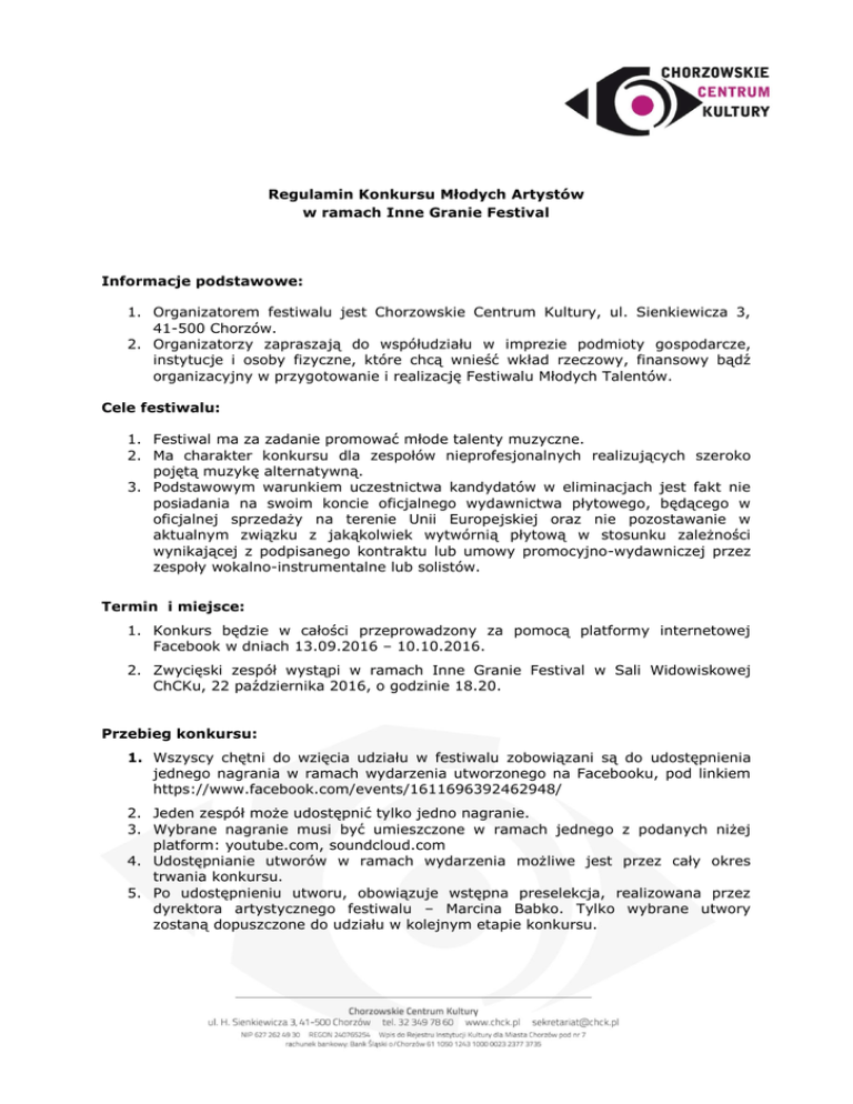 Regulamin Konkursu Młodych Artystów w ramach Inne Granie Festival Informacje podstawowe: 1. Organizatorem festiwalu jest Chorzowskie Centrum Kultury, ul. Sienkiewicza 3, 41-500 Chorzów. 2. Organizatorzy zapraszają do współudziału w imprezie podmioty gospodarcze, instytucje i osoby fizyczne, które chcą wnieść wkład rzeczowy, finansowy bądź organizacyjny w przygotowanie i realizację Festiwalu Młodych Talentów. Cele festiwalu: 1. Festiwal ma za zadanie promować młode talenty muzyczne. 2. Ma charakter konkursu dla zespołów nieprofesjonalnych realizujących szeroko pojętą muzykę alternatywną. 3. Podstawowym warunkiem uczestnictwa kandydatów w eliminacjach jest fakt nie posiadania na swoim koncie oficjalnego wydawnictwa płytowego, będącego w oficjalnej sprzedaży na terenie Unii Europejskiej oraz nie pozostawanie w aktualnym związku z jakąkolwiek wytwórnią płytową w stosunku zależności wynikającej z podpisanego kontraktu lub umowy promocyjno-wydawniczej przez zespoły wokalno-instrumentalne lub solistów. Termin i miejsce: 1. Konkurs będzie w całości przeprowadzony za pomocą platformy internetowej Facebook w dniach 13.09.2016 – 10.10.2016. 2. Zwycięski zespół wystąpi w ramach Inne Granie Festival w Sali Widowiskowej ChCKu, 22 października 2016, o godzinie 18.20. Przebieg konkursu: 1. Wszyscy chętni do wzięcia udziału w festiwalu zobowiązani są do udostępnienia jednego nagrania w ramach wydarzenia utworzonego na Facebooku, pod linkiem https://www.facebook.com/events/1611696392462948/ 2. Jeden zespół może udostępnić tylko jedno nagranie. 3. Wybrane nagranie musi być umieszczone w ramach jednego z podanych niżej platform: youtube.com, soundcloud.com 4. Udostępnianie utworów w ramach wydarzenia możliwe jest przez cały okres trwania konkursu. 5. Po udostępnieniu utworu, obowiązuje wstępna preselekcja, realizowana przez dyrektora artystycznego festiwalu – Marcina Babko. Tylko wybrane utwory zostaną dopuszczone do udziału w kolejnym etapie konkursu. 6. Podstawą zakwalifikowania się wykonawców do konkursu będzie poziom muzyczny i wyraz artystyczny udostępnionych nagrań spójny z wizją Inne Granie Festival. 7. O zwycięstwie zespołu decyduje liczba reakcji użytkowników na nagranie. Będą one punktowane w następujący sposób: - lajk – 1 punkt; - komentarz (pozytywny!) – 2 punkty; - udostępnienie – 3 punkty. 8. Jeden użytkownik może zareagować na nagranie tylko raz, na jeden z wyżej wymienionych sposobów. 9. Reakcje na nagrania podliczone zostaną 10.10.2016 o godzinie 15.00 10. Zespół, który uzyska najwyższą liczbę punktów będzie mógł zaprezentować swój autorski materiał w ramach Inne Granie Festival na Sali Widowiskowej ChCKu o godzinie 18.20. Występ powinien trwać do 20 minut. 11. Zwycięzcy zostaną poinformowani o tym fakcie drogą elektroniczną 11.10.2016 r. Postanowienia organizacyjne: 1. Zwycięzcy przyjeżdżają na własny koszt. 2. Uczestnicy festiwalu przywożą własne instrumenty i procesory, perkusista przywozi własne talerze. 3. Organizator zapewnia sprzęt nagłaśniający; oświetlenie sceniczne; fortepian; możliwość korzystania z CD, MD oraz obsługę techniczną i akustyczną. 4. Nadesłane zgłoszenia upoważniają organizatora festiwalu do samodzielnego wykorzystania przez niego wszystkich materiałów prasowych, radiowych, telewizyjnych i elektronicznych dotyczących zwycięzców konkursu. Tym samym również udzielają oni organizatorowi zezwolenia na korzystanie z wizerunku, jak również z praw autorskich i praw pokrewnych do artystycznych wykonań utworów w mediach, w celu promocji uczestników konkursu. 5. Naruszenie przez wykonawcę postanowień Regulaminu spowoduje wykluczenie go z udziału w konkursie. Decyzję w tej sprawie podejmuje organizator. Decyzja ta nie podlega zaskarżeniu. 6. W przypadku poważnego złamania zasad porządku, prezentowania w konkursie innych utworów niż zgłoszone, udostępnienia cudzego materiału muzycznego na eliminacje, itp. – uczestnik zostanie zdyskwalifikowany. 7. Organizator zastrzega sobie prawo do zmiany terminów i kolejności występów oraz do odwołania imprezy. 8. W czasie trwania imprezy wszelkie wnioski i skargi należy kierować do Biura Organizacyjnego znajdującego się w Chorzowskim Centrum Kultury. 9. Festiwal z przyczyn niezależnych od organizatora może być w dowolnym momencie odwołany. 10. Organizator zastrzega sobie prawo rejestracji audiowizualnej wykonawców do celów archiwalnych i promocyjnych. Postanowienia końcowe: 4. Wszelkie kwestie nie ujęte w regulaminie rozstrzyga organizator. 5. Zgłoszenie do udziału w festiwalu jest równoznaczne z akceptacją niniejszego regulaminu. 6. Udział w konkursie jest równoznaczny ze zgodą na posługiwanie się wizerunkiem oraz przeniesieniem praw autorskich majątkowych w ograniczonym zakresie (w celu posługiwania się utworami w ramach konkursu) do utworów zaprezentowanych w konkursie. 7. Organizator zastrzega sobie prawo do dokonania zmian w niniejszym regulaminie. 8. Regulamin obowiązuje od daty opublikowania go na stronie internetowej www.chck.pl Postanowienia dodatkowe: 1. W sytuacji, gdy członek zespołu nie ukończył 18 lat - zespół przesyła organizatorom pisemną zgodę podpisaną przez wszystkich pozostałych jego członków na jego reprezentowanie oraz pisemną zgodę rodziców lub opiekunów prawnych na wzięcie przez niego udziału w festiwalu.