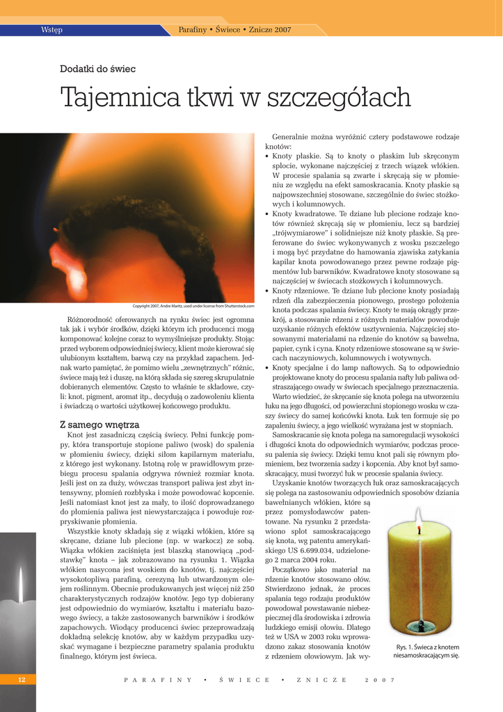 Wstęp Parafiny • Świece • Znicze 2007 Dodatki do świec Tajemnica tkwi w szczegółach Generalnie można wyróżnić cztery podstawowe rodzaje knotów: • Knoty płaskie. Są to knoty o płaskim lub skręconym splocie, wykonane najczęściej z trzech wiązek włókien. W procesie spalania są zwarte i skręcają się w płomieniu ze względu na efekt samoskracania. Knoty płaskie są najpowszechniej stosowane, szczególnie do świec stożkowych i kolumnowych. • Knoty kwadratowe. Te dziane lub plecione rodzaje knotów również skręcają się w płomieniu, lecz są bardziej „trójwymiarowe” i solidniejsze niż knoty płaskie. Są preferowane do świec wykonywanych z wosku pszczelego i mogą być przydatne do hamowania zjawiska zatykania kapilar knota powodowanego przez pewne rodzaje pigmentów lub barwników. Kwadratowe knoty stosowane są najczęściej w świecach stożkowych i kolumnowych. • Knoty rdzeniowe. Te dziane lub plecione knoty posiadają rdzeń dla zabezpieczenia pionowego, prostego położenia knota podczas spalania świecy. Knoty te mają okrągły przekrój, a stosowanie rdzeni z różnych materiałów powoduje uzyskanie różnych efektów usztywnienia. Najczęściej stosowanymi materiałami na rdzenie do knotów są bawełna, papier, cynk i cyna. Knoty rdzeniowe stosowane są w świecach naczyniowych, kolumnowych i wotywnych. • Knoty specjalne i do lamp naftowych. Są to odpowiednio projektowane knoty do procesu spalania nafty lub paliwa odstraszającego owady w świecach specjalnego przeznaczenia. Warto wiedzieć, że skręcanie się knota polega na utworzeniu łuku na jego długości, od powierzchni stopionego wosku w czaszy świecy do samej końcówki knota. Łuk ten formuje się po zapaleniu świecy, a jego wielkość wyrażana jest w stopniach. Samoskracanie się knota polega na samoregulacji wysokości i długości knota do odpowiednich wymiarów, podczas procesu palenia się świecy. Dzięki temu knot pali się równym płomieniem, bez tworzenia sadzy i kopcenia. Aby knot był samoskracający, musi tworzyć łuk w procesie spalania świecy. Uzyskanie knotów tworzących łuk oraz samoskracających się polega na zastosowaniu odpowiednich sposobów dziania bawełnianych włókien, które są przez pomysłodawców patentowane. Na rysunku 2 przedstawiono splot samoskracającego się knota, wg patentu amerykańskiego US 6.699.034, udzielonego 2 marca 2004 roku. Początkowo jako materiał na rdzenie knotów stosowano ołów. Stwierdzono jednak, że proces spalania tego rodzaju produktów powodował powstawanie niebezpiecznej dla środowiska i zdrowia ludzkiego emisji ołowiu. Dlatego też w USA w 2003 roku wprowadzono zakaz stosowania knotów Rys. 1. Świeca z knotem niesamoskracającym się. z rdzeniem ołowiowym. Jak wy- Copyright 2007, Andre Maritz, used under license from Shutterstock.com Różnorodność oferowanych na rynku świec jest ogromna tak jak i wybór środków, dzięki którym ich producenci mogą komponować kolejne coraz to wymyślniejsze produkty. Stojąc przed wyborem odpowiedniej świecy, klient może kierować się ulubionym kształtem, barwą czy na przykład zapachem. Jednak warto pamiętać, że pomimo wielu „zewnętrznych” różnic, świece mają też i duszę, na którą składa się szereg skrupulatnie dobieranych elementów. Często to właśnie te składowe, czyli: knot, pigment, aromat itp., decydują o zadowoleniu klienta i świadczą o wartości użytkowej końcowego produktu. Z samego wnętrza Knot jest zasadniczą częścią świecy. Pełni funkcję pompy, która transportuje stopione paliwo (wosk) do spalenia w płomieniu świecy, dzięki siłom kapilarnym materiału, z którego jest wykonany. Istotną rolę w prawidłowym przebiegu procesu spalania odgrywa również rozmiar knota. Jeśli jest on za duży, wówczas transport paliwa jest zbyt intensywny, płomień rozbłyska i może powodować kopcenie. Jeśli natomiast knot jest za mały, to ilość doprowadzanego do płomienia paliwa jest niewystarczająca i powoduje rozpryskiwanie płomienia. Wszystkie knoty składają się z wiązki włókien, które są skręcane, dziane lub plecione (np. w warkocz) ze sobą. Wiązka włókien zaciśnięta jest blaszką stanowiącą „podstawkę” knota – jak zobrazowano na rysunku 1. Wiązka włókien nasycona jest woskiem do knotów, tj. najczęściej wysokotopliwą parafiną, cerezyną lub utwardzonym olejem roślinnym. Obecnie produkowanych jest więcej niż 250 charakterystycznych rodzajów knotów. Jego typ dobierany jest odpowiednio do wymiarów, kształtu i materiału bazowego świecy, a także zastosowanych barwników i środków zapachowych. Wiodący producenci świec przeprowadzają dokładną selekcję knotów, aby w każdym przypadku uzyskać wymagane i bezpieczne parametry spalania produktu finalnego, którym jest świeca. 12 P A R A F I N Y • Ś W I E C E • Z N I C Z E 2 0 0 7