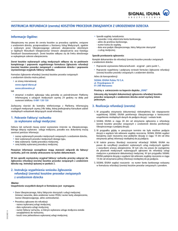 INSTRUKCJA REFUNDACJI (zwrotu) KOSZTÓW PROCEDUR ZWIĄZANYCH Z URODZENIEM DZIECKA Informacje Ogólne: Ubezpieczony ma prawo do zwrotu kosztów za procedury szpitalne, związane z urodzeniem dziecka, przeprowadzone u Dostawcy Usług Medycznych, zgodnie z wybranym przez Ubezpieczającego zakresem ubezpieczenia określonym w Ogólnych Warunkach Ubezpieczenia/ Umowie ubezpieczenia oraz Katalogu Świadczeń Gwarantowanych. Zwrot kosztów odbywa się do limitu określonego w wykupionym zakresie ubezpieczenia. Zwrot kosztów wykonanych usług medycznych odbywa się na podstawie kompletnego i poprawnie wypełnionego formularza Zgłoszenie refundacji (zwrotu) kosztów procedur związanych z urodzeniem dziecka i poprawnie wystawionego oryginału faktury/ rachunku. Formularz Zgłoszenie refundacji (zwrotu) kosztów procedur związanych z urodzeniem dziecka można pobrać: •ze strony internetowej: www.signal-iduna.pl lub www.zdrowotne.pl Sposób przekazania zgłoszenia: Komplet dokumentów do refundacji (zwrotu) kosztów procedur związanych z urodzeniem dziecka: Poprawnie wystawiona faktura/rachunek - oryginał - patrz punkt 1., l Poprawnie wypełniony i podpisany wniosek formularz Zgłoszenie refundacji (zwrotu) kosztów procedur związanych z urodzeniem dziecka. l Adres do korespondencji: SIGNAL IDUNA Polska TU S.A. ul. Przyokopowa 31 01-208 Warszawa Prosimy o umieszczenie na kopercie dopisku „ZORZ” •otrzymać e-mailem zgłaszając taką potrzebę za pośrednictwem Platformy Informacyjnej o usługach medycznych czynnej 24 godziny na dobę pod numerem telefonu: 0-801 120 120 Z alecamy aby komplet dokumentacji zgłoszenia refundacji kosztów procedur związanych z urodzeniem dziecka został wysłany listem poleconym. Zachęcamy również do kontaktu telefonicznego z Platformą Informacyjną o usługach medycznych czynną 24h/ dobę, której profesjonalny Konsultant udzieli niezbędnych wskazówek dotyczących zasad refundacji. 3. Realizacja refundacji (zwrotu) 1. Pobranie Faktury/ rachunku za wykonane usługi medyczne: Faktura lub rachunek muszą zostać wystawione imiennie na Ubezpieczonego, którego dotyczy wykonana usługa medyczna, ponadto ww. dokumenty muszą zawierać poniższe informacje: •nazwy wykonanych procedur medycznych związanych z urodzeniem dziecka, • ilość wykonanych procedur medycznych danego typu, • datę wykonania każdej procedury medycznej, • cenę każdej wykonanej procedury medycznej. Powyższe informacje szczegółowe mogą stanowić załącznik do faktury/ rachunku, jeśli nie zostały umieszczone na tychże dokumentach. W ten sposób wystawiony oryginał faktury/ rachunku prosimy załączyć do Zgłoszenia refundacji (zwrotu) kosztów procedur związanych z urodzeniem dziecka wg. instrukcji opisanej w punkcie 2. 2. Instrukcja wypełnienia wniosku Zgłoszenie refundacji (zwrotu) kosztów procedur związanych z urodzeniem dziecka Ważne: Uzupełnienie wszystkich danych w formularzu jest wymagane. •Dane Ubezpieczonego, który faktycznie skorzystał z usługi medycznej (imiona/ nazwisko, data urodzenia/ numer PESEL/ numer karty ubezpieczenia, nazwa Ubezpieczającego, adres zamieszkania). SIR 02480?.14 •Sposób wypłaty świadczenia: - nazwisko i imię właściciela konta bankowego, - adres do przelewu bankowego, - numer konta do wypłaty, - data oraz podpis Ubezpieczonego, który faktycznie skorzystał z usług medycznej. •Procedury zgłoszone do refundacji: - nazwa wykonanej usługi medycznej, - data wykonania usługi medycznej, - numer faktury/ rachunku, w którym wykonana usługa medyczna została uwzględniona do rozliczenia, - koszt/ cena jednostkowa wykonanej usługi medycznej. 1.W przypadku otrzymania dokumentacji niekompletnej lub niepoprawnie wypełnionej SIGNAL IDUNA poinformuje Ubezpieczonego o konieczności uzupełnienia niezbędnych danych do podjęcia decyzji i wskaże braki. 2.SIGNAL IDUNA w ciągu 30 dni od otrzymania zgłoszenia o refundację (zwrot) kosztów procedur związanych z urodzeniem dziecka poinformuje Ubezpieczonego o podjętej decyzji. 3.W przypadku gdyby w powyższym terminie nie było możliwe podjęcie decyzji o wypłacie lub odmowie wypłaty roszczenia, SIGNAL IDUNA wypłaci bezsporną część roszczenia oraz podejmie decyzję w ciągu 14 dni od dnia otrzymania pełnej informacji niezbędnej do jej podjęcia. 4.W trakcie procesu likwidacji roszczenia/ refundacji/ SIGNAL IDUNA ma prawo do weryfikacji zasadności wykonanych usług medycznych zgodnie z warunkami umowy ubezpieczenia. W tym celu ma prawo do wystąpienia do placówek medycznych wykonujących zgłoszone do refundacji usługi medyczne o przekazanie dokumentacji medycznej. W tym przypadku SIGNAL IDUNA podejmie decyzję o wypłacie lub odmowie wypłaty roszczenia w ciągu 14 dni od otrzymania pełnej informacji niezbędnej do jej podjęcia. 5.SIGNAL IDUNA wypłaci roszczenie na numer konta bankowego wskazany w formularzu refundacji (zwrotu) kosztów procedur związanych z porodem.