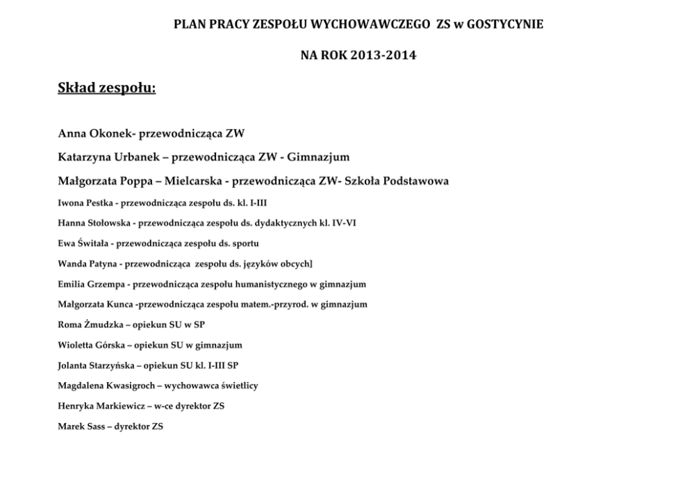PLAN PRACY ZESPOŁU WYCHOWAWCZEGO ZS w GOSTYCYNIE NA ROK 2013-2014 Skład zespołu: Anna Okonek- przewodnicząca ZW Katarzyna Urbanek – przewodnicząca ZW - Gimnazjum Małgorzata Poppa – Mielcarska - przewodnicząca ZW- Szkoła Podstawowa Iwona Pestka - przewodnicząca zespołu ds. kl. I-III Hanna Stołowska - przewodnicząca zespołu ds. dydaktycznych kl. IV-VI Ewa Świtała - przewodnicząca zespołu ds. sportu Wanda Patyna - przewodnicząca zespołu ds. języków obcych] Emilia Grzempa - przewodnicząca zespołu humanistycznego w gimnazjum Małgorzata Kunca -przewodnicząca zespołu matem.-przyrod. w gimnazjum Roma Żmudzka – opiekun SU w SP Wioletta Górska – opiekun SU w gimnazjum Jolanta Starzyńska – opiekun SU kl. I-III SP Magdalena Kwasigroch – wychowawca świetlicy Henryka Markiewicz – w-ce dyrektor ZS Marek Sass – dyrektor ZS Nazwa zadania Formy i sposoby realizacji odpowiedzialni przewodniczący 1.Opracowanie planu pracy zespołu termin realizacji 5.IX.2013 ZW, członkowie 2.Monitorowanie realizacji i przewodniczący 1 x w semestrze ewaluowanie planu pracy zespołu. - organizowanie spotkań mających na celu pedagogizację rodziców: * „ZagroŜenia Internetu i umiejętne korzystanie z komputera przez dzieci.” pedagog A. wraz z omówieniem ankiety z wiosny Okonek, n-el informatyki 2013 M. Pałka, Ł. Jutrowski * „Jak odczytywać opinie PPP” 3.Wspieranie rodziców i nauczycieli pedagog szkolny, pedagog, psycholog PPP w Tucholi II zebranie z rodzicami zebranie z rodzicami w II semestrze w rozwiązywaniu problemów wychowawczych. - zaangaŜowanie rodziców w prace na rzecz szkoły i klasy, współpraca wychowawców z Radą Rodziców - udzielanie porad i konsultacji, kontynuacja istnienia podczas dni otwartych punktu konsultacyjnego dla rodziców. - zapoznanie rodziców z wynikami „Diagnozy lokalnych zagroŜeń społecznych” wychowawcy cały rok wg pracownicy PPP z harmonogramu Tucholi, pedagog dni otwartych i szkolny wywiadówek dyrektor zebranie z rodzicami uwagi 4. Ewaluacja tematyki zajęć wychowawczych. 5. Kształtowanie u uczniów i rodziców umiejętności rozwiązywania trudności i podejmowania właściwych decyzji 6. Analiza sytuacji wychowawczej i edukacyjnej uczniów ( na podstawie wypełnionych przez rodziców kart informacyjnych, sondaŜu dla wychowawców, wywiadów, analizy dzienników. - opracowanie informacji\ ulotek dla rodziców na waŜne tematy (dopalacze, grooming ) pedagog, zainteresowani nauczyciele - pomoc rodzinom mającym trudności wychowawcze i materialne wychowawcy, pedagog, GOPS - zachęcanie uczniów do korzystania z zaleconych form pomocy psych.pedag. oraz rodziców do współpracy ze szkołą w celu niwelowania niepowodzeń szkolnych i zagroŜeń niedostosowaniem społecznym. nauczyciele, wychowawcy, pedagog - współpraca wychowawców na róŜnych poziomach edukacyjnych wychowawcy I semestr do końca X.2013 -realizacja programu profilaktycznego i wychowawczego szkoły wychowawcy, nauczyciele cały rok - przeprowadzanie zajęć z zakresu asertywnej odmowy wychowawcy, pedagog - organizacja we współpracy z policją i straŜą gminną zajęć dla uczniów i rodziców na temat odpowiedzialności karnej, zagroŜeń Internetu. policja, straŜ gminna, pedagog, nauczyciele informatyki - analiza postępów uczniów w nauce wychowawcy, nauczyciele - kontrola frekwencji uczniów wychowawcy, nauczyciele - kwalifikowanie uczniów do form pomocy psych.-pedag. wychowawcy, n-le, pedagog IX, wg potrzeb - gromadzenie informacji na temat sytuacji rodzinnej ucznia, uczniów zagroŜonych i niedostosowanych wychowawcy, pedagog cały rok przed zebraniami z rodzicami wg potrzeb cały rok na godz. z wychowawcą wg harmonogramu cały rok cały rok Wprowadzenie zapisu do WSO na RP w dn. 12.09.2013 społecznie 7. Kształtowanie wśród uczniów prawidłowych postaw społecznych. 8. Wspieranie uzdolnień uczniów - współpraca z sądem rodzinnym i policją, GOPS w zakresie rozwiązywania sytuacji trudnych wychowawcy, pedagog - zapoznanie uczniów z prawami i obowiązkami na naradach klasowych wychowawcy - organizacja Ŝycia kulturalnego w szkole , SU - organizacja czasu wolnego, planowanie zajęć pozalekcyjnych SU, wych-cy, n-le, ZHP, GOK i inne organizacje - organizowanie konkursów szkolnych oraz motywowanie uczniów do udziały w konkursach międzyszkolnych i ogólnopolskich nauczyciele przedmiotów - wystąpienie do Rady Gminy z wnioskiem o utworzenie funduszu stypendialnego dla uczniów wyróŜniających się z bardzo dobrymi wynikami w nauce - kwalifikowanie uczniów do uzyskania stypendiów i nagród - planowanie i organizowanie kół zainteresowań Zatwierdzono: cały rok IX cały rok dyrektor wychowawcy, RP IX/ X cały rok I semestr koniec I i II semestru nauczyciele IX podpisy przewodniczących ZW: Aby poprawić frekwencje uczniów gimnazjum na zajęciach dyd. -wyrów. z j. polskiego i matematyki oraz na zalecanych konsultacjach z nauczycielami innych przedmiotów proponuje się: 1. uświadomić rodziców o konieczności uczestnictwa dzieci w zajęciach i konsultacjach (aby podkreślić wagę całego problemu proponujemy, aby zrobił to p. dyrektor na zebraniu ogólnym dn. 12, 13.09.2013); 2. za obecność na zajęciach dyd.-wyrów. lub konsultacjach i aktywny w nich udział nauczyciel prowadzący odnotowuje w dzienniku zajęć +, za pięć + uczeń otrzymuje oceną cząstkową bdb z przedmiotu, prowadzący ma za zadanie wpisanie oceny cząstkowej do dziennika klasowego; 3. w przypadku nie uczestniczenia przez ucznia w zajęciach dyd.-wyrów., konsultacjach i braku pracy nad trudnościami, nauczyciele mają prawo nie dostosowywania wymagań edukacyjnych w kwestii oceny z przedmiotu.