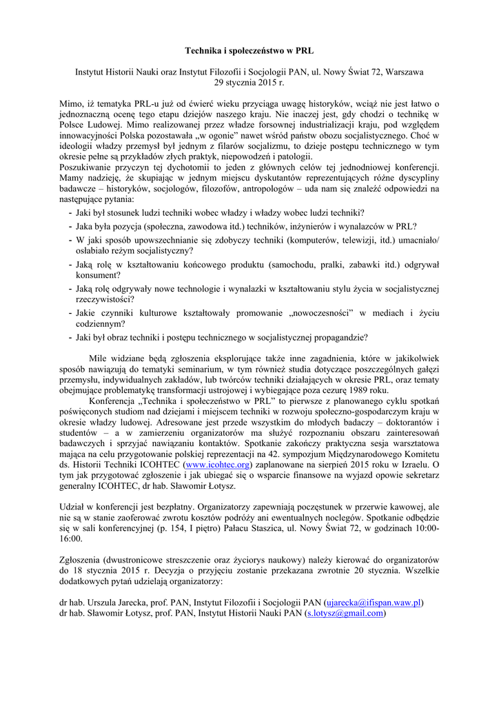 Technika i społeczeństwo w PRL Instytut Historii Nauki oraz Instytut Filozofii i Socjologii PAN, ul. Nowy Świat 72, Warszawa 29 stycznia 2015 r. - - - Mimo, iż tematyka PRL-u już od ćwierć wieku przyciąga uwagę historyków, wciąż nie jest łatwo o jednoznaczną ocenę tego etapu dziejów naszego kraju. Nie inaczej jest, gdy chodzi o technikę w Polsce Ludowej. Mimo realizowanej przez władze forsownej industrializacji kraju, pod względem innowacyjności Polska pozostawała „w ogonie” nawet wśród państw obozu socjalistycznego. Choć w ideologii władzy przemysł był jednym z filarów socjalizmu, to dzieje postępu technicznego w tym okresie pełne są przykładów złych praktyk, niepowodzeń i patologii. Poszukiwanie przyczyn tej dychotomii to jeden z głównych celów tej jednodniowej konferencji. Mamy nadzieję, że skupiając w jednym miejscu dyskutantów reprezentujących różne dyscypliny badawcze – historyków, socjologów, filozofów, antropologów – uda nam się znaleźć odpowiedzi na następujące pytania: Jaki był stosunek ludzi techniki wobec władzy i władzy wobec ludzi techniki? Jaka była pozycja (społeczna, zawodowa itd.) techników, inżynierów i wynalazców w PRL? W jaki sposób upowszechnianie się zdobyczy techniki (komputerów, telewizji, itd.) umacniało/ osłabiało reżym socjalistyczny? Jaką rolę w kształtowaniu końcowego produktu (samochodu, pralki, zabawki itd.) odgrywał konsument? Jaką rolę odgrywały nowe technologie i wynalazki w kształtowaniu stylu życia w socjalistycznej rzeczywistości? Jakie czynniki kulturowe kształtowały promowanie „nowoczesności” w mediach i życiu codziennym? Jaki był obraz techniki i postępu technicznego w socjalistycznej propagandzie? - - - - Mile widziane będą zgłoszenia eksplorujące także inne zagadnienia, które w jakikolwiek sposób nawiązują do tematyki seminarium, w tym również studia dotyczące poszczególnych gałęzi przemysłu, indywidualnych zakładów, lub twórców techniki działających w okresie PRL, oraz tematy obejmujące problematykę transformacji ustrojowej i wybiegające poza cezurę 1989 roku. Konferencja „Technika i społeczeństwo w PRL” to pierwsze z planowanego cyklu spotkań poświęconych studiom nad dziejami i miejscem techniki w rozwoju społeczno-gospodarczym kraju w okresie władzy ludowej. Adresowane jest przede wszystkim do młodych badaczy – doktorantów i studentów – a w zamierzeniu organizatorów ma służyć rozpoznaniu obszaru zainteresowań badawczych i sprzyjać nawiązaniu kontaktów. Spotkanie zakończy praktyczna sesja warsztatowa mająca na celu przygotowanie polskiej reprezentacji na 42. sympozjum Międzynarodowego Komitetu ds. Historii Techniki ICOHTEC (www.icohtec.org) zaplanowane na sierpień 2015 roku w Izraelu. O tym jak przygotować zgłoszenie i jak ubiegać się o wsparcie finansowe na wyjazd opowie sekretarz generalny ICOHTEC, dr hab. Sławomir Łotysz. Udział w konferencji jest bezpłatny. Organizatorzy zapewniają poczęstunek w przerwie kawowej, ale nie są w stanie zaoferować zwrotu kosztów podróży ani ewentualnych noclegów. Spotkanie odbędzie się w sali konferencyjnej (p. 154, I piętro) Pałacu Staszica, ul. Nowy Świat 72, w godzinach 10:0016:00. Zgłoszenia (dwustronicowe streszczenie oraz życiorys naukowy) należy kierować do organizatorów do 18 stycznia 2015 r. Decyzja o przyjęciu zostanie przekazana zwrotnie 20 stycznia. Wszelkie dodatkowych pytań udzielają organizatorzy: dr hab. Urszula Jarecka, prof. PAN, Instytut Filozofii i Socjologii PAN ([email protected]) dr hab. Sławomir Łotysz, prof. PAN, Instytut Historii Nauki PAN ([email protected])