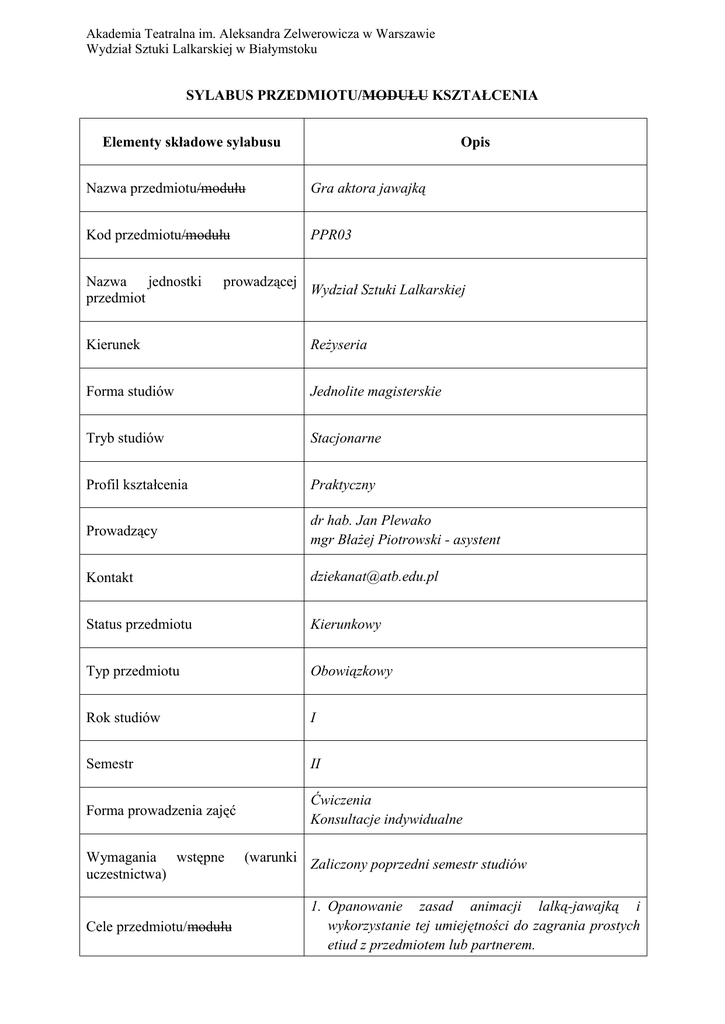 Akademia Teatralna im. Aleksandra Zelwerowicza w Warszawie Wydział Sztuki Lalkarskiej w Białymstoku SYLABUS PRZEDMIOTU/MODUŁU KSZTAŁCENIA Elementy składowe sylabusu Opis Nazwa przedmiotu/modułu Gra aktora jawajką Kod przedmiotu/modułu PPR03 Nazwa jednostki przedmiot Wydział Sztuki Lalkarskiej prowadzącej Kierunek Reżyseria Forma studiów Jednolite magisterskie Tryb studiów Stacjonarne Profil kształcenia Praktyczny Prowadzący dr hab. Jan Plewako mgr Błażej Piotrowski - asystent Kontakt [email protected] Status przedmiotu Kierunkowy Typ przedmiotu Obowiązkowy Rok studiów I Semestr II Forma prowadzenia zajęć Ćwiczenia Konsultacje indywidualne Wymagania wstępne uczestnictwa) Cele przedmiotu/modułu (warunki Zaliczony poprzedni semestr studiów 1. Opanowanie zasad animacji lalką-jawajką i wykorzystanie tej umiejętności do zagrania prostych etiud z przedmiotem lub partnerem. Akademia Teatralna im. Aleksandra Zelwerowicza w Warszawie Wydział Sztuki Lalkarskiej w Białymstoku Treści kształcenia Efekty kształcenia 2. Zrozumienie i wykorzystanie predyspozycji scenicznych jawajki. 3. Trening lalkarski, eliminowanie błędów techniki animacji i pogłębianie umiejętności gry lalkąjawajką. Prezentacja lalki-jawajki (od teatru indonezyjskiego do współczesności); omówienie budowy (konstrukcji) i sprawności technicznej lalki-jawajki (na bazie „lalki ćwiczebnej); wyeksponowanie relacji lalkarz-lalka; zadania aktorskie z lalką-jawajką bez tekstu; realizacja etiudy aktorskiej z lalką-jawajką. W zakresie wiedzy (W) student: rozumie i zna zasady funkcjonowania i sceniczne możliwości jawajki (R_W10); zna repertuar, w którym może zastosować grę jawajką (R_W1); dysponuje poszerzoną wiedzą na temat kontekstu historycznego i kulturowego gry aktora jawajką i jej związków z innymi dziedzinami sztuki (R_W3); ma szeroką orientację w zakresie budowy oraz różnorodności i odmienności form stosowanych w teatrze lalek (R_W6); W zakresie umiejętności (U) student: posiada umiejętność świadomego posługiwania się techniką jawajki dla wyrażania myśli i emocji postaci scenicznej (R_U3); jest przygotowany do współdziałania i współpracy z innymi osobami w ramach prac zespołowych; docenia rolę partnera na scenie (R_U6); zdobył umiejętności tworzenia w sposób umożliwiający odejście od zapisanego tekstu/scenariusza (R_U13); W zakresie kompetencji społecznych (K) student: podejmuje samodzielne, niezależne decyzje, (R_K1); weryfikuje popełniane błędy (R_K4) pracuje w zespole, przestrzega ustalonych zasad, rozumie pojęcie odpowiedzialności za proces tworzenia (R_K6). Forma zaliczenia przedmiotu II sem. - Zaliczenie z oceną Sposoby weryfikacji Ocena aktywności w trakcie wykonywanych na zajęciach i zajęć, ocena przygotowanych Akademia Teatralna im. Aleksandra Zelwerowicza w Warszawie Wydział Sztuki Lalkarskiej w Białymstoku samodzielnie ćwiczeń, ocena efektów pracy zespołowej, egzamin praktyczny - pokaz etiud z lalką- jawajką przed komisją egzaminacyjną. Liczba godzin zajęć dydaktycznych 60 godz. Liczba punktów ECTS 1 pkt. Język wykładowy Język polski Wykaz literatury podstawowej Wykaz literatury uzupełniającej Uwagi 1. H. Ryl, Warsztat teatru lalek, w: praca zbiorowa Teatr lalek. Zagadnienia metodyczne, COMUK, Warszawa 1979; 2. H. Jurkowski, Dzieje teatru lalek, PIW Warszawa 1970; 1. Obrazcow S., Moja profesja, Wydawnictwo Literackie, Kraków 1961 2. St. Szuman, O sztuce i wychowaniu estetycznym, PZWS, Warszawa 1969 Praca w semestrze III i IV tj. propozycje wyboru tekstów dramatycznych - w zależności od uzyskanych efektów po I semestrze pracy. Akademia Teatralna im. Aleksandra Zelwerowicza w Warszawie Wydział Sztuki Lalkarskiej w Białymstoku SYLABUS PRZEDMIOTU /MODUŁU KSZTAŁCENIA Elementy składowe sylabusu Opis Nazwa przedmiotu/modułu Gra aktora jawajką Kod przedmiotu PPR03Ww Nazwa jednostki prowadzącej przedmiot Wydział Sztuki Lalkarskiej Kierunek Reżyseria Forma studiów (Stopień) Jednolite magisterskie Tryb Stacjonarne Profil kształcenia Praktyczny Prowadzący dr hab. Artur Dwulit mgr Łucja Grzeszczyk - asystent Kontakt [email protected] Status przedmiotu Podstawowy Wolnego wyboru Typ przedmiotu Limit osób: 2 Rok studiów II Semestr III, IV Forma prowadzenia zajęć Wymagania uczestnictwa) wstępne Cele przedmiotu/modułu ćwiczenia warsztatowe (warunki Zaliczone poprzednie semestry studiów; zgłoszenie chęci uczestnictwa w zajęciach Umiejętność animacji ćwiczebną formą jawajki Umiejętność łączenia animacji jawajki z dramatycznym tekstem Akademia Teatralna im. Aleksandra Zelwerowicza w Warszawie Wydział Sztuki Lalkarskiej w Białymstoku Treści kształcenia Umiejętność budowania elementarnych etiud aktorskich z użyciem jawajki Umiejętność budowania zdarzenia scenicznego, prowadzenia aktora i egzekwowania zadań aktorskich Semestr III 1. repetytorium teoretyczne i praktyczne 2. omówienie i przyporządkowanie tekstu dramatycznego 3. analiza tematu 4. określenie emocji, uczuć postaci scenicznych, atmosfery sceny, budowanie konfliktów postaci etc. 5. ćwiczenia praktyczne z użyciem lalek ćwiczebnych 6. przygotowanie programu egzaminacyjnego Semestr IV 1. omówienie i przyporządkowanie tekstu dramatycznego 2. analiza tematu 3. określenie emocji, uczuć postaci scenicznych, atmosfery sceny, budowanie konfliktów postaci etc. 4. ćwiczenia praktyczne z użyciem lalek ćwiczebnych 5. przygotowanie programu egzaminacyjnego W zakresie wiedzy (W) student: 1. orientuje się w repertuarze odpowiadającym poetyce gry jawajką (R_W1) Efekty kształcenia W zakresie umiejętności (U) student: 1. potrafi zastosować wiedzę praktyczną i teoretyczną w sytuacjach typowych i nietypowych w procesie budowania dzieła teatralnego z użyciem jawajki jako formy wyrazu postaci scenicznej (R_U3) 2. posiada umiejętność analizowania sytuacji dramatycznych (R_U2) 3. potrafi dokonać syntezy ś