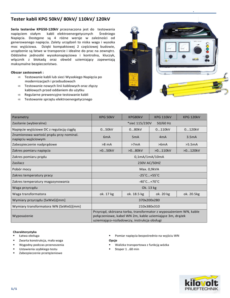 . Tester kabli KPG 50kV/ 80kV/ 110kV/ 120kV Seria testerów KPG50-120kV przeznaczona jest do testowania napięciem stałym kabli elektroenergetycznych Średniego Napięcia. Dostępne są 4 różne wersje w zależności od generowanego napięcia. Zalety urządzeń to niska waga i wysoka moc wyjściowa. Dzięki kompaktowej 2 częściowej budowie, urządzenie są łatwe w transporcie i idealne do prac na zewnątrz. Oddzielne jednostki wysokonapięciowa i kontrolna, kluczyk, włącznik z blokadą oraz obwód uziemiający zapewniają maksymalne bezpieczeństwo. Obszar zastosowań : • Testowanie kabli lub sieci Wysokiego Napięcia po modernizacjach i przebudowach • Testowanie nowych linii kablowych oraz złączy kablowych przed oddaniem do użytku • Regularne prewencyjne testowanie kabli • Testowanie sprzętu elektroenergetycznego Parametry KPG 50kV Zasilanie (wybieralne) Napięcie wyjściowe DC z regulacją ciągłą Znamionowa wartość prądu przy nominal. napięciu wyjściowym Zabezpieczenie nadprądowe Zakres pomiaru napięcia KPG80kV KPG 110kV *sieć 115/230V 50/60 Hz 0...50kV 0...80kV 0...110kV 0...120kV 6mA 5mA 4mA 3.5mA >8 mA >7mA >6mA >5.5mA >0...50kV >0...80kV >0...110kV >0...120kV Zakres pomiaru prądu 0,1mA/1mA/10mA Zasilacz 230V AC/50HZ Pobór mocy Max. 0,9kVA Zakres temperatury pracy -25˚C...+55˚C Zakres temperatury magazynowania -40˚C...+70˚C Waga przyrządu Waga transformatora Ok. 13 kg ok. 17 kg ok. 18.5 kg ok. 20 kg Wymiary przyrządu (SxWxG)[mm] 370x200x280 Wymiary transformatora WN (SxWxG)[mm] 210x380x310 Wyposażenie Charakterystyka Łatwa obsługa Zwarta konstrukcja, mała waga Wygodny podczas przenoszenia Ustawienia szybkiego testu Zabezpieczenie przetężeniowe 1/1 KPG 120kV ok. 20.5kg Przyrząd, skórzana torba, transformator z wyposażeniem WN, kable połączeniowe, kabel WN 2m, kable uziemiające 3m, drążek uziemiająco-rozładowczy, instrukcja obsługi Pomiar napięcia bezpośrednio na wyjściu WN Opcje Walizka transportowa z funkcją wózka Stoper 1 ..60 min