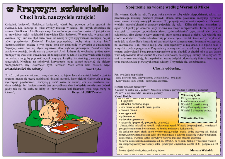 W krzywym zwierciadle Chęci brak, nauczyciele ratujcie! Kwiecień, kwiecień. Nadchodzi kwiecień, jednak bez powodu byśmy gazetki nie wydawali. Dla każdego to tylko zwykły miesiąc w szkole, dla innych zbliżająca się wiosna i Wielkanoc. Ale dla najstarszych uczniów w podstawówce kwiecień jest jak czas na prawdziwe męki- nadchodzi Sprawdzian Klas Szóstych. W tym roku wypada on 1 kwietnia, czyli nie ma zbyt dużo czasu na naukę w tym zgrywuśnym miesiącu, bo jak mówi przysłowie- „Kwiecień Plecień poprzeplata, trochę zimy, trochę lata.” Przeprowadziłem ankietę o tym czego boją się uczniowie w związku z egzaminem. Najwięcej osób boi się złych wyników albo wyboru gimnazjum. Ponadprzeciętni uczniowie uważają, że nie ma się czego bać. A ci , którym nie wychodzą próbne testy, próbują winę zwalić na innych, tak jak to napisałem w tytule. Na przerwach lenie biegają po boisku, a mogliby poprawić wyniki czytając książkę. Zamiast tego, zwalają winę na nauczycieli. Niedługo na szkolnych korytarzach mogą zacząć pojawiać się plakaty propagandowe, aby „nawrócić” tych uczniów. Mało czasu nam zostało, więc: szóstoklasiści do roboty! Daniel Łyba No cóż, już prawie wiosna... wszystko dobrze, fajnie, lecz dla szóstoklasistów jest to pogrom, muszą się uczyć godzinami, dniami, nocami. Istne piekło! Niektórych ta praca wyczerpuje psychicznie i zaczynają tracić wiarę w siebie, lecz nie martwcie się! Mam nadzieję, że 1 kwietnia to nie jest przypadkowa data i to będzie zwykły żart. Jednak gdyby tak się nie stało, to jakby to powiedziała Pani Hakman:” ręka noga mózg na ścianie”, . Krzysztof „Bill”Zaucha Spojrzenie na wiosnę według Weroniki Mikoś Eh, wiosna. Każdy ją lubi. Ta pora roku niesie ze sobą wiele niespodzianek, takich jak przebiśniegi, krokusy, pierwsze promyki słońca, które powolutku zaczynają ogrzewać nam twarze. Kwiaty rosną jak szalone. No, przynajmniej w moim ogrodzie. Na moim wielkim orzechu(chodzi o drzewo) pojawiają się pąki. Kilka dni temu znalazłam w ogrodzie łupinkę po orzechu, więc wiosna ma swoje niespodzianki. Teraz, kiedy ktoś wyczytał z mojego opowiadania słowo ,,niespodzianka" ,spodziewał się deszczu cukierków, albo chmur z waty cukrowej, które zaczną spadać z nieba. Ale wiośnie nie chodzi o słodycze. Chodzi o budzące się po zimie życie. No tak, teraz każdy przyleci do mnie jak na skrzydłach i zacznie mi zatruwać życie komentarzami, że natura jest zepsuta, bo zaśmiecona. Tak, macie rację. Ale jeśli będziemy o nią dbać, nie będzie taka a wszystkim będzie przyjemnie. Przyroda się ucieszy się, że o nią dbamy . Ale wracając do tematu, zadowoleni? Teraz pewnie zapytacie o co mi chodzi? A chodzi mi o to czy dałam wam odpowiednią ilość tekstu? Wy mole książkowe, co czytają i którzy lubią czytać? W taki razie mam nadzieję, że zaspokoiłam wasze żołądki odpowiednią ilością literatury. A teraz marsz, szukać pierwszych oznak wiosny. Trzymajcie się, do zobaczenia!!! Chwila oddechu… Pani pyta Jasia na polskim: - Jasiu powiedz nam, kiedy piszemy wielkie litery?- pyta pani. - Kiedy mamy słaby wzrok.- odpowiada chłopiec. Kobieta mówi do mężczyzny: -Czekam na ciebie już 2 godziny. Naucz się wreszcie przychodzić o ustalonej godzinie! -Po co? Ty się nauczyłaś i czekasz 2 godziny. Kamil Hołub Wiosenny Quiz Kiedy zaczyna się - 1 kg jabłek kalendarzowa wiosna? - szklanka pszennej mąki Wymień 3 oznaki wiosny - trzy czwarte szklanki cukru pudru Kiedy Kończy się wiosna? - połowa masła Wymień 3 wiosenne kwiaty. - szczypta soli - łyżka miodu Wiktoria Alechno - łyżeczka cynamonu - naczynie i papier do pieczenia, ostry nóż Umyte jabłka pokroić na kawałki wykrawając pestki. Wrzucić do sporej miski, wymieszać, posypać cynamonem i wymieszać, na koniec zmieszać z łyżką miodu. Na deskę lub spory, płaski talerz wyłożyć mąkę, cukier i masło, dodać szczyptę soli. Siekać nożem, aż powstaną maślane kulki obtoczone mąką z cukrem. Naczynie wyłożyć papierem do pieczenia, wysypać jabłka i przykryć warstwą maślano-mączno-cukrzaną. Wstawić do piekarnika nagrzanego od ok. 160 st. C na 45 min. Jeśli po tym czasie wierzch nie jest przypieczony na złocisty kolor - podkręcić temperaturę do 210 st. C i podpiec ok. 10 min. Można zjadać ciepłe, dodając kulkę lodów. Mateusz Woźniak