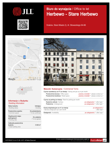 Biuro do wynajęcia / Office to let Herbewo - Stare Herbewo Kraków, Stare Miasto (I), Al. Słowackiego 64-66 Warunki Komercyjne / Commercial Terms Czynsz wywoławczy za m² za miesiąc / Asking rent per sq m per month Powierzchnia biurowa / Office space prosimy o kontakt * / please contact us * Powierzchnia handlowa / Retail space prosimy o kontakt * / please contact us * Czynsz za parking za miesiąc / Rent for parking per month Naziemne odkryte / Surface Podziemne / Underground Informacje o Budynku / Building Information Status budynku / Building status Powierzchnia wspólna / Common space Współczynnik miejsc parkingowych / Parking ratio Całkowita powierzchnia budynku / Total building area Istniejący / Existing Do potwierdzenia / To be confirmed po zalogowaniu * / after login * po zalogowaniu * / after login * Koszty eksploatacyjne za m² za miesiąc / Service charge per sq m per month Dostępność / Availability po zalogowaniu * / after login * po zalogowaniu * / after login * Do ustalenia / To be agreed 5 000 m² COPYRIGHT © JLL IP, INC. 2017. All Rights Reserved W celu uzyskania dodatkowych informacji prosimy wejdź na For more information please click Standardowe Wykończenie / Standard Fit-Out Typowy Plan Piętra / Typical Floor Plan Klimatyzacja / Air conditioning Podnoszone podłogi / Raised floor Podwieszany sufit / Suspended ceiling Okablowanie telefoniczne (opcja) / Telephone cabling (option) Okablowanie komputerowe (opcja) / Computer cabling (option) Okablowanie elektryczne (opcja) / Power cabling (option) Tryskacze / Sprinklers Czujniki dymu / Smoke detectors Wykładzina / Carpeting Podział powierzchni ściankami / Wall partitioning Recepcja / Reception Ochrona budynku / Security Kable światłowodowe / Fiber optics Kontrola dostępu do budynku / Access control Uchylne okna / Openable windows Dwustronne zasilanie / Emergency power supply BMS / BMS W celu uzyskania dodatkowych informacji lub zorganizowania spotkania prosimy o kontakt: / For more information or to arrange a viewing please contact: +48 12 294 94 30 Niniejsze warunki mają charakter wyłącznie informacyjny i nie stanowią części wiążącej oferty lub umowy. / The Property Particulars are for information purposes only and do not form any part of binding offer or contract. COPYRIGHT © JLL IP, INC. 2017. All Rights Reserved W celu uzyskania dodatkowych informacji prosimy wejdź na For more information please click
