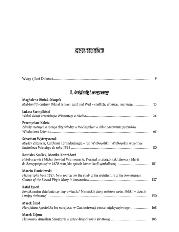 SPIS TREŚCI Wstęp (Józef Dobosz) ....................................................................................................... 9 I. Artykuły i rozprawy Magdalena Biniaś-Szkopek Mid-twelfth-century Poland between East and West – conflicts, alliances, marriages................ 15 Łukasz Szempliński Wokół elekcji arcybiskupa Wincentego z Niałka ................................................................... 36 Przemysław Kaleta Zdrady możnych a rotacja elity władzy w Wielkopolsce w dobie panowania potomków Władysława Odonica ........................................................................................................ 63 Sebastian Wytrzyszczak Między Zakonem, Czechami i Brandenburgią – rola Wielkopolski i Wielkopolan w polityce Kazimierza Wielkiego do roku 1345 ................................................................................... 80 Rostislav Smíšek, Monika Konrádová Habsburgowie i Michał Korybut Wiśniowiecki. Przyjazd arcyksiężniczki Eleonory Marii do Rzeczypospolitej w 1670 roku jako sposób komunikacji symbolicznej ................................. 101 Marcin Danielewski Photographs from 1887. New sources for the study of the architecture of the Romanesque Church of the Blessed Virgin Mary in Inowrocław .............................................................. 137 Rafał Łysoń Konsekwentne działania czy improwizacja? Niemieckie plany wojenne wobec Polski w okresie I wojny światowej ............................................................................................................ 150 Marek Šmíd Nuncjatura Apostolska bez nuncjusza w Czechosłowacji okresu międzywojennego ................... 168 Marek Żejmo Planowany Anschluss Szwajcarii w czasie drugiej wojny światowej ....................................... 185 4 SPIS TREŚCI Maciej Bugajewski Między empirią i teorią. O metodologicznej dyskusji historyków, siedemdziesiąt lat później...... 210 Tomasz Kowalczyk Znaczenie podstawowych zasad prawa wyborczego w Polskiej Rzeczpospolitej Ludowej a III Rzeczpospolitej Polskiej .............................................................................................. 225 II. Polemiki i recenzje A. Polemiki Edward Skibiński Analiza źródeł jako (niezbywalna) podstawa warsztatu historyka. Na marginesie pracy Błażeja Śliwińskiego o pierworodnym synu pierwszego króla Polski ....................................... 250 B. Recenzje Roman Baron Ambasadorowie wzajemnego porozumienia. Niedocenieni twórcy pomostów między polską i czeską kulturą (XIX-XX w.). Studia i szkice, Wydawnictwo Adam Marszałek, Toruń 2013 (Damian Szymczak) .............................................................................................................. 269 Robert Luft Parlamentarische Führungsgruppen und politische Strukturen in der tschechischen Gesellschaft, Bd. 1: Tschechische Abgeordnete und Parteien des österreichischen Reichsrats 1907–1914, Oldenbourg Verlag, München 2012; Robert Luft, Parlamentarische Führungsgruppen und politische Strukturen in der tschechischen Gesellschaft, Bd. 2: Biographisches Handbuch, Oldenbourg Verlag, München 2012 (Pavel Cibulka) ........................................................... 274 Krzysztof Sawicki Obwód Kaliningradzki FR w ładzie międzynarodowym, Dom Wydawniczy Duet, Toruń 2013 (Marek Żejmo)...................................................................................................................... 278 III. Sprawozdania i komunikaty Sprawozdanie z konferencji naukowej pt. Chrystianizacja Europy. Kościół na przełomie I i II tysiąclecia, Poznań, 25-26 września 2014 r. (Marcin Danielewski) ................................ 286 Sprawozdanie z konferencji naukowej pt. Tradycje i nowoczesność – początki państwa polskiego na tle środkowoeuropejskim w badaniach interdyscyplinarnych, Poznań, 10-12 czerwca 2015 r. (Jakub Wojtczak) .................................................................................................................. 289 Wykaz skrótów ...................................................................................................................... 293 Informacje dla autorów ......................................................................................................... 295 OBSAH Úvod (Józef Dobosz) ....................................................................................................... 11 I. Články a studie Magdalena Biniaś-Szkopek Mid-twelfth-century Poland between East and West – conflicts, alliances, marriages................ 15 Łukasz Szempliński K volbě arcibiskupa Wincentyho z Niałka ........................................................................... 36 Przemysław Kaleta Zrady předáků a rotace elity moci ve Velkopolsku v době panování potomků Vladislava Odonice ... 63 Sebastian Wytrzyszczak Mezi Řádem německých rytířů, českým královstvím a Braniborskem – role Velkopolska a Velkopolanů v politice Kazimíra III. Velikého do roku 1345 .................................................... 80 Rostislav Smíšek, Monika Konrádová Habsburgové a Michał Korybut Wiśniowiecki. Příjezd arcivévodkyně Eleonory Marie Josefy Habsburské do Polska v roce 1670 jako způsob symbolické komunikace .................................. 101 Marcin Danielewski Photographs from 1887. New sources for the study of the architecture of the Romanesque Church of the Blessed Virgin Mary in Inowrocław .............................................................. 137 Rafał Łysoń Důslednost nebo improvizace? Německé válečné plány proti Polsku v období 1. světové války .... 150 Marek Šmíd Apoštolská nunciatura bez nuncia v Československu za meziválečného období......................... 168 Marek Żejmo Plánovaný anšlus Švýcarska v době druhé světové války ........................................................... 185 6 OBSAH
