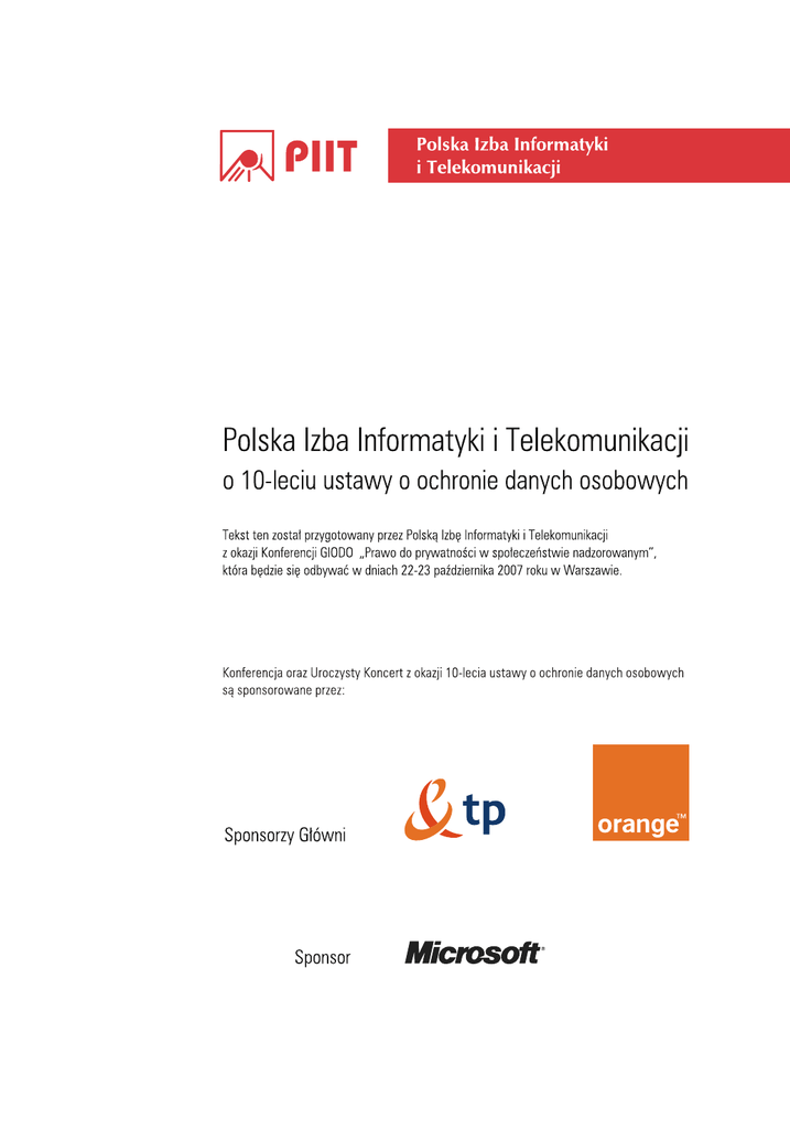 O ustawie Zanim 29 sierpnia 1997 roku ogłoszono ustawę o ochronie danych osobowych, już w 1992 roku rozpoczęły się prace nad przygotowaniem jej pierwszej wersji. Pracom tym, prowadzonym w MSW pod kierunkiem Dyrektora Dariusza Kupieckiego z udziałem ekspertów: prof. Michała Kuleszy i mecenasa Arwida Mednisa, towarzyszyły dyskusje nad pożądanym zakresem regulacji oraz możliwościami technicznymi jej realizacji. Do Sejmu projekt skierowano dopiero pod koniec 1996 roku. Długi czas przygotowywania ustawy był spowodowany przede wszystkim brakiem powszechnego zrozumienia wagi i znaczenia ochrony danych osobowych. Świadomość zagrożeń z powodu „kradzieży tożsamości” była wówczas bardzo niska i to nie tylko wśród decydentów ale ogólnie w społeczeństwie. W dodatku tego typu regulacja ustawowa była absolutnie precedensowa, bez żadnych uprzednich doświadczeń. Warto przy tym przypomnieć, że ustawa ta była pierwszą ustawą realizującą przepis nowej Konstytucji. W Konstytucji uchwalonej parę miesięcy wcześniej pojawiło się nieistniejące wcześniej prawo do prywatności i ustawa wypełniła ten przepis w zakresie ochrony informacji. Mimo, że ustawa miała dotyczyć ogółu obywateli oraz każdego gromadzonego o nich zbioru danych, najwięcej emocji oraz coraz to nowych argumentów pojawiało się w środowisku informatycznym. Polska Izba Informatyki i Telekomunikacji od początku brała aktywny udział w tych dyskusjach. Nasze środowisko dyskutowało głównie o zapisach dotyczących rozwiązań technicznych, analizowaliśmy też wiele z proponowanych zasad ochrony. Wszak coraz większa powszechność zastosowań i systemów informatycznych umożliwiała szybkie gromadzenie i analizowane zbiorów danych, mogąc dostarczać korzystającym z tych technik coraz większą liczbę przeglądowych danych osobowych. Między innymi dyskutowano nad blokowaniem możliwości agregacji zbiorów danych osobowych. Po powołaniu pierwszego Generalnego Inspektora Ochrony Danych Osobowych – Pani Prof. Ewy Kuleszy – Izba podjęła otwartą współpracę z Biurem GIODO. Warto tutaj zaznaczyć, że w czasie prac nad projektem ustawy zastanawiano się nad wprowadzeniem stanowiska zastępcy GIODO, z mocy prawa – informatyka, który stanowiłby razem z GIODO – prawnikiem kompetentną merytorycznie parę. Niestety pomysł ten upadł, co w efekcie często przysparzało dodatkowych problemów w pracach GIODO. Izba początkowo zajmowała się promowaniem i objaśnianiem zapisów ustawy w codziennych zastosowaniach, szczególnie w kontekście informatycznym. Braliśmy również udział w opracowywaniu i opiniowaniu treści rozporządzeń do Ustawy. Nierzadko miewaliśmy odmienne zdania na temat interpretacji poszczególnych zapisów. Czasem udawało się przekonać GIODO do naszych racji, a czasem nie. Pierwszym poważnym konfliktem, a jednocześnie ważnym sprawdzianem skuteczności ustawy, był problem gromadzenia danych o abonentach telefonii komórkowej. Operatorzy udostępniając telefony komórkowe po minimalnych cenach (nawet za 1 zł) kredytują je z wpływów za ich wykorzystanie. Swoje usługi operatorzy sprzedają poprzez firmy trzecie, które w ich imieniu podpisują umowy z abonentami. Kredytując telefony i usługi operatorzy zdecydowali się na zbieranie danych o abonentach na podstawie dwóch identyfikatorów ze zdjęciem, skopiowanych na dowód, że przedstawiciel rzeczywiście je widział. Legalność tej procedury została podważona przez Generalnego Inspektora i przez kilkanaście miesięcy sprawa była przedmiotem sporów sądowych. Poszukując rozwiązań mogących spełnić oczekiwania obu stron, Izba zaproponowała zasłanianie części kopiowanych dokumentów zawierających dane nieistotne dla operatora. Te i inne problemy z zakresu ochrony danych osobowych znalazły się także w zapisach Prawa Telekomunikacyjnego z 21 lipca 2000 roku pod hasłem „tajemnicy telekomunikacyjnej”. Przy kolejnych aktualizacjach ustawy Prawo Telekomunikacyjne odżywały kolejne gorące dyskusje na temat zakresu i interpretacji poszczególnych zapisów w tych artykułach. Izba starała się na bieżąco analizować te zapisy i przedstawiać wspólne dla operatorów poglądy w tej sprawie. Również w konsultowanej z Izbą ustawie o świadczeniu usług drogą elektroniczną z 18 lipca 2002 roku zawarto wiele zapisów z zakresu ochrony danych osobowych. Ustawa, przygotowywana w Ministerstwie Infrastruktury pod kierunkiem Pani Dyrektor Danuty Wieczorek zawierała wiele nowatorskich na owe czasy regulacji. Izba wspólnie z ekspertem – mecenasem Xawerym Konarskim – brała aktywny udział w opracowywaniu zapisów tej ustawy, w szczególności w zakresie rozwiązań informatycznych, ale bazując na wcześniejszym doświadczeniu opiniowała również propozycje zapisów dotyczących ochrony danych osobowych, sugerując ich zamieszczenie w ustawie podstawowej. Niestety czas szybko płynie i obecne rozwiązania prawne już nie zawsze się sprawdzają – nadmiernie lub niewystarczająco chroniąc dane utrudniają realizację usług drogą elektroniczną, bądź też narażają użytkowników na kradzież ich tożsamości. Wydaje się konieczne podjęcie dyskusji na temat zakresu ochrony danych osobowych w społeczeństwie informacyjnym z różnego punktu widzenia – prawnego, socjologicznego, ekonomicznego, technicznego i praktycznego. Również w Unii Europejskiej toczą się intensywne prace nad tymi zagadnieniami pod hasłem „data privacy”. Izba jest przygotowana do podjęcia takich dyskusji i uważa je za niezwykle ważne dla dalszego rozwoju teleinformatyzacji, szczególnie w aspekcie telefonii komórkowo-internetowej. Podsumowując minione 10 lat funkcjonowania ustawy o ochronie danych osobowych, możemy stwierdzić, że już samo istnienie ustawy pozytywnie zmieniło stosunek użytkowników i operatorów systemów teleinformatycznych do ochrony prywatności. 