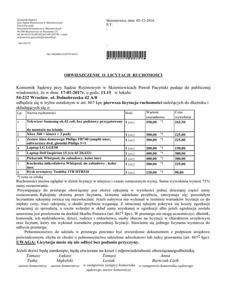 Komornik Sądowy przy Sądzie Rejonowym w Skierniewicach Paweł Pacyński Kancelaria Komornicza w Skierniewicach 96-100 Skierniewice ul. Reymonta 2A tel. 46 8333176,885262445,601269798 e-mail: [email protected] Km 261/15 Skierniewice, dnia 02-12-2016 P.T. . #łm *0020001532070*/0419/ *0020001532070* OBWIESZCZENIE O LICYTACJI RUCHOMOŚCI Komornik Sądowy przy Sądzie Rejonowym w Skierniewicach Paweł Pacyński podaje do publicznej wiadomości, że w dniu 17-01-2017r. o godz. 11.15 w lokalu: 54-232 Wrocław, ul. Dolnobrzeska 42 A/8 odbędzie się w trybie ustalonym w art. 867 kpc pierwsza licytacja ruchomości należących do dłużnika i składających się z: Lp. Nazwa ruchomości 1 Telewizor Samsung ok.42 cali, bez podstawy przygotowany 1 [szt.] do montażu na ścianie Xbox 360 + kinect + 2 pady 2 Zestaw kina domowego Philips FR740 (amplit uner, 3 odtwarzacz dvd, głośniki Philips 5+1 Laptop LG LGE50 4 Laptop Dell Inspirion 15 (s/n 6C2K432) 5 Piekarnik Whirpool, do zabudowy, kolor inox 6 Kuchenka mikrofalowa Whirpool, do zabudowy , kolor 7 inox Dysk zewnętrzy Toshiba 1TB DTB310 8 *) cena za sztukę Ilość Wartość szacunkowa 350,00 *) Cena wywołania 262,50 1 [szt.] 1 [szt.] 300,00 300,00 *) 1 [szt.] 1 [szt.] 1 [szt.] 1 [szt.] 200,00 400,00 400,00 300,00 *) *) 150,00 300,00 300,00 225,00 1 [szt.] 120,00 *) 90,00 *) *) *) 225,00 225,00 Ruchomości można oglądać w dzień licytacji w miejscu i czasie oznaczonym wyżej. Suma wywołania wynosi 75% sumy oszacowania. Przystępujący do przetargu obowiązany jest złożyć rękojmię w wysokości jednej dziesiątej części sumy oszacowania. Rękojmię złożoną przez licytanta, któremu udzielono przybicia, zatrzymuje się; pozostałym licytantom rękojmię zwraca się niezwłocznie. Jeżeli nabywca nie wykonał w terminie warunków licytacji co do zapłaty ceny, traci rękojmię, a skutki przybicia wygasają. Z utraconej rękojmi pokrywa się koszty egzekucji związanej ze sprzedażą, a reszta wchodzi w skład sumy uzyskanej w egzekucji albo jeżeli egzekucja została umorzona jest przelewana na dochód Skarbu Państwa (art. 8671 kpc). W przetargu nie mogą uczestniczyć: dłużnik, komornik, ich małżonkowie, dzieci, rodzice i rodzeństwo, osoby obecne na licytacji w charakterze urzędowym oraz licytant, który nie wykonał warunków poprzedniej licytacji. Stawienie się jednego licytanta wystarcza do odbycia przetargu. Pełnomocnictwo do udziału w przetargu powinno być stwierdzone dokumentem z podpisem urzędowo poświadczonym, chyba że chodzi o pełnomocnictwo udzielone adwokatowi lub radcy prawnemu (art. 8672 kpc) UWAGA: Licytacja może się nie odbyć bez podania przyczyny. Jeżeli drzwi będą zamknięte, będą otwierane na koszt i odpowiedzialność obowiązanegodłużnika. Tomasz Łukasz Tomasz Anna Tutka Mąkolski Lesiak Bartczak-Lisik asesor komorniczy asesor komorniczy w zastępstwie zastępcy komornika w zastępstwie komornika sądowego sądowego asesor komorniczy Do wiadomości: 1. a/a