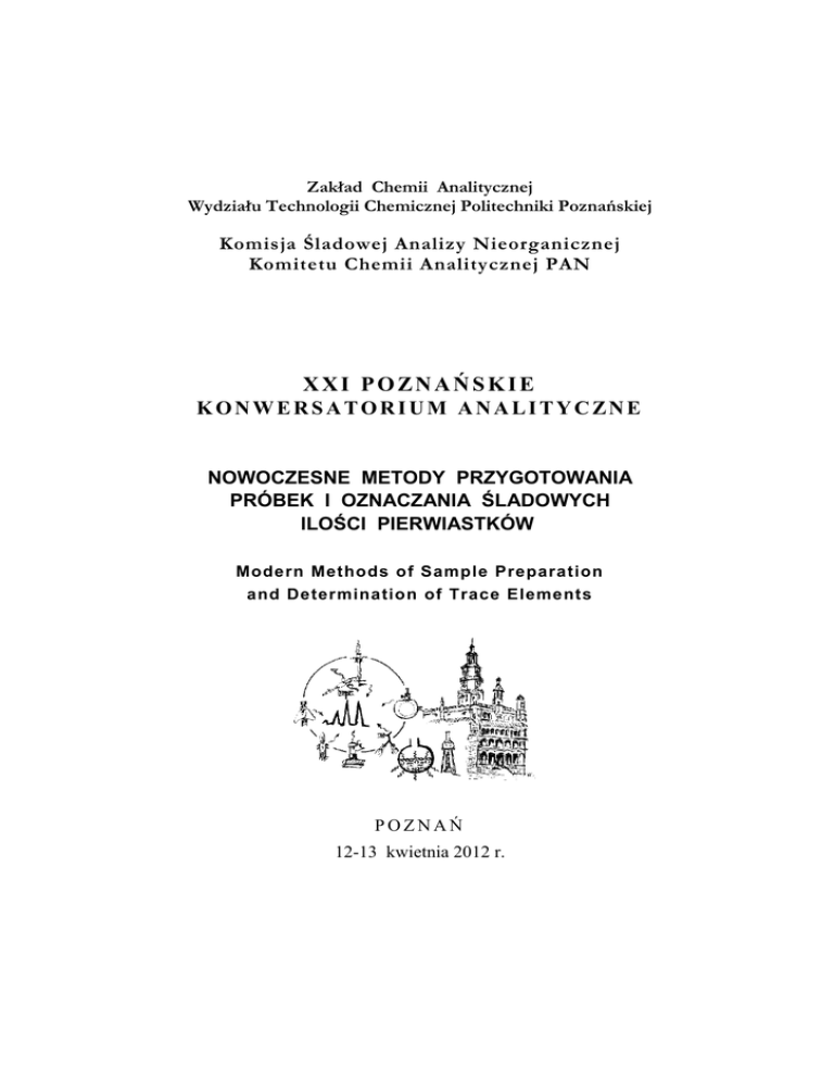 Zakład Chemii Analitycznej Wydziału Technologii Chemicznej Politechniki Poznańskiej Komisja Śladowej Analizy Nieorganicznej Komitetu Chemii Analitycznej PAN XXI POZNAŃSKIE KONWERSATORIUM ANALITYCZNE NOWOCZESNE METODY PRZYGOTOWANIA PRÓBEK I OZNACZANIA ŚLADOWYCH ILOŚCI PIERWIASTKÓW Modern Methods of Sample Preparation and Determination of Trace Elements POZNAŃ 12-13 kwietnia 2012 r. P R O G R A M 12 kwietnia 2012 r. (czwartek) 11:00 - 11:05 O t w a r c i e - H. Matusiewicz 11:05 - 11:40 R. Dobrowolski, A. Mróz (Uniwersytet Marii Curie – Skłodowskiej, Lublin) Gaz łupkowy – technologia i wyzwania analityczne 11:40 - 12:10 E. Szmyd, B. Bolibrzuch, H. Matusiak, Ł. Buzek, Z. Mzyk (Instytut Metali Nieżelaznych, Gliwice) Analityka renu – studium przypadku 12:10 - 12:30 M. Chudzińska, D. Barałkiewicz (Uniwersytet im. Adama Mickiewicza, Poznań) Zastosowanie ICP-MS w poszukiwaniu markerów autentyczności miodu- chemometryczna analiza danych 12:30 - 13:00 P R Z E R W A 13:00 - 13:30 A. Dostatni, P. Niedzielski (Uniwersytet im. Adama Mickiewicza, Poznań) Koncepcja rozszerzenia kontroli jakości w oznaczeniach zawartości metali w laboratorium analitycznym z wdrożonym systemem jakości według normy ISO 17025 13:30 - 13:50 E. Chajduk, I. Bartosiewicz, M. Pyszynska, J. Chwastowska, H. PolkowskaMotrenko (Instytut Chemii i Techniki Jądrowej, Warszawa) Analiza materiałów geologicznych metodą spektrometrii mas z jonizacją w plazmie indukcyjnie sprzężonej (ICP-MS) 13:50 - 14:10 M. Ślachciński, H. Matusiewicz (Politechnika Poznańska) Zastosowanie mikrosystemów elektroforetycznych w optycznej spektrometrii emisyjnej plazmy indukowanej mikrofalowo 14:10 - 15:00 Przygotowanie SESJI PLAKATOWEJ 15:30 OBIAD Zebranie Komisji Śladowej Analizy Nieorganicznej 15:30 - 18:00 OBIAD I SPOTKANIE TOWARZYSKIE 13 kwietnia 2012 r. (piątek) 09:00 - 09:30 M. Stochaj-Yamani (Perlan Technologies Polska Sp. z o.o. Warszawa) ICP-MS jako czołowy detektor w nieorganicznej spektrometrii mas i analizie specjacyjnej 09:30 - 09:50 E. Stanisz, H. Matusiewicz (Politechnika Poznańska, Poznań) Generowanie lotnych form pierwiastków przy udziale promieniowania ultrafioletowego i ultradźwięków 09:50 - 10:20 M. Moritz (Politechnika Poznańska, Poznań) Zastosowanie nanomateriałów w chemii analitycznej 10:20 - 10:40 R. Muzyka, T. Topolnicka (Instytut Chemicznej Przeróbki Węgla, Zabrze) Oznaczanie zawartości tlenu w węglu kamiennym 9:00 - 12:30 S E S J A P L A K A T O W A Prezentacja firm, literatury fachowej, aparatury, sprzętu i odczynników 12:30 - 13:00 P o d s u m o w a n i e s e s j i p l a k a t o w e j i wyróżnienie PLAKATÓW 13 : 00 Z a k o ń c z e n i e o b r a d - H. Matusiewicz SESJA PLAKATOWA Każdy z autorów prezentujących komunikaty w sesji plakatowej otrzyma do dyspozycji planszę o wymiarach 1m x 1m 1. B. Janasik, R. Brodzka, M. Trzcinka-Ochocka, M. Stanisławska (Instytut Medycyny Pracy im. prof. J. Nofera, Łódź) Oznaczanie selenu w surowicy/osoczu techniką spektrometrii mas z plazmą indukcyjnie sprzężoną (ICP-MS): porównanie z techniką bezpłomieniowej absorpcyjnej spektrometrii atomowej (GF-AAS) 2. J. Harasimowicz-Siemko, A. Karaś, W. Sokołowska (Instytut Technologii Materiałów Elektronicznych, Warszawa) Pomoc metod spektroskopowych (FAAS, ICP-OES, AES, UV-Vis) w technologii wytwarzania YAMów (Y4Al2O9) 3. A. Mróz, J. Dobrzyńska, M. Otto, R. Dobrowolski (Uniwersytet Marii Curie–Skłodowskiej, Lublin) Oznaczanie platyny techniką dozowania zawiesiny jonitu do atomizera elektrotermicznego spektrometru AAS 4. M. Otto, J. Dobrzyńska, A. Mróz, R. Dobrowolski (Uniwersytet Marii Curie–Skłodowskiej, Lublin) Oznaczanie arsenu oraz selenu techniką dozowania zawiesiny węgla GF AAS po ich wzbogaceniu na impregnowanych węglach aktywnych 5. E. Stanisz, J. Jasiak, H. Matusiewicz (Politechnika Poznańska) Generowanie lotnych form kadmu przy udziale promieniowania ultrafioletowego w absorpcyjnej spektrometrii atomowej 6. J. Werner, E. Stanisz, H. Matusiewicz (Politechnika Poznańska) Zastosowanie cieczy jonowych w mikroekstrakcji podczas oznaczania rtęci techniką generowania par 7. M. Krawczyk, H. Matusiewicz (Politechnika Poznańska) Sekwencyjne, wielopierwiastkowe oznaczanie platyny, palladu i rodu z zastosowaniem wysokorozdzielczego spektrometru absorpcyjnego z ciągłym źródłem promieniowania 8. R. Brodzka, B. Janasik, M. Trzcinka-Ochocka (Instytut Medycyny Pracy im. prof. J. Nofera, Łódź) Ocena możliwości zastosowania techniki LA-ICP-MS (spektrometria mas z plazmą indukcyjnie sprzężoną w połączeniu z ablacją laserową) do oznaczania metali w środowisku pracy 9. T. Ligor, E. Trawińska, B. Buszewski, (Wydział Chemii, Uniwersytet Mikołaja Kopernika, Wojewódzki Szpital Zespolony, Toruń) Zastosowanie spektrometrii mas z analizatorem czasu przelotu w analizie powietrza wydychanego 10. M. Trzcinka-Ochocka, B. Janasik, R. Brodzka (Instytut Medycyny Pracy im. Prof. J. Nofera, Łódź) Ocena zawartości toksycznych metali śladowych w wyrobach gospodarstwa domowego i zabawkach; próba wykorzystania techniki LA-ICP-MS 11. S. Garboś, D. Święcicka (Państwowy Zakład Higieny, Warszawa) Monitorowanie stężeń uranu w wodzie ujmowanej i uzdatnianej w zakładach wodociągowych Wrocławia za pomocą ICP-MS 12. J. Retka, D. Karmasz, A. Maksymowicz (Państwowy Instytut Geologiczny – Państwowy Instytut Badawczy, Warszawa) Oznaczanie zawartości wybranych pierwiastków w próbkach gleb i roślin udział w porównaniach międzylaboratoryjnych 13. J. Ostrowski, A. Skiba, R. Dobrowolski (Instytut Nawozów Sztucznych, Puławy, Uniwersytet Marii Curie-Skłodowskiej, Lublin) Technika wprowadzania zawiesiny do plazmy argonowej w oznaczaniu wybranych pierwiastków w nawozach zawiesinowych metodą ICP-OES 14. J. Ostrowski, A. Skiba, R .Dobrowolski (Instytut Nawozów Sztucznych, Puławy, Uniwersytet Marii Curie-Skłodowskiej, Lublin) Standaryzacja pomiarów w