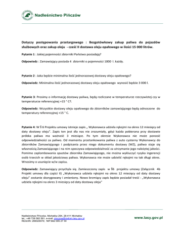 Nadleśnictwo Pińczów Dotyczy postępowania przetargowego : Bezgotówkowy zakup paliwa do pojazdów służbowych oraz zakup oleju - cześć II dostawa oleju opałowego w ilości 15 000 litrów. Pytanie 1 : Jakiej pojemności zbiorniki Państwo posiadają? Odpowiedz : Zamawiający posiada 4 zbiorniki o pojemności 1000 l. każdy. Pytanie 2 : Jaka będzie minimalna ilość jednorazowej dostawy oleju opałowego? Odpowiedz: Minimalna ilość jednorazowej dostawy oleju opałowego wynosić będzie 3 000 l. Pytanie 3: Prosimy o informację dostawy paliwa, będą rozliczane w temperaturze rzeczywistej czy w temperaturze referencyjnej +15 ° C?. Odpowiedz: Wszystkie dostawy oleju opałowego do zbiorników zamawiającego będą odnoszone do temperatury referencyjnej +15 ° C. Pytanie 4: W § 6 Projektu umowy istnieje zapis „ Wykonawca udziela rękojmi na okres 12 miesięcy od daty dostawy oleju”. Zapis ten jest dla nas nie zrozumiały, gdyż każda pobierana przy dostawie próbka paliwa ma ważność 3 miesiące. Po tym okresie Wykonawca nie może ponosić odpowiedzialności za paliwo. Od momentu przetankowania paliwa z auto cysterny Wykonawcy do zbiorników Zamawiającego i podpisania przez niego dokumentu dostawy (WZ), paliwo staje się własnością Zamawiającego i na nim spoczywa odpowiedzialność za utrzymanie jego należytej jakości. Pomimo zaplombowania spustów zbiornika Zamawiającego, nie można wykluczyć ryzyka ingerencji osób trzecich w skład jakościowy paliwa. Wykonawca nie może udzielić rękojmi na tak długi okres. Wnosimy o usunięcie w/w zapisu. Odpowiedz: Zamawiający przychyla się. Zamieszczony zapis w §6 projektu umowy (Załącznik 4b Projekt umowy dla części II) „Wykonawca udziela rękojmi na okres 12 miesięcy od daty dostawy oleju” zostanie skorygowany i zmieniony. Nowo brzmiący zapis będzie posiadał treść : „Wykonawca udziela rękojmi na okres 3 miesięcy od daty dostawy oleju” Nadleśnictwo Pińczów, Michałów 294, 28-411 Michałów tel.: +48 728 582 561, e-mail: [email protected] REGON: 290020070; NIP:662 005 27 44 www.lasy.gov.pl