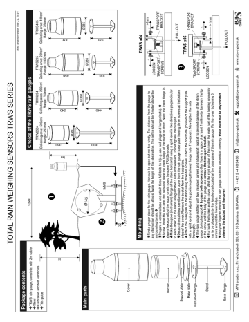 $ 3xM8 1m Ø360 ++421 2 44 88 94 86 [email protected] Ø385 LOOSEN TRANSPORT BRACKET >1mm Ø385 >1mm TRANSPORT BRACKET PULL OUT TRWS x05 PULL OUT TRWS x04 www.mps-system.sk TRANSPORT SCREWS LOOSEN TRANSPORT SCREWS [email protected] èFind a proper place for the rain gauge. It should be open but not too windy. The distance from the gauge to any obstruction should be at least twice the height of the obstruction. The orifice should be 1 meter above the surrounding terrain. èPrepare a concrete base and attach three M8 bolts to it (e.g. use wall plugs and hanger bolts). èScrew three M8 nuts onto the bolts and place the lower flange of the stand on them. Note: the lower flange is always hexagonal but the upper one is round by some TRWS models. èMake the upper (instrument) flange of the stand horizontal using a spirit level in two directions perpendicular to each other. Fix the stand using another 3 nuts and washers. Do not tighten the nuts yet. èDetach the stainless steel/laminate cover from the rain gauge base plate loosing three screws at the bottom edge of the cover. Remove the bucket from the base plate. èAttach the base plate to the stand using three M8 screws. Check the horizontal position of the support plate with a spirit level and adjust the position using the lower flange nuts if necessary. Now tighten the nuts thoroughly. èThe rain gauge is fitted with two transport screws and a transport bracket to prevent damage of the strain gauge during transport. Loosen both screws so that there is a space of at least 1 millimeter between the tip of the screw and the body of the gauge and remove the transport bracket. èPut back the bucket and the cover. Mind the right position of the cover: the male part of the heating connector has to be plugged into the female one located at the base plate of the rain gauge. Fix the cover tightening 3 screws around the lower edge. èUse your finger to check if the rain gauge has been assembled correctly: there must not be any contact between the bucket and the cover! Mounting Ø145 MPS systém s.r.o., Pri vinohradoch 326, 831 06 Bratislava, SLOVAKIA Base flange Stand Instrument flange Base plate Support plate Bucket Cover Main parts Ø360 TRWS405 Collecting area: 400cm2 Range: 750mm Most recent revision Feb 21, 2014 TRWS204 TRWS205 TRWS504 2 2 Collecting area: 500cm2 Collecting area: 200cm Collecting area: 200cm Range: 750mm Range: 1500mm Range: 250mm Choice of the TRWS rain gauges 380 600 >2xH 540 440 èTRWS rain gauge, complete, with 2m cable èStand èCalibration and test certificate èThis guide 650 330 Package contents H TOTAL RAIN WEIGHING SENSORS TRWS SERIES 20 610 370 DIP SWITCH SDI12 RS485 GRY BRN SHIELD RED BLU ORN VIO YEL GRN LOGGER 9600bps, 8 data bits, 1 stop bit, no parity RS485 HEATING VOLTAGE 10..15VDC OPERATING VOLTAGE 8..24VDC Red Blue Orange Violet Yellow Green Grey Brown Shield Wiring Positive operating voltage Negative operating voltage Positive heating voltage Negative heating voltage RS485+ / SDI-12 DATA RS485Contact output A Contact output B Ground TRWS [email protected] RED BLU ORN VIO GRY BRN SHIELD YEL GRN [email protected] 8..24VDC/15mAMAX 10..15VDC/0.8..1.3A 9600, 8 data bits, 1 stop bit, no parity 30VMAX/300mAMAX Ø360x540 / Ø360x380 / Ø385x650 / Ø385x610mm 8.0 / 8.0 / 9.5 / 9.5kg 2m -40..+70ºC 0..100% 1<CR><LF> Note: even though the 'M' and 'D' commands are implemented as well, it is strongly recommended to use the 'R' command to get data from the rain gauge. raw one-minute precipitation sum (0.185mm) (other items correspond to those in the basic message) accumulated precipitation sum (21.246mm) total weight (7795.146g) one-minute precipitation sum (0.134mm) sensor address (default '1') sensor address (default address is '1') LOGGER + - HEATING VOLTAGE 10..15VDC SDI-12 12V SDI-12 DATA SDI-12 GROUND + + - BRN www.mps-system.sk BRN GRY LOGGER A PULL-UP OR A PULL-DOWN RESISTOR MAY BE NECESSARY AS FOLOWS: +V +V GRY COUNTER INPUT 1 pulse per 0.01/0.1/1mm (selectable) HEATING VOLTAGE 10..15VDC OPERATING VOLTAGE 8..24VDC Connecting to a logger using the contact output sensor address Response: ++421 2 44 88 94 86 Operating power Heating power RS485 Contact output Dimensions (TRWS204 / 504 / 205 / 405) Weight (TRWS204 / 504 / 205 / 405) Cable length Operating temperature Operating humidity MPS systém s.r.o., Pri vinohradoch 326, 831 06 Bratislava, SLOVAKIA OK<CR><LF> <SOH>11D<STX>134<TAB>7995146<TAB>21246<TAB>185<ETX><CR><LF> raw one-minute precipitation sum (0.185mm) (other items correspond Zero the accumulated sum: to those in the basic message) <SYN>11CLRRS<CR> sensor address Specifications Response: Data request (extended message): <ENQ>11D<CR> accumulated precipitation sum (21.246mm) total weight (7795.146g) one-minute precipitation sum (0.134mm) sensor address (default '11') 1XR! <SOH>11<STX>134<TAB>7995146<TAB>21246<ETX><CR><LF> 1+0.134+7995.146+21.246+0.185<CR><LF> Response: Data request (extended message): 1R1! Zero the accumulated sum: sensor address (default address is '11') + + + - ORN VIO RED YEL BLU GRN GRY BRN SHIELD 1+0.134+7995.146+21.246<CR><LF> Response: Data request (basic message): 1R0! TRWS Connecting to a logger using the SDI-12 interface Response: Data request (basic message): <ENQ>11<CR> TRWS Connecting to a logger using the RS485 interface A TRWS rain gauge is delivered with serial interface selected according to your order (RS485 or SDI12). If necessary you can select the other interface by yourself: èOn the base plate remove the metal lid covering the electronics unscrewing two socket screws (a low-profile 4/ISO hex key is needed). èThere is a group of three dip-switches on the PCB inside. Switch all the switches to either RS485 or SDI12 position. èReplace the lid, tighten the screws and switch the instrument off and on so that the change becomes valid. Note: The contact output functionality is not affected by selecting the serial interface. Selecting serial interface RS485 TOTAL RAIN WEIGHING S