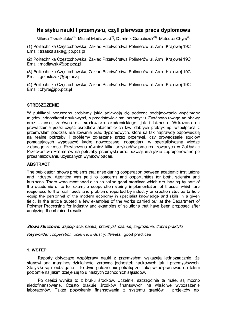 Na styku nauki i przemysłu, czyli pierwsza praca dyplomowa Milena Trzaskalska(1), Michał Modławski(2), Dominik Grzesiczak(3), Mateusz Chyra(4) (1) Politechnika Częstochowska, Zakład Przetwórstwa Polimerów ul. Armii Krajowej 19C Email: [email protected] (2) Politechnika Częstochowska, Zakład Przetwórstwa Polimerów ul. Armii Krajowej 19C Email: [email protected] (3) Politechnika Częstochowska, Zakład Przetwórstwa Polimerów ul. Armii Krajowej 19C Email: [email protected] (4) Politechnika Częstochowska, Zakład Przetwórstwa Polimerów ul. Armii Krajowej 19C Email: [email protected] STRESZCZENIE W publikacji poruszono problemy jakie pojawiają się podczas podejmowania współpracy między jednostkami naukowymi, a przedstawicielami przemysłu. Zwrócono uwagę na obawy oraz szanse, zarówno dla środowiska akademickiego, jak i biznesu. Wskazano na prowadzenie przez część ośrodków akademickich tzw. dobrych praktyk np. współpraca z przemysłem podczas realizowania prac dyplomowych, które są tak naprawdę odpowiedzią na realne potrzeby i problemy zgłaszane przez przemysł, czy prowadzenie studiów pomagających wyposażyć kadrę nowoczesnej gospodarki w specjalistyczną wiedzę z danego zakresu. Przytoczono również kilka przykładów prac realizowanych w Zakładzie Przetwórstwa Polimerów na potrzeby przemysłu oraz rozwiązania jakie zaproponowano po przeanalizowaniu uzyskanych wyników badań. ABSTRACT The publication shows problems that arise during cooperation between academic institutions and industry. Attention was paid to concerns and opportunities for both, scientist and business. There were mentioned also so-called good practices which are leading by part of the academic units for example cooperation during implementation of theses, which are responses to the real needs and problems reported by industry or creation studies to help equip the personnel of the modern economy in specialist knowledge and skills in a given field. In the article quoted a few examples of the works carried out at the Department of Polymer Processing for industry and examples of solutions that have been proposed after analyzing the obtained results. Słowa kluczowe: współpraca, nauka, przemysł, szanse, zagrożenia, dobre praktyki Keywords: cooperation, science, industry, threats, good practices 1. WSTĘP Raporty dotyczące współpracy nauki z przemysłem wskazują jednoznacznie, że stanowi ona margines działalności zarówno jednostek naukowych jak i przemysłowych. Statystki są nieubłagane – te dwie gałęzie nie potrafią ze sobą współpracować na takim poziomie na jakim dzieje się to u naszych zachodnich sąsiadów. Po części wynika to z braku środków. Uczelnie, szczególnie te małe, są mocno niedofinansowane. Często brakuje środków finansowych na właściwe wyposażenie laboratoriów. Także pozyskanie finansowania z systemu grantów i projektów np. z Narodowego Centrum Nauki, czy Narodowego Centrum Badań i Rozwoju, okazuje się poza zasięgiem takich jednostek. Wynika to z faktu, że składając wniosek o grant, w zdecydowanej większości przypadków, Wnioskodawca musi zapewnić m.in. zaplecze aparaturowe. Im lepiej wyposażone laboratoria, tym większa szansa na wykonanie ciekawych i innowacyjnych badań, a w związku z tym większa szansa na uzyskanie grantu. W momencie, gdy jednostka nie może wykazać się wystarczającą bazą sprzętową, szanse na uzyskanie grantu są małe. Także przemysł boryka się z niedofinansowaniem. Duże firmy inwestują we własne laboratoria oraz kadrę. Wypracowując własne „know – how”, często nie chcą się dzielić nim z jednostkami naukowymi – uważając, że nic nie wniosą do współpracy. Najczęściej to małe i średnie przedsiębiorstwa są zainteresowane innowacjami, które może zaoferować im sektor naukowy. Tutaj jednak pojawia się kwestia finansowania – MŚP rzadko kiedy mogą sobie pozwolić na inwestowanie co najmniej kilkuset tysięcy złotych w innowacyjne pomysły opracowane na Uczelniach. Przeszkodą w porozumieniu się tych dwóch gałęzi jest także sama mentalność przedstawicieli obu środowisk. Z jednej strony naukowcy zamykają się na realne potrzeby rynku, nie próbują porozumieć się z przedstawicielami przemysłu na poziomie zrozumiałym dla obu stron żonglując naukowymi terminami, często nawet nie starają się przedstawiać wyników swoich badań w sposób wskazujący jednoznacznie jaka jest możliwość wykorzystania ich w praktyce. Z drugiej strony przedstawiciele przemysłu nie potrafią w sposób jasny i klarowny wskazać kierunku prowadzenia przyszłych badań, nie chcą przyjąć podstaw teoretycznych, które stoją za praktycznym zrozumieniem i rozwiązaniem zgłaszanego problemu, a wreszcie boją się, że owoce współpracy z nauką „wypłyną” przy okazji publikacji naukowych powodując zmniejszenie konkurencyjności firmy. Należy jednak zdać sobie sprawę z tego, że wzajemna współpraca może być owocna i satysfakcjonująca dla obu stron głownie dlatego, że przyświecają im nieco inne cele i nie muszą ze sobą konkurować. Dla uczelni najważniejszym celem jest poszerzanie oraz upowszechnianie wiedzy, a także edukowanie kadry nowoczesnej gospodarki. Dla biznesu to przede wszystkim szukanie rozwiązań procesowych oraz kreowanie nowych technologii, umożliwiających utrzymanie przewagi konkurencyjnej, niezależnie od prowadzonej działalności. 2. REALIZOWANE PRACE DYPLOMOWE W Zakładzie Przetwórstwa Polimerów Politechniki Częstochowskiej już od wielu lat zabiegamy oraz dbamy o owocną i satysfakcjonującą współpracę na styku nauki z przemysłem. Współpraca ta odbywa się na kilku płaszczyznach m.in. udział we wspólnych projektach, wykonywanie badań zleconych z firm, kształcenie kadry (szkolenia i studia, w tym również podyplomowe) oraz realizacja prac dyplomowych będących jednocześnie analizą wyników badań przeprowa