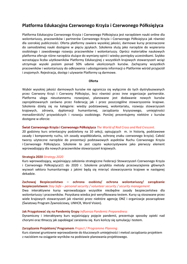 Platforma Edukacyjna Czerwonego Krzyża i Czerwonego Półksiężyca Platforma Edukacyjna Czerwonego Krzyża i Czerwonego Półksiężyca jest narzędziem nauki online dla wolontariuszy, pracowników i partnerów Czerwonego Krzyża i Czerwonego Półksiężyca jak również dla szerokiej publiczności. Oferta platformy zawiera wysokiej jakości, darmowe kursy przeznaczone do samodzielnej nauki dostępne w pięciu językach. Szkolenia służą jako narzędzie do wspierania osobistego i zawodowego rozwoju pracowników i wolontariuszy. Oprócz materiałów naukowych platforma oferuje różne narzędzia służące do wymiany opinii i wiedzy pomiędzy uczestnikami. Szybko wzrastająca liczba użytkowników Platformy Edukacyjnej z wszystkich krajowych stowarzyszeo wciąż utrzymuje wysoki poziom ponad 50% udanie ukooczonych kursów. Zachęcamy wszystkich pracowników i wolontariuszy do odkrywania i udostępniania informacji o Platformie wśród przyjaciół i znajomych. Rejestracja, dostęp i używanie Platformy są darmowe. Oferta Wybór wysokiej jakości darmowych kursów nie ogranicza się wyłącznie do tych dystrybuowanych przez Czerwony Krzyż i Czerwony Półksiężyc, lecz również przez inne organizacje partnerskie. Platforma ulega nieustannemu rozwojowi, planowane jest dodawanie nowych kursów zaprojektowanych zarówno przez Federację jak i przez poszczególne stowarzyszenia krajowe. Szkolenia dzielą się na kategorie: wiedzy podstawowej, wolontariatu, rozwoju stowarzyszeo krajowych, zdrowia, dyplomacji humanitarnej, zarządzania kryzysowego, umiejętności menadżerskich/ przywódczych i rozwoju osobistego. Poniżej prezentujemy niektóre z kursów dostępne w ofercie: Świat Czerwonego Krzyża i Czerwonego Półksiężyca The World of Red Cross and Red Crescent. 20 godzinny kurs orientacyjny podzielony na 10 sekcji, opisujących m. in historię, podstawowe zasady i komponenty ruchu, ich zasady współdziałania, ochronę znaku czerwonego krzyża). Całośd tworzy użyteczne narzędzie do prezentacji podstawowych aspektów Ruchu Czerwonego Krzyża i Czerwonego Półksiężyca. Szkolenie to jest często wykorzystywane jako pierwszy element wprowadzający dla nowych pracowników stowarzyszeo krajowych. Strategia 2020 Strategy 2020 Kurs wprowadzający, wyjaśniający założenia strategiczne Federacji Stowarzyszeo Czerwonego Krzyża i Czerwonego Półksiężyca11 do 2020 r. Szkolenie przybliża metody przezwyciężenia głównych wyzwao sektora humanitarnego z jakimi będą się mierzyd stowarzyszenia krajowe w następnej dekadzie. Zachowaj Bezpieczeostwo – ochrona osobista/ ochrona wolontariuszy/ zarządzanie bezpieczeostwem Stay Safe – personal security / volunteer security / security management Dwa interaktywne kursy wprowadzające wszystkie niezbędne zasady bezpieczeostwa dla wolontariuszy i pracowników. Pozyskana wiedza jest weryfikowana testem. Kursy są stosowane przez wiele krajowych stowarzyszeo jak również przez niektóre agencję ONZ i organizacje pozarządowe (Światowy Program Żywnościowy, UNHCR, Word Vision). Jak Przygotowad się na Pandemię Grypy Influenza Pandemic Preparedness Dynamiczny i interaktywny kurs wyjaśniający pojęcie pandemii, prezentuje sposoby opieki nad chorymi oraz tłmaczy jak zapobiegad zarażeniu się. Kurs kooczy się symulacją i testem. Zarządzanie Projektem/ Programem Project / Programme Planning Kurs stanowi gruntowne wprowadzenie do kluczowych umiejętności i metod zarządzania projektem z naciskiem na osiąganie wyników na podstawie planowania projektowego. Wprowadzenie do Programu Transferów Pieniężnych Introduction to cash transfer programming Celem szkolenia jest podniesienie świadomości związanej z programami transferów pieniężnych i rozbudowa wiedzy menadżerów i innych osób odpowiedzialnych za udzielanie pomocy w postaci transferów pieniężnych w sytuacjach kryzysowych. Kurs ułatwia podjęcie decyzji o zasadności korzystania z tego rodzaju pomocy humanitarnej, jak również tłumaczy zasady funkcjonowania tego typu programów. Równośd Gender w Planowaniu Projektu Gender equality in programme planning Kurs online o równości płci w planowaniu projektowym, opracowane przez IASC. Wprowadzenie do Pomocy Międzynarodowej w przypadku Klęsk i Katastrof Introduction to International Disaster Response Laws, Rules and Principles Międzynarodowa pomoc humanitarna może doprowadzid do szeregu problemów prawnych, wywołanych zarówno przez organizacje niosące pomoc jak również przez władze lokalne. Kurs przeznaczony jest dla każdego zainteresowanego kwestiami prawnymi podczas operacji międzynarodowych jak również zagadnieniem jakie działania może podjąd rząd w celu lepszego przygotowania się na odbiór pomocy. Kurs Podstawowy Wolontariatu Volunteering Basic Course Kurs dostarcza podstawowych informacji dla nowych wolontariuszy odnośnie tego kim jest wolontariusz, czym jest Ruch Czerwonego Krzyża i Czerwonego Półksiężyca. Kurs wspiera implementację programu rozwoju wolontariatu, wprowadzając standardowe procedury służące zachowywaniu aktywności wolontariuszy. Przekazywane informacje odnoszą się również do Podstawowych Zasad, Strategii Wolontariatu i Strategii dla Młodzieży, zaakceptowanych w listopadzie 2011 r. Szkolenie przeznaczone do wzmocnienia zaangażowania i umiejętności zarówno wolontariuszy jak i pracowników. Pierwsza Pomoc w Społeczności Lokalnej Community-Based Healthand First Aid W skład czterech modułów kursu wchodzi wprowadzenie do zasad pomocy w ramach społeczności lokalnej, sposobów korzystania z wsparcia wolontariuszy i zasad ich szkolenia, jak również reguł implementacji programu na poziomie krajowym i społeczności lokalnej. Informacje praktyczne Rejestracja na Platformę Edukacyjną: Osoby zainteresowane ofertą Platformy Edukacyjnej powinny zarejestrowad się na stronie „Learning platform”. Linki prowadzący do kursów można znaleźd, po zal