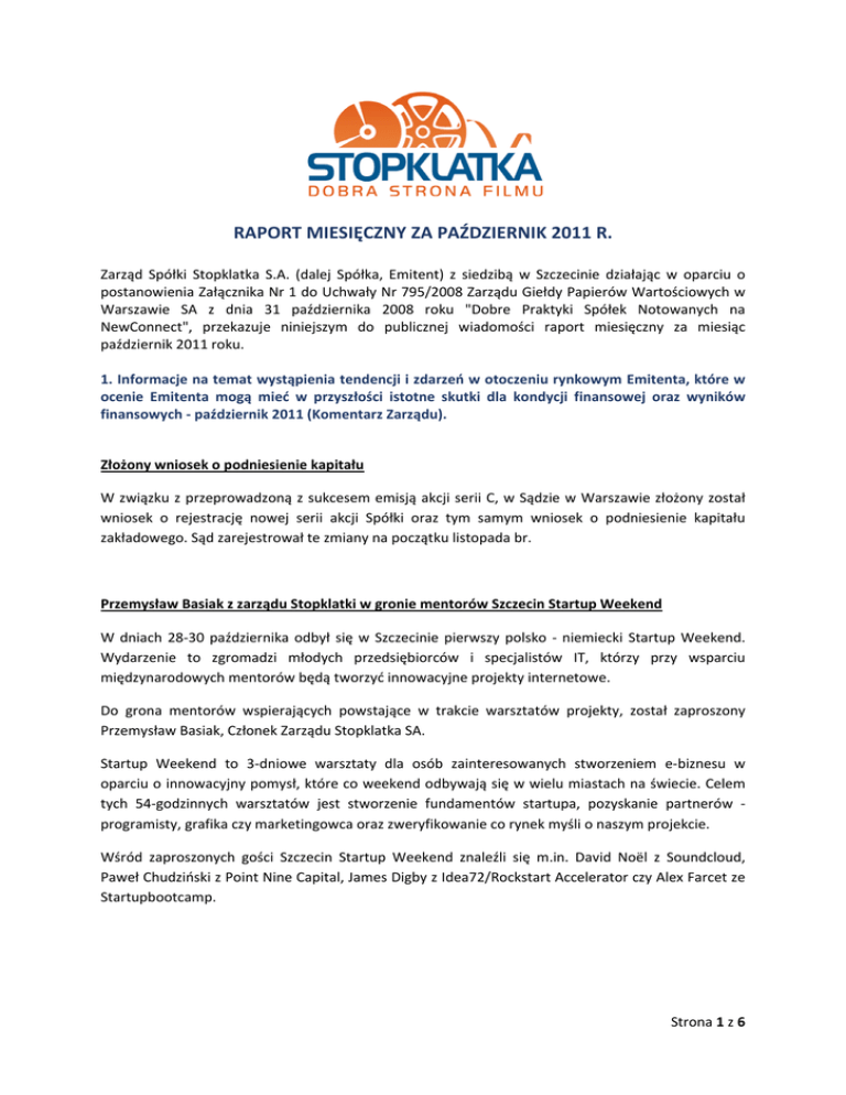RAPORT MIESIĘCZNY ZA PAŹDZIERNIK 2011 R. Zarząd Spółki Stopklatka S.A. (dalej Spółka, Emitent) z siedzibą w Szczecinie działając w oparciu o postanowienia Załącznika Nr 1 do Uchwały Nr 795/2008 Zarządu Giełdy Papierów Wartościowych w Warszawie SA z dnia 31 października 2008 roku "Dobre Praktyki Spółek Notowanych na NewConnect", przekazuje niniejszym do publicznej wiadomości raport miesięczny za miesiąc październik 2011 roku. 1. Informacje na temat wystąpienia tendencji i zdarzeń w otoczeniu rynkowym Emitenta, które w ocenie Emitenta mogą mieć w przyszłości istotne skutki dla kondycji finansowej oraz wyników finansowych ‐ październik 2011 (Komentarz Zarządu). Złożony wniosek o podniesienie kapitału W związku z przeprowadzoną z sukcesem emisją akcji serii C, w Sądzie w Warszawie złożony został wniosek o rejestrację nowej serii akcji Spółki oraz tym samym wniosek o podniesienie kapitału zakładowego. Sąd zarejestrował te zmiany na początku listopada br. Przemysław Basiak z zarządu Stopklatki w gronie mentorów Szczecin Startup Weekend W dniach 28‐30 października odbył się w Szczecinie pierwszy polsko ‐ niemiecki Startup Weekend. Wydarzenie to zgromadzi młodych przedsiębiorców i specjalistów IT, którzy przy wsparciu międzynarodowych mentorów będą tworzyć innowacyjne projekty internetowe. Do grona mentorów wspierających powstające w trakcie warsztatów projekty, został zaproszony Przemysław Basiak, Członek Zarządu Stopklatka SA. Startup Weekend to 3‐dniowe warsztaty dla osób zainteresowanych stworzeniem e‐biznesu w oparciu o innowacyjny pomysł, które co weekend odbywają się w wielu miastach na świecie. Celem tych 54‐godzinnych warsztatów jest stworzenie fundamentów startupa, pozyskanie partnerów ‐ programisty, grafika czy marketingowca oraz zweryfikowanie co rynek myśli o naszym projekcie. Wśród zaproszonych gości Szczecin Startup Weekend znaleźli się m.in. David Noël z Soundcloud, Paweł Chudziński z Point Nine Capital, James Digby z Idea72/Rockstart Accelerator czy Alex Farcet ze Startupbootcamp. Strona 1 z 6 2. Zestawienie informacji opublikowanych przez Emitenta w okresie objętym raportem. RAPORTY EBI: • 29/2011 ‐ Raport miesięczny za wrzesień 2011 r. RAPORTY ESPI: W miesiącu październiku Spółka nie publikowała raportów ESPI 3. Informacje na temat realizacji celów emisji, jeżeli taka realizacja choćby w części miała miejsce w okresie objętym raportem. W okresie objętym raportem Spółka prowadziła kolejne działania w zakresie: • obsługi redakcyjnej i relacji z przeglądów i wydarzeń kulturalnych, • pełnienia patronatów medialnym unikalnych wydarzeń kinowych i imprez specjalnych, • kontynuacji prac rozwojowych w rodzimym portalu Stopklatka.pl (dalej Portal). Zarząd Spółki ocenia, że październik był aktywnym miesiącem w działalności Spółki. Poniżej znajduje się szczegółowy opis działań prowadzonych w raportowanym miesiącu. Działania zespołu redakcyjnego: W październiku redakcja Stopklatki prowadziła działania wokół następujących wydarzeń filmowych, z których najważniejsze były: • codzienne obszerne relacje z 27. Warszawskiego Festiwalu Filmowego • regularne relacje z festiwali Pięć Smaków i Regiofun • specjalne relacje z Londyńskiego Festiwalu Filmowego w Londynie • działania wokół nominacji do nagrody publiczności w ramach Europejskich Nagród Filmowych • obszerne działania wokół Nagród im. Zbyszka Cybulskiego Informacyjne wsparcie redakcyjne takich festiwali i imprez, jak: Filmowe Podlasie Atakuje 2011, Camera Obscura, "Okiem Młodych", All About Freedom Festival, EuroCine 27, Sputnik nad Polską, Plus Camerimage, maratony Multikina, American Film Festival, Oscary 2012, Forum Wokół Kina Publikacja artykułów tworzonych przez zespół redakcyjny a dotyczących: • sztuki operatorskiej (kilka publikacji) • mocumentary • Marka Koterskiego Strona 2 z 6 • Gwiezdnych Wojen • Robotów • współczesnego kina akcji • serialu "South Park" Publikacja wywiadów z m.in.: • Leszkiem Lichotą • Katarzyną Maciąg • Hugh Jackmanem (przeprowadzony przez hollywoodzką korespondentkę Stopklatki Yolę Czaderską‐Hayek) • Carym Fukunagą • Krystyną Jandą (wideo) • Jimem Sheridanem (wideo) Publikacje kolejnych odcinków komiksu "The Movie" oraz kolejnych odcinków magazynu wideo "Pierwszy Rząd". Redakcja wsparła swoimi działaniami filmy, których Stopklatka była patronem publikując okolicznościowe materiały im poświęcone oraz liczne konkursy i prezentacje. Redakcja pozyskała i opublikowała liczne informacje ekskluzywne dotyczące rynku krajowego i zagranicznego, w tym m.in.: serial "Bez tajemnic", wywiad z Hugh Jackmanem, liczne recenzje z festiwali i opracowania dotyczące filmowych zjawisk (kino Azji), sztuki operatorskiej, o przygotowywanym przez Janusza Józefowicza musicalu 3D, o filmie o Baczyńskim, filmu 5D, oraz kilkanaście obszernych materiałów komentujących krajowy, amerykański i międzynarodowy box office. Redakcja Stopklatki przeprowadziła specjalny ranking na najlepsze filmy III kwartału w polskich kinach. W październiku w Stopklatce pojawiło się ponad 800 informacji z kraju i za granicy. Redakcja zamieściła recenzje wszystkich filmów kinowych i wielu filmów wydanych na DVD/Blu‐ray Trwają 15 urodziny portalu Stopklatka.pl Portal Stopklatka.pl powstał w 1996 roku, początkowo jako strona internetowa audycji radiowej o tym samym tytule. Z czasem przekształcił się w oddzielny byt funkcjonujący pod własnym adresem domenowym. Począwszy od 15 kwietnia ruszyły pierwsze z wielu konkursów Stopklatki, w związku z 15‐leciem Portalu. W związku z rocznicą Stopklatka przygotowała szereg konkursów, które ogłaszane będą przez kilka kolejnych miesięcy bieżącego roku. W październiku rozpoczął się konkurs: „ Magiczny tydzień dla dwóch o