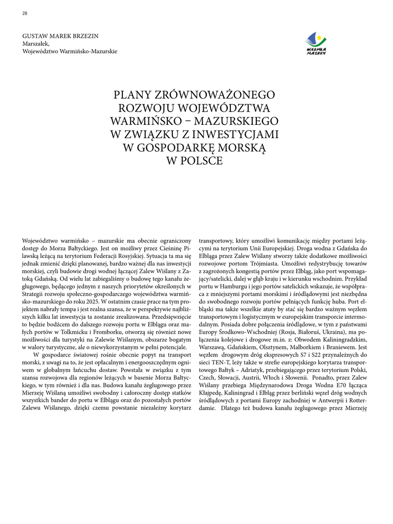 28 Gustaw Marek Brzezin Marszałek, Województwo Warmińsko-Mazurskie Plany zrównoważonego rozwoju Województwa Warmińsko – Mazurskiego w związku z inwestycjami w gospodarkę morską w Polsce Województwo warmińsko – mazurskie ma obecnie ograniczony dostęp do Morza Bałtyckiego. Jest on możliwy przez Cieśninę Pilawską leżącą na terytorium Federacji Rosyjskiej. Sytuacja ta ma się jednak zmienić dzięki planowanej, bardzo ważnej dla nas inwestycji morskiej, czyli budowie drogi wodnej łączącej Zalew Wiślany z Zatoką Gdańską. Od wielu lat zabiegaliśmy o budowę tego kanału żeglugowego, będącego jednym z naszych priorytetów określonych w Strategii rozwoju społeczno-gospodarczego województwa warmińsko-mazurskiego do roku 2025. W ostatnim czasie prace na tym projektem nabrały tempa i jest realna szansa, że w perspektywie najbliższych kilku lat inwestycja ta zostanie zrealizowana. Przedsięwzięcie to będzie bodźcem do dalszego rozwoju portu w Elblągu oraz małych portów w Tolkmicku i Fromborku, otworzą się również nowe możliwości dla turystyki na Zalewie Wiślanym, obszarze bogatym w walory turystyczne, ale o niewykorzystanym w pełni potencjale. W gospodarce światowej rośnie obecnie popyt na transport morski, z uwagi na to, że jest opłacalnym i energooszczędnym ogniwem w globalnym łańcuchu dostaw. Powstała w związku z tym szansa rozwojowa dla regionów leżących w basenie Morza Bałtyckiego, w tym również i dla nas. Budowa kanału żeglugowego przez Mierzeję Wiślaną umożliwi swobodny i całoroczny dostęp statków wszystkich bander do portu w Elblągu oraz do pozostałych portów Zalewu Wiślanego, dzięki czemu powstanie niezależny korytarz transportowy, który umożliwi komunikację między portami leżącymi na terytorium Unii Europejskiej. Droga wodna z Gdańska do Elbląga przez Zalew Wiślany stworzy także dodatkowe możliwości rozwojowe portom Trójmiasta. Umożliwi redystrybucję towarów z zagrożonych kongestią portów przez Elbląg, jako port wspomagający/satelicki, dalej w głąb kraju i w kierunku wschodnim. Przykład portu w Hamburgu i jego portów satelickich wskazuje, że współpraca z mniejszymi portami morskimi i śródlądowymi jest niezbędna do swobodnego rozwoju portów pełniących funkcję huba. Port elbląski ma także wszelkie atuty by stać się bardzo ważnym węzłem transportowym i logistycznym w europejskim transporcie intermodalnym. Posiada dobre połączenia śródlądowe, w tym z państwami Europy Środkowo-Wschodniej (Rosja, Białoruś, Ukraina), ma połączenia kolejowe i drogowe m.in. z: Obwodem Kaliningradzkim, Warszawą, Gdańskiem, Olsztynem, Malborkiem i Braniewem. Jest węzłem drogowym dróg ekspresowych S7 i S22 przynależnych do sieci TEN-T, leży także w strefie europejskiego korytarza transportowego Bałtyk – Adriatyk, przebiegającego przez terytorium Polski, Czech, Słowacji, Austrii, Włoch i Słowenii. Ponadto, przez Zalew Wiślany przebiega Międzynarodowa Droga Wodna E70 łącząca Kłajpedę, Kaliningrad i Elbląg przez berliński węzeł dróg wodnych śródlądowych z portami Europy zachodniej w Antwerpii i Rotterdamie. Dlatego też budowa kanału żeglugowego przez Mierzeję Potencjał rozwojowy Bałtyku Bałtyk dla wszystkich Wiślaną jest inwestycją uzasadnioną ekonomicznie i niesie za sobą olbrzymi potencjał rozwojowy dla sektorów przemysłowego i logistycznego w regionie, mających zdolność do kreowania dobrych i trwałych miejsc pracy. Wpłynie to pozytywnie na odbudowę i aktywizację potencjału społeczno-gospodarczego Elbląga oraz gmin z nim sąsiadujących. Bezpośredni dostęp do Bałtyku spowoduje także wzrost dostępności transportowej województwa i zwiększy jego atrakcyjność inwestycyjną, co przyciągnie nowych inwestorów, szczególnie mając na uwadze, iż przedsiębiorcy prowadzący działalność gospodarczą w Warmińsko – Mazurskiej Specjalnej Strefie Ekonomicznej korzystają z bardzo korzystnej formy opodatkowania. Równolegle do budowy drogi wodnej łączącej Zatokę Gdańską z Zalewem Wiślanym niezbędna jest rozbudowa infrastruktury elbląskiego portu i jego zaplecza. W Dokumencie Implementacyjnym do Strategii Rozwoju Transportu do 2020 roku (z perspektywą do 2030 roku), określającym m.in. niezbędne inwestycje morskie w poprawę konkurencyjności polskich portów morskich, znalazły się przedsięwzięcia przebudowy wejścia do portu w Elblągu, budowy obrotnicy dla statków, budowy bocznicy kolejowej i terminalu nr 2 w Elblągu oraz budowy nowego nabrzeża przy ul. Radomskiej przedłużenie terminala składowo - przeładunkowego. W wyniku ustaleń 29 z Rządem RP, inwestycje te ujęte zostały w Kontrakcie Terytorialnym dla Województwa Warmińsko - Mazurskiego podpisanym w 2014r. Liczymy na to, iż znajdzie się odpowiednie źródło finansowania tych inwestycji, gdyż ich realizacja będzie dodatkowym czynnikiem stymulującym rozwój gospodarczy regionu. Duży potencjał rozwojowy obszarów położonych nad Zalewem Wiślanym stanowi również turystyka. Najistotniejszą przyczyną niewykorzystywania dotychczas walorów turystycznych oraz atrakcji dziedzictwa kulturowego miejscowości nad nim położonych jest ograniczona dostępność Zalewu. Budowa kanału żeglugowego otworzy możliwości rozwoju mniejszych portów i przystani położonych nad Zalewem Wiślanym, np. Fromborka i Tolkmicka, uwalniając istotny potencjał gospodarczy otaczających je obszarów. Nowe możliwości dla turystyki i rekreacji wodnej będą istotnym czynnikiem aktywizacji gospodarczej gmin nadzalewowych, a wraz z rozwojem turystyki rozwijać się będą inne branże, m.in. przemysł rolno-spożywczy, usługi budowlano-remontowe dla małych jednostek pływających, czy hotelarstwo. Przewidujemy, iż planowane inwestycje morskie otworzą perspektywę stabilnego zrównoważonego rozwoju regionu, generującego nowe miejsca pracy, w rezultac