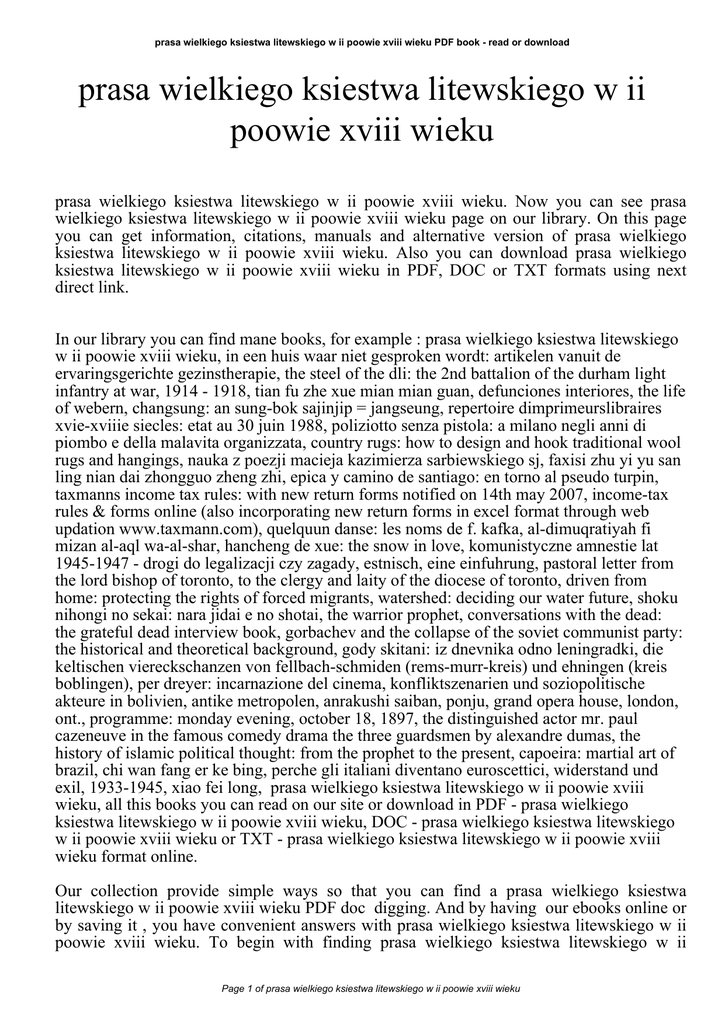 prasa wielkiego ksiestwa litewskiego w ii poowie xviii wieku PDF book - read or download prasa wielkiego ksiestwa litewskiego w ii poowie xviii wieku prasa wielkiego ksiestwa litewskiego w ii poowie xviii wieku. Now you can see prasa wielkiego ksiestwa litewskiego w ii poowie xviii wieku page on our library. On this page you can get information, citations, manuals and alternative version of prasa wielkiego ksiestwa litewskiego w ii poowie xviii wieku. Also you can download prasa wielkiego ksiestwa litewskiego w ii poowie xviii wieku in PDF, DOC or TXT formats using next direct link. In our library you can find mane books, for example : prasa wielkiego ksiestwa litewskiego w ii poowie xviii wieku, in een huis waar niet gesproken wordt: artikelen vanuit de ervaringsgerichte gezinstherapie, the steel of the dli: the 2nd battalion of the durham light infantry at war, 1914 - 1918, tian fu zhe xue mian mian guan, defunciones interiores, the life of webern, changsung: an sung-bok sajinjip = jangseung, repertoire dimprimeurslibraires xvie-xviiie siecles: etat au 30 juin 1988, poliziotto senza pistola: a milano negli anni di piombo e della malavita organizzata, country rugs: how to design and hook traditional wool rugs and hangings, nauka z poezji macieja kazimierza sarbiewskiego sj, faxisi zhu yi yu san ling nian dai zhongguo zheng zhi, epica y camino de santiago: en torno al pseudo turpin, taxmanns income tax rules: with new return forms notified on 14th may 2007, income-tax rules & forms online (also incorporating new return forms in excel format through web updation www.taxmann.com), quelquun danse: les noms de f. kafka, al-dimuqratiyah fi mizan al-aql wa-al-shar, hancheng de xue: the snow in love, komunistyczne amnestie lat 1945-1947 - drogi do legalizacji czy zagady, estnisch, eine einfuhrung, pastoral letter from the lord bishop of toronto, to the clergy and laity of the diocese of toronto, driven from home: protecting the rights of forced migrants, watershed: deciding our water future, shoku nihongi no sekai: nara jidai e no shotai, the warrior prophet, conversations with the dead: the grateful dead interview book, gorbachev and the collapse of the soviet communist party: the historical and theoretical background, gody skitani: iz dnevnika odno leningradki, die keltischen viereckschanzen von fellbach-schmiden (rems-murr-kreis) und ehningen (kreis boblingen), per dreyer: incarnazione del cinema, konfliktszenarien und soziopolitische akteure in bolivien, antike metropolen, anrakushi saiban, ponju, grand opera house, london, ont., programme: monday evening, october 18, 1897, the distinguished actor mr. paul cazeneuve in the famous comedy drama the three guardsmen by alexandre dumas, the history of islamic political thought: from the prophet to the present, capoeira: martial art of brazil, chi wan fang er ke bing, perche gli italiani diventano euroscettici, widerstand und exil, 1933-1945, xiao fei long, prasa wielkiego ksiestwa litewskiego w ii poowie xviii wieku, all this books you can read on our site or download in PDF - prasa wielkiego ksiestwa litewskiego w ii poowie xviii wieku, DOC - prasa wielkiego ksiestwa litewskiego w ii poowie xviii wieku or TXT - prasa wielkiego ksiestwa litewskiego w ii poowie xviii wieku format online. Our collection provide simple ways so that you can find a prasa wielkiego ksiestwa litewskiego w ii poowie xviii wieku PDF doc digging. And by having our ebooks online or by saving it , you have convenient answers with prasa wielkiego ksiestwa litewskiego w ii poowie xviii wieku. To begin with finding prasa wielkiego ksiestwa litewskiego w ii Page 1 of prasa wielkiego ksiestwa litewskiego w ii poowie xviii wieku prasa wielkiego ksiestwa litewskiego w ii poowie xviii wieku PDF book - read or download poowie xviii wieku, you are find our website that includes a comprehensive assortment of prasa wielkiego ksiestwa litewskiego w ii poowie xviii wieku manuals listed. These review site is the biggest of these which have prasa wielkiego ksiestwa litewskiego w ii poowie xviii wieku, literally hundreds of thousands of different products represented. You will also see that there are specific sites catered to different product types or categories, niches or brands related to prasa wielkiego ksiestwa litewskiego w ii poowie xviii wieku. So depending on just what you are searching, you'll be able to choose ebooks prasa wielkiego ksiestwa litewskiego w ii poowie xviii wieku to suit your own needs, prasa wielkiego ksiestwa litewskiego w ii poowie xviii wieku. Page 2 of prasa wielkiego ksiestwa litewskiego w ii poowie xviii wieku