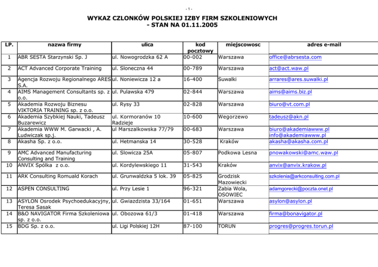 -1- WYKAZ CZLONKÓW POLSKIEJ IZBY FIRM SZKOLENIOWYCH - STAN NA 01.11.2005 LP. 1 ABR SESTA Starzynski Sp. J ul. Nowogrodzka 62 A kod miejscowosc pocztowy 00-002 Warszawa 2 ACT Advanced Corporate Training ul. Sloneczna 44 00-789 Warszawa [email protected] 3 Agencja Rozwoju Regionalnego ARES ul. Noniewicza 12 a S.A. AIMS Management Consultants sp. z ul. Pulawska 479 o.o. Akademia Rozwoju Biznesu ul. Rysy 33 VIKTORIA TRAINING sp. z o.o. Akademia Szybkiej Nauki, Tadeusz ul. Kormoranów 10 Buzarewicz Radzieje Akademia WWW M. Garwacki , A. ul Marszalkowska 77/79 Ludwiczak sp.j. Akasha Sp. z o.o. ul. Hetmanska 14 16-400 Suwalki [email protected] 02-844 Warszawa [email protected] 02-828 Warszawa [email protected] 10-600 Wegorzewo [email protected] 00-683 Warszawa [email protected] [email protected] [email protected] ul. Slowicza 25A 05-807 Podkowa Lesna [email protected] 10 AMC Advanced Manufacturing Consulting and Training ANVIX Spólka z o.o. ul. Kordylewskiego 11 31-543 Kraków [email protected] 11 ARK Consulting Romuald Korach ul. Grunwaldzka 5 lok. 39 05-825 [email protected] 12 ASPEN CONSULTING ul. Przy Lesie 1 96-321 13 ASYLON Osrodek Psychoedukacyjny, ul. Gwiazdzista 33/164 Teresa Sasak B&O NAVIGATOR Firma Szkoleniowa ul. Obozowa 61/3 sp. z o.o. BDG Sp. z o.o. ul. Ligi Polskiej 12H 01-651 Grodzisk Mazowiecki Zabia Wola, OSOWIEC Warszawa 01-418 Warszawa [email protected] 87-100 TORUN [email protected] 4 5 6 7 8 9 14 15 nazwa firmy ulica 30-528 Kraków adres e-mail [email protected] [email protected] [email protected] 16 BERNDSON Sp. z o.o. ul. 3-go Maja 9 30-062 Kraków [email protected] -2- 17 BIB Bozydar Marcin Blecki ul. Pstrowskiego 14 B/85 10-602 Olsztyn [email protected] 18 BMM Sp. z o.o. ul. 8 Marca 3 35-065 Rzeszów [email protected] 19 10-900 Olsztyn [email protected] 20 British Class s.c., M. Jamiolkowski, R. ul. Westerplatte 2/1 Pieczkowski, A. Sobota Business Center 1.Anna Kepka (BC1) ul. Staromiejska 2/7 40-013 Katowice [email protected] 21 CADExpert Sp. z o.o. ul. Zeromskiego 94 C 90-550 Lódz [email protected] 22 CEGOS Polska sp. z o.o. ul. Swietojerska 5/7 00-236 Warszawa [email protected] 23 05-807 Podkowa Lesna - 00-682 Warszawa [email protected] 25 Centrum Biznesu w Podkowie Lesnej ul. Mickiewicza 10 Sp. z o.o. Centrum Doskonalenia Zarzadzania ul. Hoza 66/68 MERITUM Sp. z o.o. Centrum Edukacji EKSPERT ul. Stawki 14 00-178 Warszawa [email protected] 26 Centrum Edukacji Grupa ORLEN 09-400 Plock [email protected] 27 Centrum Edukacji Logistycznej Sp. z ul. Estkowskiego 6 o.o. Centrum Edukacji Psychologicznej ul. Francuska 30 FENIX Centrum Kreowania Liderów S.A. - 61-755 Poznan [email protected] 03-905 Warszawa [email protected] 05-824 Kludzienko k. Warszawy Centrum Ksztalcenia Menedzerów Przemyslowych Sp. z o.o. w Lublinie Centrum Organizacji Szkolen Menedzerskich Centrum Rozwiazan Menedzerskich S.A. Centrum Szkoleniowe FRR Sp. z o.o. ul. Bursaki 12 20-150 Lublin [email protected] [email protected] [email protected] [email protected] ul. Kwitnaca 5/52 01-926 Warszawa [email protected] ul. Batalionu Platerówek 3 03-308 WARSZAWA [email protected] ul. Nowogrodzka 4 lok. 7 i 8 00-513 Warszawa [email protected] 24 28 29 30 31 32 33 ul. Kobylinskiego 25 34 Kepa k/Opola [email protected] Warszawa [email protected] Szarlejaka ul. Lukaszewicza 42-221 112 ul. Obronców 2B 03-933 Czestochowa [email protected] Warszawa ul. Staszica 2 05-092 Lomianki [email protected] [email protected] [email protected] 30-103 Kraków [email protected] 40 Compendium - Centrum Edukacyjne ul. Tatarska 5 Sp. z o.o. COMPUTER SERVICE SUPPORT S.A. ul. Jagiellonska 78 03-301 Warszawa [email protected] 41 Consult Malopolski Instytut NLP 31-049 Kraków [email protected] 42 CS Szkolenia i Doradztwo Sp. z o.o. ul. Minerska 16 04-506 Warszawa [email protected] 43 Denis' School Sp z o.o. Al. Jana Pawla II 12 00-124 Warszawa [email protected] 44 DICORIA Grupa Doradcza ul. Godebskiego 61 05-420 Józefów [email protected] 45 ul. Lazara 19 41-608 Swietochlowice [email protected] [email protected] ul. Szewska 74/3 50-121 Wroclaw 47 DMD CENTRUM SZKOLENIOWE A. Kempinska i M. Klimontowicz Sp. J DOCTOR CONSULTING Quality Management Business Processes Sp.z o.o. DOOR Poland Sp. z o.o. ul Wlodarzewska 33 03-384 Warszawa [email protected] 48 DSMG Management Consulting ul. J.J. Rostafinskich 4 02-593 Warszawa [email protected] 49 EGERIA CONSULTING W. L. Szymczak Sp. J. EKOLOGUS Sp. z o.o. ul. Chopina 8 66-300 Miedzyrzecz [email protected] ul. Karpacka 22 43-300 Bielsko-Biala [email protected] 35 36 37 38 39 46 50 Centrum Szkoleniowo-Konsultingowe KONCEPT Krzysztof Wisniak CERTUS Centrum Szkolenia i Doradztwa Sp. z o.o. Cezary Radomski CHILTERN CONSULTANCY INTERNATIONAL POLSKA Sp. z o.o. COMARTIN - Marcin Chodorowski ul. Kasztanowa 16 46-022 -3- ul. Dobrowoja 11 ul. Sw. Sebastiana 20/12 04-003 51 52 EUREKA Niepubliczna Placówka Doskonalenia i Doksztalcania Pracowników Szkolnictwa , Sluzby Zdrowia i Opieki Spolecznej , Jan Zareba Euro - Konsultant Sp. z o.o. 53 EUROFINANCE TRAINING SP. Z O.O. ul. Chalubinskiego 8 54 Europejski Instytut Rozwoju Kadr Sp. ul. z o.o. Europejski Instytut Szkolen ul. „COMPENDIUM” Europejskie Centrum Ksztalcenia ul. Zawodowego "Eureka" Europejskie Stowarzyszenie Badan i ul. Rozwoju Inzynierii Informacji, Psychocybernetyki i NLP "COGITATE" EUROPEX Sp. z o.o. ul. 55 56 57 58 59 ul. Czeremchowa 12/21 20-807 Lublin -4- Al. Pokoju 81 31-564 KRAKÓW 00-613 WARSZAWA [email protected] [email protected] [email protected] Dzieci Warszawy 31/12 02-495 Warszawa [email protected] Spóldzielców 12/134 30-682 KRAKÓW [email protected] Mickiewicza 36 20-466 Lublin [email protected] Widok 19/187 00-026 Warszawa [email protected] Meissnera 19 31-457 Kraków [email protected] ul Zgrupowania Zyrafa 3/14 01-877 Warszawa [email protected] ul. Krasinskiego 29 40-019 Katowice [email protected] Al. KEN 94/19 02-722 Warszawa [email protected] 62 EWOLUCJA M. Borek W. Dmitriew s. j. EXBIS-Eksperci Biznesmenom Siewierski, S