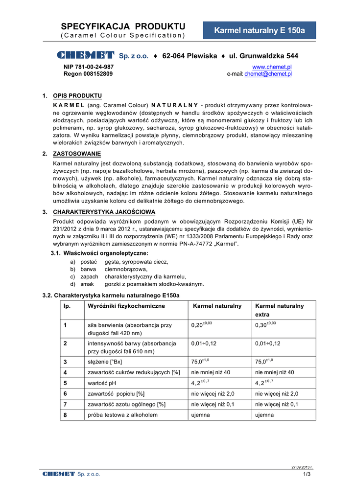 SPECYFIKACJA PRODUKTU Karmel naturalny E 150a (Caramel Colour Specification) CHEMET Sp. z o.o. ♦ 62-064 Plewiska ♦ ul. Grunwaldzka 544 NIP 781-00-24-987 Regon 008152809 www.chemet.pl e-mail: [email protected] 1. OPIS PRODUKTU K A R M E L (ang. Caramel Colour) N A T U R A L N Y - produkt otrzymywany przez kontrolowane ogrzewanie węglowodanów (dostępnych w handlu środków spożywczych o właściwościach słodzących, posiadających wartość odżywczą, które są monomerami glukozy i fruktozy lub ich polimerami, np. syrop glukozowy, sacharoza, syrop glukozowo-fruktozowy) w obecności katalizatora. W wyniku karmelizacji powstaje płynny, ciemnobrązowy produkt, stanowiący mieszaninę wielorakich związków barwnych i aromatycznych. 2. ZASTOSOWANIE Karmel naturalny jest dozwoloną substancją dodatkową, stosowaną do barwienia wyrobów spożywczych (np. napoje bezalkoholowe, herbata mrożona), paszowych (np. karma dla zwierząt domowych), używek (np. alkohole), farmaceutycznych. Karmel naturalny odznacza się dobrą stabilnością w alkoholach, dlatego znajduje szerokie zastosowanie w produkcji kolorowych wyrobów alkoholowych, nadając im różne odcienie koloru żółtego. Stosowanie karmelu naturalnego umożliwia uzyskanie koloru od delikatnie żółtego do ciemnobrązowego. 3. CHARAKTERYSTYKA JAKOŚCIOWA Produkt odpowiada wyróżnikom podanym w obowiązującym Rozporządzeniu Komisji (UE) Nr 231/2012 z dnia 9 marca 2012 r., ustanawiającemu specyfikacje dla dodatków do żywności, wymienionych w załączniku II i III do rozporządzenia (WE) nr 1333/2008 Parlamentu Europejskiego i Rady oraz wybranym wyróżnikom zamieszczonym w normie PN-A-74772 „Karmel”. 3.1. Właściwości organoleptyczne: a) postać gęsta, syropowata ciecz, b) barwa ciemnobrązowa, c) zapach charakterystyczny dla karmelu, gorzki z posmakiem słodko-kwaśnym. d) smak 3.2. Charakterystyka karmelu naturalnego E150a Ip. Wyróżniki fizykochemiczne Karmel naturalny Karmel naturalny extra 1 siła barwienia (absorbancja przy długości fali 420 nm) 0,20 ±0,03 0,30 ±0,03 2 intensywność barwy (absorbancja przy długości fali 610 nm) 0,01÷0,12 0,01÷0,12 3 stężenie [°Bx] 75,0±1,0 75,0±1,0 4 zawartość cukrów redukujących [%] nie mniej niż 40 nie mniej niż 40 ±0,7 4 ,2 ± 0 , 7 5 wartość pH 4 ,2 6 zawartość popiołu [%] nie więcej niż 2,0 nie więcej niż 2,0 7 zawartość azotu ogólnego [%] nie więcej niż 0,1 nie więcej niż 0,1 8 próba testowa z alkoholem ujemna ujemna 27.09.2013 r. CHEMET Sp. z o.o. 1/3 SPECYFIKACJA PRODUKTU (Caramel Colour Specification) Karmel naturalny E 150a 3.3 Zawartość metali szkodliwych dla zdrowia Zawartość metali szkodliwych dla zdrowia nie może przekraczać: a) arsenu : 1 m g/kg b) ołowiu : 2 mg/kg c) kadmu : 1 m g/kg d) rtęci : 1 m g/kg 4. BADANIA Producent przeprowadza badania pełne raz na rok lub w przypadku zmian w procesie technologicznym. Badania niepełne wykonuje się w każdej partii produkcyjnej. 4.1. Badania pełne Badania pełne obejmują oznaczenia wg pkt. 3.1; 3.2; 3.3. 4.2. Badania niepełne Badania niepełne obejmują oznaczenia wg pkt. 3.1; 3.2 a), c), d), e). 5. INFORMACJA ŻYWIENIOWA Wartość energetyczna w 100 g Węglowodany [%] w tym cukry GMO Alergeny - : : : 775 kJ/182 kcal 45 40 produkt nie zawiera GMO. produkt nie zawiera składników alergennych. 6. PODSTAWA PRAWNA • Rozporządzenie Parlamentu Europejskiego i Rady (WE) nr 1333/2008 z dnia 16 grudnia 2008 r. w sprawie dodatków do żywności. • Rozporządzenie Parlamentu Europejskiego i Rady (WE) nr 1331/2008 z dnia 16 grudnia 2008 r. ustanawiające jednolitą procedurę wydawania zezwoleń na stosowanie dodatków do żywności, enzymów spożywczych i środków aromatyzujących. • Rozporządzenie Ministra Zdrowia z dnia 23 grudnia 2010 r. w sprawie specyfikacji i kryteriów czystości substancji dodatkowych. • Compendium of Food Additive Specification FAO/WHO Expert Committee on Food Additives, 74th Meeting 2011. • Rozporządzenie Komisji (UE) Nr 231/2012 z dnia 9 marca 2012 r. ustanawiające specyfikacje dla dodatków do żywności wymienionych w załączniku II i III do rozporządzenia (WE) nr 1333/2008 Parlamentu Europejskiego i Rady. 7. PAKOWANIE Karmel rozlewany jest w następujące opakowania: ü pojemniki o masie netto 1 kg, ü wiadra z polipropylenu lub z polietylenu o masie netto 12 lub 40 kg, ü paleto-pojemniki z HDPE o masie netto od 800 do 1200 kg lub inne pojemniki - w uzgodnieniu z odbiorcą. 8. ETYKIETA Na opakowaniach umieszcza się etykietę zawierającą następujące dane: nazwę i adres producenta, oznaczenie produktu, nr normy, masę netto w kg, numer partii, datę mini- „najlepiej spożyć przed końcem…”, informację: „barwnik przeznaczony do produkcji środków spożywczych”. malnej trwałości poprzedzonej wyrazami 27.09.2013 r. CHEMET Sp. z o.o. 2/3 SPECYFIKACJA PRODUKTU (Caramel Colour Specification) Karmel naturalny E 150a 9. OKRES PRZYDATNOŚCI I WARUNKI PRZECHOWYWANIA • Okres przydatności do spożycia - 12 miesięcy od daty produkcji w nieotwartych opakowaniach. • Warunki przechowywania - w pomieszczeniach magazynowych zamkniętych. Przechowywać w temperaturze pokojowej w szczelnie zamkniętych opakowaniach, chronić przed działaniem światła i powietrza, nie zamrażać. Magazyny powinny być suche, czyste, bez obcych zapachów i zabezpieczone przed szkodnikami. Data opracowania: 27.09.2013 r. Data aktualizacji: 01.02.2017 r. */ W przeliczeniu na ekwiwalent bazy barwnika, tzn. w przeliczeniu na produkt o intensywności barwy wynoszącej 0,1 jednostek absorbancji. 27.09.2013 r. CHEMET Sp. z o.o. 3/3