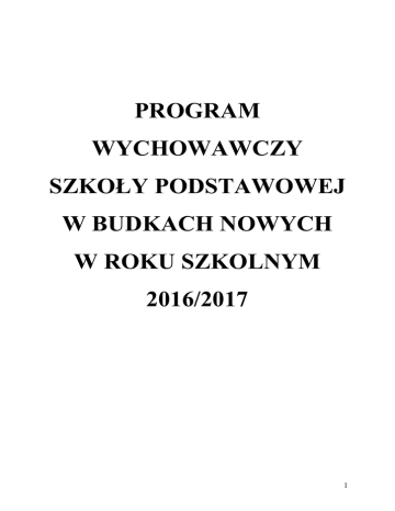 PROGRAM WYCHOWAWCZY SZKOŁY PODSTAWOWEJ W BUDKACH NOWYCH W ROKU SZKOLNYM 2016/2017 1 Nadrzędnym naszym celem wychowawczym jest wszechstronny rozwój osobowy ucznia tak zarówno w wymiarze intelektualnym jak i psychicznym, społecznym, moralnym, duchowym i estetycznym. Pragniemy wykształcić w naszych uczniach takie cechy osobowości jak: pracowitość, uczciwość, rzetelność, wytrwałość, samodzielność, poczucie odpowiedzialności, umiejętne przezwyciężanie trudności, przedsiębiorczość, krytycyzm, odwaga cywilna, tolerancja. Będziemy przygotowywać uczniów do zgodnego współżycia z innymi ludźmi, do aktywnego znalezienia się w życiu gospodarczym, gotowych do podjęcia obowiązków wobec ojczyzny. Wychowanie opieramy na wartościach będących dziedzictwem kulturowym całej ludzkości. Wychowanie nierozerwalnie łączymy z wiedzą i kreowaniem umiejętności. Nasze oddziaływania wychowawcze realizowane będą na wszystkich zajęciach edukacyjnych i przez wszystkich nauczycieli. I. CELE WYCHOWANIA 1. Kształtowanie pozytywnego nastawienia do wiedzy jako wartości. 2. Tworzenie kultury pozytywnych wzorów. 3. Dążenie do rozbudowania i rozwijania zainteresowań uczniów poprzez uczestnictwo w zajęciach pozalekcyjnych. 4. Wspieranie rozwoju psychicznego uczniów i wyposażenia ich w umiejętności interpersonalne. 5. Motywowanie rodziców do współpracy ze szkołą. 6. Pomoc rodzinie w wychowaniu. 7. Poznawanie reguł życia społecznego jako przygotowanie do pełnienia ról w społeczności lokalnej. 8. Współpraca z instytucjami, stowarzyszeniami i organizacjami środowiskowymi. 9. Rozwój działalności sportowej, rekreacyjnej i turystycznej. 10. Ochrona przed negatywnym wpływem mediów i sekt. 11. Przeciwdziałanie przestępczości nieletnich poprzez bieżące obserwacje zagrożeń i podejmowanie działań zapobiegawczych. 12. Propagowanie edukacji prozdrowotnej jako formy zapobiegania uzależnieniom. 13. Przygotowanie do podjęcia nauki w gimnazjum. 14. Program adaptacyjny 2 Treści wychowawcze zawarte w Statucie szkoły . 1. Kształtowanie środowiska wychowawczego sprzyjającego realizowaniu celów i zasad ujętych w Ustawie o Systemie Oświaty, stosowane do warunków szkoły i wieku ucznia poprzez: · zapewnienie odpowiedniej bazy dydaktycznej szkoły; · systematycznego diagnozowania i obserwowania zachowań uczniów; · realizowanie programu wychowawczego szkoły. 2. Nauczyciel wspomaga rozwój psychiczny ucznia poprzez prowadzenie różnorodnych form oddziaływań w ramach zajęć pozalekcyjnych. 3. Uczeń ma prawo: · poszanowania swojej godności; · rozwijania zainteresowań godności talentów; · swobody wyrażania myśli i przekonań o ile nie naruszają one dobra osobistego innych; · życzliwego podmiotowego traktowania w procesie dydaktyczno-wychowawczym; nienaruszalności osobistej; II. SZKOŁA ŚRODOWISKIEM WYCHOWAWCZYM . MISJA Dobre wychowanie, rzetelna nauka, świetna zabawa. Jesteśmy po to, aby dobrze wychować powierzona nam przez rodziców dzieci i przekazywać im rzetelną prawdę o otaczającym świecie. Uczniowie są naszymi partnerami, a ich potrzeby ukierunkowują nasze działania. Chcemy służyć im wiedzą pedagogiczną, życiowym doświadczeniem oraz własnym przykładem. Chcemy zdobywać ich przyjaźń i zaufanie. Naszą dewizą jest dobro dziecka. Jesteśmy po to, aby: -nauczać, wychowywać i inspirować do podejmowania wysiłku poznawczego i intelektualnego -podejmować wysiłek poznawczy i intelektualny rozbudzać ciekawość świata i otwartość na zmiany w nim zachodzące 3 -dopingować do różnorodnych twórczych inicjatyw -kształtować poczucie odpowiedzialności za podjęte działania i przyjęte na siebie obowiązki -uczyć obiektywnej oceny własnych poczynań - rozwijać więzi interpersonalne, umiejętność pracy w zespole wpajać zasady tolerancji, poszanowania cudzej odmienności- inności -umacniać wiarę we własne siły, w realność sukcesu w różnych dziedzinach życia zgodnie -z jednostkowymi predyspozycjami -kształtować umiejętności radzenia sobie w trudnych sytuacjach -wskazywać na interesujące formy spędzania wolnego czasu, sprzyjające wszechstronnemu rozwojowi dziecka i rozładowujące napięcia emocjonalne WIZJA Absolwent naszej szkoły umie odnaleźć się we współczesnym świecie, przestrzega zasad tolerancji i prawdziwej komunikacji oraz dąży do dalszego swojego rozwoju, wykorzystując zdobytą wiedzę i umiejętności. Szkoła drugim domem ucznia. Nasza szkoła to miejsce, w którym każdy uczeń ma szansę stać się wartościowym, pogodnym, otwartym na dobro i piękno człowiekiem. Szkoła, do, której zmierzamy powinna: Rozbudzać ciekawość świata i otwartość na zmiany w nim zachodzące. Dopingować do różnorodnych twórczych inicjatyw, kształtować poczucie odpowiedzialności za podjęte działania i przyjęte na siebie obowiązki oraz uczyć obiektywnej oceny własnych poczynań. Przygotowywać do życia dając uczniom umiejętność: dobrego komunikowania się ze światem; samodzielnego uczenia się; ufności we własne siły; zaradności w trudnych sytuacjach, orientacji w środowisku społecznym i przyrodniczym. Być demokratyczna – sprawiedliwa, wychowująca do demokracji, przestrzegająca praw dziecka i ucznia, samorządowa, wrażliwa na opinie uczniów i rodziców, posiadająca radę pedagogiczną podejmującą decyzje wspólnie z dyrektorem. 4 Być przyjazna uczniom, wolna od przemocy, powinna zapewniać bezpieczeństwo i właściwą atmosferę podczas pobytu dziecka w szkole, rozwijać umiejętność pracy w zespole oraz wpajać zasady tolerancji. Dawać uczniom i ich rodzicom czytelną ocenę osiągnięć i wysiłków, pobudzać do dalszego rozwoju umiejętności i zainteresowań. Być otwarta – integrować środowisko lokalne i współpracować z różnymi instytucjami wspomagającymi jej działania. Wspomagać rodziców w procesie wychowawczym, kszta
