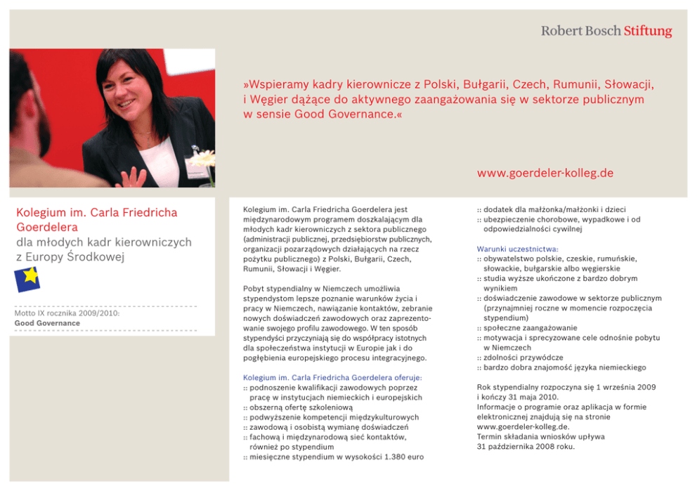 »Wspieramy kadry kierownicze z Polski, Bułgarii, Czech, Rumunii, Słowacji, i Węgier dążące do aktywnego zaangażowania się w sektorze publicznym w sensie Good Governance.« www.goerdeler-kolleg.de Kolegium im. Carla Friedricha Goerdelera dla młodych kadr kierowniczych z Europy Środkowej Motto IX rocznika 2009/2010: Good Governance Kolegium im. Carla Friedricha Goerdelera jest międzynarodowym programem doszkalającym dla młodych kadr kierowniczych z sektora publicznego (administracji publicznej, przedsiębiorstw publicznych, organizacji pozarządowych działających na rzecz pożytku publicznego) z Polski, Bułgarii, Czech, Rumunii, Słowacji i Węgier. Pobyt stypendialny w Niemczech umożliwia stypendystom lepsze poznanie warunków życia i pracy w Niemczech, nawiązanie kontaktów, zebranie nowych doświadczeń zawodowych oraz zaprezentowanie swojego profilu zawodowego. W ten sposób stypendyści przyczyniają się do współpracy istotnych dla społeczeństwa instytucji w Europie jak i do pogłębienia europejskiego procesu integracyjnego. Kolegium im. Carla Friedricha Goerdelera oferuje: ::podnoszenie kwalifikacji zawodowych poprzez pracę w instytucjach niemieckich i europejskich ::obszerną ofertę szkoleniową ::podwyższenie kompetencji międzykulturowych ::zawodową i osobistą wymianę doświadczeń ::fachową i międzynarodową sieć kontaktów, również po stypendium ::miesięczne stypendium w wysokości 1.380 euro ::dodatek dla małżonka/małżonki i dzieci ::ubezpieczenie chorobowe, wypadkowe i od odpowiedzialności cywilnej Warunki uczestnictwa: ::obywatelstwo polskie, czeskie, rumuńskie, słowackie, bułgarskie albo węgierskie ::studia wyższe ukończone z bardzo dobrym wynikiem ::doświadczenie zawodowe w sektorze publicznym (przynajmniej roczne w momencie rozpoczęcia stypendium) ::społeczne zaangażowanie ::motywacja i sprecyzowane cele odnośnie pobytu w Niemczech ::zdolności przywódcze ::bardzo dobra znajomość języka niemieckiego Rok stypendialny rozpoczyna się 1 września 2009 i kończy 31 maja 2010. Informacje o programie oraz aplikacja w formie elektronicznej znajdują się na stronie www.goerdeler-kolleg.de. Termin składania wniosków upływa 31 października 2008 roku. Good Governance Mottem przewodnim rocznika 2009/2010 jest „Good Governance“ (dobre rządzenie). Good Governance jest symbolem skutecznych instytucji politycznych jak i opowiedzialnego traktowania politycznej władzy i zasobów publicznych przez państwo. Chodzi również o nowe zrozumienie rządu i administracji, które obejmuje wspólnotowe zarządzanie rozwojem społecznym integrującym gospodarkę i społeczeństwo obywatelskie jak i opiera się na koncepcji państwa aktywizującego. »Dlatego pożądane jest połączenie krajów europejskich w jeden związek państw. Jego celem powinno być uniemożliwienie powrotu wojny w Europie.« Carl Friedrich Goerdeler, 1943 »Dobrego rządzenia i trwałego rozwoju nie da się od siebie oddzielić.« Kofi Annan Carl Friedrich Goerdeler Carl Friedrich Goerdeler, z wykształcenia prawnik administracyjny, piastował od roku 1930 do 1936 funkcję burmistrza Lipska jako jeden z niewielu prezydentów dużego miasta bez legitymacji NSDAP. Po dymisji zajmował się nawiązywaniem kontaktów dla firmy Bosch z berlińskimi urzędami. Dopiero zatrudnienie przez Roberta Boscha umożliwiło mu działalność w ruchu oporu przeciw reżimowi nazistowskiemu. Jako współzałożyciel kręgu spiskowców przeciwko reżimowi III Rzeszy opracował on w swoich pismach nowy porządek polityczny i plany Unii Europejskiej. Po nieudanym zamachu z 20 lipca 1944, przewidziany na nowego kanclerza Rzeszy Goerdeler został stracony 2 lutego 1945 w Berlinie za zdradę i polityczną działalność szpiegowską. Robert Bosch Stiftung Fundacja im. Roberta Boscha jest jedną z największych politycznie niezależnych fundacji w Niemczech związanych z przemysłem. Została założona w roku 1964 i kontynuuje realizację ideałów społecznych założyciela firmy i fundatora Roberta Boscha. Swoją działalność fundacja koncentruje na porozumieniu między narodami, nauce i ochronie zdrowia. Centrum Europy Środkowo-Wschodniej przy DGAP Centrum Europy Środkowo-Wschodniej Fundacji Roberta Boscha przy DGAP (Niemieckim Towa rzystwie Polityki Zagranicznej) zajmuje się koncepcjami i realizacją międzynarodowych projektów w kontekście aktualnych problemów jak i analizą politycznych procesów oraz społecznymi debatami w Europie Środkowej. Ponadto DGAP opiekuje się i wspiera kilka programów Fundacji, w przypadku kolegium im. Carla Friedricha Goerdelera Centrum koordynuje rekrutację stypendystów oraz planowanie i organizowanie seminariów. Kierownik programu Markus Lux telefon +49 (0) 711/460 84-39 telefaks +49 (0) 711/460 84-158 [email protected] www.bosch-stiftung.de, www.goerdeler-kolleg.de Robert Bosch Stiftung GmbH Heidehofstraße 31 70184 Stuttgart Niemcy Dla osób ubiegających się Marie-Lena May telefon +49 (0) 30/25 42 31-13 telefaks +49 (0) 30/25 42 31-16 [email protected] www.dgap.org Deutsche Gesellschaft für Auswärtige Politik e. V. Zentrum für Mittel- und Osteuropa der Robert Bosch Stiftung Rauchstraße 17/18 10787 Berlin Niemcy