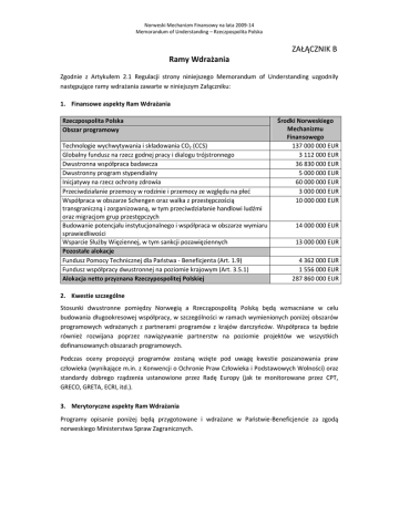 Norweski Mechanizm Finansowy na lata 2009-14 Memorandum of Understanding – Rzeczpospolita Polska ZAŁĄCZNIK B Ramy Wdrażania Zgodnie z Artykułem 2.1 Regulacji strony niniejszego Memorandum of Understanding uzgodniły następujące ramy wdrażania zawarte w niniejszym Załączniku: 1. Finansowe aspekty Ram Wdrażania Rzeczpospolita Polska Obszar programowy Technologie wychwytywania i składowania CO2 (CCS) Globalny fundusz na rzecz godnej pracy i dialogu trójstronnego Dwustronna współpraca badawcza Dwustronny program stypendialny Inicjatywy na rzecz ochrony zdrowia Przeciwdziałanie przemocy w rodzinie i przemocy ze względu na płeć Współpraca w obszarze Schengen oraz walka z przestępczością transgraniczną i zorganizowaną, w tym przeciwdziałanie handlowi ludźmi oraz migracjom grup przestępczych Budowanie potencjału instytucjonalnego i współpraca w obszarze wymiaru sprawiedliwości Wsparcie Służby Więziennej, w tym sankcji pozawięziennych Pozostałe alokacje Fundusz Pomocy Technicznej dla Państwa - Beneficjenta (Art. 1.9) Fundusz współpracy dwustronnej na poziomie krajowym (Art. 3.5.1) Alokacja netto przyznana Rzeczypospolitej Polskiej Środki Norweskiego Mechanizmu Finansowego 137 000 000 EUR 3 112 000 EUR 36 830 000 EUR 5 000 000 EUR 60 000 000 EUR 3 000 000 EUR 10 000 000 EUR 14 000 000 EUR 13 000 000 EUR 4 362 000 EUR 1 556 000 EUR 287 860 000 EUR 2. Kwestie szczególne Stosunki dwustronne pomiędzy Norwegią a Rzecząpospolitą Polską będą wzmacniane w celu budowania długookresowej współpracy, w szczególności w ramach wymienionych poniżej obszarów programowych wdrażanych z partnerami programów z krajów darczyńców. Współpraca ta będzie również rozwijana poprzez nawiązywanie partnerstw na poziomie projektów we wszystkich dofinansowanych obszarach programowych. Podczas oceny propozycji programów zostaną wzięte pod uwagę kwestie poszanowania praw człowieka (wynikające m.in. z Konwencji o Ochronie Praw Człowieka i Podstawowych Wolności) oraz standardy dobrego rządzenia ustanowione przez Radę Europy (jak te monitorowane przez CPT, GRECO, GRETA, ECRI, itd.). 3. Merytoryczne aspekty Ram Wdrażania Programy opisanie poniżej będą przygotowane i wdrażane w Państwie-Beneficjencie za zgodą norweskiego Ministerstwa Spraw Zagranicznych. Norweski Mechanizm Finansowy na lata 2009-14 Memorandum of Understanding – Rzeczpospolita Polska A. Obszar programowy: Technologie wychwytywania i składowania CO2 (CCS) (obszar programowy nr 20) Program: Wsparcie rozwoju i szerokiego stosowania technologii CCS w Polsce Rezultaty: Wychwycony i bezpiecznie zmagazynowany CO2 Pogłębiona wiedza i międzynarodowa współpraca w obszarze technologii CCS Operator Programu: Ministerstwo Gospodarki Partner programu z krajów darczyńców: Gassnova Projekt(y) predefiniowane: wsparcie przede wszystkim budowy instalacji CCS w Elektrowni Bełchatów oraz zwiększenie świadomości społecznej w zakresie technologii CCS B. Obszar programowy: Globalny fundusz na rzecz godnej pracy i dialogu trójstronnego (obszar programowy nr 22) Program: Globalny fundusz na rzecz godnej pracy i dialogu trójstronnego Cel: Promowanie godnej pracy i poprawa współpracy trójstronnej między organizacjami pracodawców, związkami zawodowymi i władzami publicznymi przy wspieraniu sprawiedliwego i zrównoważonego rozwoju gospodarczego i społecznego Rezultaty: Poprawa struktur i praktyk w zakresie dialogu społecznego i dialogu trójstronnego Lepsze zrozumienie korzyści płynących z godnej pracy Lepszy dostęp do zatrudnienia i uczestnictwo na rynku pracy Większa koncentracja na wymiarze społecznym mobilności siły roboczej Wspieranie równości płci i zwalczanie dyskryminacji w miejscu pracy Poprawa równowagi między pracą a życiem prywatnym i rodzinnym Większe zdolności adaptacyjne i możliwości kształcenia ustawicznego pracownika Operator Programu: Innovation Norway C. Obszar programowy: Dwustronna współpraca badawcza (obszar programowy nr 23) Program: Norwesko - Polska Współpraca Badawcza (program partnerski z darczyńcami) Operator Programu: Narodowe Centrum Badań i Rozwoju, Warszawa Partner(-zy) programu z krajów darczyńców: Norweska Rada Nauki 2 Norweski Mechanizm Finansowy na lata 2009-14 Memorandum of Understanding – Rzeczpospolita Polska Kwestie szczególne: Wsparcie w obszarze ochrony środowiska i zmian klimatycznych, w tym badań polarnych, ochrony zdrowia i nauk społecznych, z uwzględnieniem tematyki migracji W ramach alokacji programu kwota 3 000 000 EUR zostanie przeznaczona na badania naukowe w obszarze „Promowanie równości płci oraz równowagi między życiem zawodowym a prywatnym” D. Obszar programowy: Dwustronny program stypendialny (obszar programowy nr 24) Program: Norwesko - polski program stypendialny (program partnerski z darczyńcami) Rezultaty: Zwiększona mobilność studentów oraz pracowników szkolnictwa wyższego pomiędzy Państwami - Beneficjentami a Norwegią Rozszerzona i wzmocniona współpraca instytucjonalna w sektorze szkolnictwa wyższego pomiędzy Państwami - Beneficjentami a Norwegią Operator Programu: Fundacja Rozwoju Systemu Edukacji Partner(-zy) programu z kraju darczyńców: Norweskie Centrum Współpracy Międzynarodowej w Szkolnictwie Wyższym (SIU) Kwestia szczególna: Program będzie wdrażany łącznie z programem objętym finansowaniem w ramach obszaru programowego nr 19 Mechanizmu Finansowego Europejskiego Obszaru Gospodarczego E. Obszar programowy: Inicjatywy na rzecz ochrony zdrowia (Obszar programowy nr 27) Program nr 1: Rezultaty: Poprawa i lepsze dostosowanie ochrony zdrowia do trendów demograficzno - epidemiologicznych Zwiększone zasoby dla wszystkich poziomów opieki zdrowotnej (w tym opieki zdrowotnej w zakresie problemów związanych ze starzeniem się społeczeństwa) Zwiększony dostęp do usług zdrowotnych i ich lepsza jakość, w tym opieki w zakresie zdrowia reprodukcyjnego 