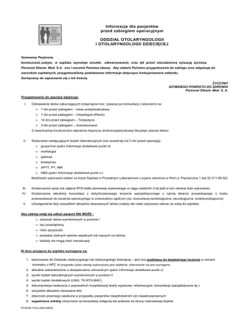 Informacje dla pacjentów przed zabiegiem operacyjnym ODDZIAŁ OTOLARYNGOLOGII I OTOLARYNGOLOGII DZIECIĘCEJ Szanowny Pacjencie, konieczność pobytu w szpitalu wywołuje smutek, zdenerwowanie, oraz lęk przed niecodzienną sytuacją życiową. Personel Silesia- Med. S.A. zna i rozumie Państwa obawy. Aby ułatwić Państwu przygotowanie do zabiegu oraz adaptację do warunków szpitalnych, przygotowaliśmy podstawowe informacje dotyczące funkcjonowania oddziału. Zachęcamy do zapoznania się z ich treścią. ŻYCZYMY SZYBKIEGO POWROTU DO ZDROWIA Personel Silesia- Med. S. A. Przygotowanie do operacji obejmuje: I. Odstawienie leków zaburzających krzepnięcie krwi (zawsze po konsultacji z lekarzem) na: • 7 dni przed zabiegiem – kwas acetylosalicylowy • 7 dni przed zabiegiem – Clopidogrel (Plavix) • 14 dni przed zabiegiem – Ticlopidyna • 3 dni przed zabiegiem – Acenokumarol O ewentualnej konieczności włączenia heparyny drobnocząsteczkowej decyduje zawsze lekarz II. Wykonanie następujących badań laboratoryjnych (nie wcześniej niż 5 dni przed operacją): • grupa krwi (patrz Informacje dodatkowe punkt d) • morfologia • glukoza • kreatynina • APTT, PT, INR • HBS (patrz Informacje dodatkowe punkt e ) Możliwość wykonania badań na koszt Szpitala w Prywatnym Laboratorium Lucjana Jaromina w Woli ul. Poprzeczna 1 (tel.32 211-83-52) III. Dostarczenie opisu lub zdjęcia RTG klatki piersiowej wykonanego w ciągu ostatnich 2 lat jeśli w tym okresie było wykonane) IV. Dostarczenie aktualnej konsultacji z dotychczasowego leczenia specjalistycznego z opinią lekarza prowadzącego o braku przeciwskazań do leczenia operacyjnego w znieczuleniu ogólnym (np. konsultacja kardiologiczna, neurologiczna, endokrynologiczna) V. Udostępnienie listy wszystkich aktualnie stosowanych leków (należy leki stale zażywane zabrać ze sobą do szpitala) Aby zabieg mógł się odbyć pacjent NIE MOŻE : • zażywać leków wymienionych w punkcie I • być przeziębiony • mieć opryszczki • posiadać żadnych stanów zapalnych lub ropnych na skórze • kobiety nie mogą mieć menstruacji W dniu przyjęcia do szpitala wymagane są: 1. skierowanie do Oddziału otolaryngologii lub otolaryngologii dziecięcej – jest ono podstawą do bezpłatnego leczenia w ramach kontraktu z NFZ. W przypadku jeżeli zabieg wykonywany jest odpłatnie, skierowanie nie jest wymagane. 2. aktualne zaświadczenie o ubezpieczeniu zdrowotnym (patrz Informacje dodatkowe punkt c) 3. wyniki badań laboratoryjnych wymienionych w punkcie II 4. wyniki badań dodatkowych (USG, TK,RTG,BAC) 5. dokumentacja medyczna z poprzednich hospitalizacji (karty wypisowe- informacyjne, konsultacje specjalistyczne itp.) 6. wszystkie aktualnie stosowane leki 7. obecność prawnego opiekuna w przypadku pacjentów niepełnoletnich lub niepełnosprawnych 8. wypełnione ankiety otrzymane na konsultacji wstępnej lub pobrane ze strony internetowej Szpital FP/RUM 1/A3-LAR/LARDZ. Informacje dodatkowe: a) W PRZYPADKU ZAKWALIFIKOWANIA DO ZABIEGU W ZNIECZULENIU OGÓLNYM LUB TZW.KRÓTKIM DOZYLNYM W DNIU PRZYJĘCIA DO SZPITALA PACJENT POWINIEN BYĆ NA CZCZO-NIE WOLNO JEŚĆ ANI PIĆ 8 GODZIN PRZED PLANOWANYM ZABIEGIEM!!! b) Bez względu na rodzaj zabiegu jaki będzie wykonywany należy KONIECZNIE zabrać ze sobą do szpitala kapcie, piżamę lub koszulę nocną. Dotyczy to wszystkich zabiegów-również wykonywanych w znieczuleniu miejscowym oraz badań diagnostycznych wykonywanych w oddziale. c) Dowodem ubezpieczenia zdrowotnego, uprawniającym do korzystania ze świadczeń zdrowotnych, jest każdy dokument, który potwierdza fakt opłacania składek na ubezpieczenie zdrowotne. Rodzaj dokumentu stanowiącego dowód ubezpieczenia zależny jest od podstaw zgłoszenia do ubezpieczenia, czyli od tytułu ubezpieczenia. Dowodem ubezpieczenia są: • dla osób zatrudnionych na umowę o pracę - legitymacja ubezpieczeniowa ważna do końca miesiąca, w którym ją aktualizowano plus następne 30 dni. Dowodem ubezpieczenia pracownika może być także dolny odcinek druku RMUA • dla emeryta/rencisty–ostatni odcinek emerytury lub renty lub decyzja o przyznaniu emerytury/renty lub legitymacja emeryta/ rencisty • dla osoby prowadzącej działalność gospodarczą – dowód wpłaty ostatniej składki do ZUS oraz dowód zgłoszenia do ubezpieczenia – druk ZUS ZUA • dla osoby ubezpieczonej w KRUS – zaświadczenie z KRUS bądź dowód wpłaty składki za bieżący kwartał • dla osoby bezrobotnej – zaświadczenie z urzędu pracy • dla członków rodziny osoby ubezpieczonej dowód zgłoszenia członka rodziny do ubezpieczenia (druk ZCZA, kopię ubezpieczeniowej legitymacji rodzinnej) oraz ww. dokumenty głównej osoby ubezpieczonej. Jeżeli członkiem rodziny jest pełnoletnie dziecko ubezpieczonego, należy dołączyć dokument stwierdzający, że nadal się uczy lub ma uprawnienia do statusu członka rodziny z innego tytułu. Jeżeli przedstawienie w/w dokumentu w dniu przyjęcia do szpitala nie jest możliwe, dokument ten może być dostarczony w terminie 7 dni od dnia zakończenia udzielania świadczeń zdrowotnych. W razie nie przedstawienia aktualnego dokumentu ubezpieczenia świadczenie zdrowotne zostanie udzielone na koszt pacjenta - art. 50 ust. 4 ustawy o świadczeniach opieki zdrowotnej finansowanych ze środków publicznych z dnia 27 sierpnia 2004r. d) wynik Grupy krwi musi być udokumentowany i poświadczony pieczątką osoby wykonującej badanie (poświadczenia dotyczące grupy krwi /wpis do ,,starego ‘’dowodu osobistego lub Karta Grupy Krwi) Nie honorujemy wyniku grupy krwi udokumentowanej na kartach wypisowych - informacyjnych z innych szpitali czy tez wpisu do Książeczki Zdrowia dziecka bez pieczątki osoby wykonującej badanie. e) Antygen HBS - nie trzeba wykonywać badania w przypadku, kiedy pacjent zaszczepiony jest co najmniej 2 dawkami szczepionki przeciwko żółtaczce zakaźnej-wówczas jednak KONIECZ