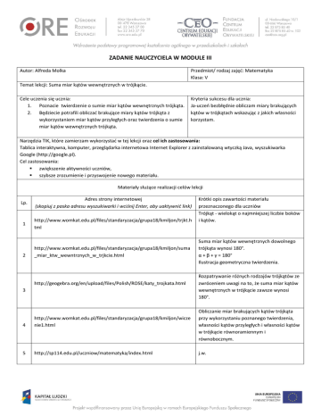 ZADANIE NAUCZYCIELA W MODULE III Autor: Alfreda Molka Przedmiot/ rodzaj zajęć: Matematyka Klasa: V Temat lekcji: Suma miar kątów wewnętrznych w trójkącie. Cele uczenia się ucznia: 1. Poznacie twierdzenie o sumie miar kątów wewnętrznych trójkąta. 2. Będziecie potrafili obliczać brakujące miary kątów trójkąta z wykorzystaniem miar kątów przyległych oraz twierdzenia o sumie miar kątów wewnętrznych trójkąta. Kryteria sukcesu dla ucznia: Ja-uczeń bezbłędnie obliczam miary brakujących kątów w trójkątach wskazując z jakich własności korzystam. Narzędzia TIK, które zamierzam wykorzystać w tej lekcji oraz cel ich zastosowania: Tablica interaktywna, komputer, przeglądarka internetowa Internet Explorer z zainstalowaną wtyczką Java, wyszukiwarka Google (http://google.pl). Cel zastosowania: zwiększenie aktywności uczniów, szybsze zrozumienie i przyswojenie nowego materiału. Materiały służące realizacji celów lekcji Lp. Adres strony internetowej (skopiuj z paska adresu wyszukiwarki i wciśnij Enter, aby uaktywnić link) 1 http://www.womkat.edu.pl/files/standaryzacja/grupa18/kmiljon/trjkt.h tml 2 http://www.womkat.edu.pl/files/standaryzacja/grupa18/kmiljon/suma _miar_ktw_wewntrznych_w_trjkcie.html http://geogebra.org/en/upload/files/Polish/ROSE/katy_trojkata.html 3 4 http://www.womkat.edu.pl/files/standaryzacja/grupa18/kmiljon/wicze nie1.html 5 http://sp114.edu.pl/uczniow/matematyka/index.html Krótki opis zawartości materiału przeznaczonego dla uczniów Trójkąt - wielokąt o najmniejszej liczbie boków i kątów. Suma miar kątów wewnętrznych dowolnego trójkąta wynosi 180°. α + β + γ = 180° Ilustracja geometryczna twierdzenia. Rozpatrywanie różnych rodzajów trójkątów ze zwróceniem uwagi na to, że suma miar kątów wewnętrznych w trójkącie zawsze wynosi 180°. Obliczanie miar brakujących kątów trójkąta przy wykorzystaniu poznanego twierdzenia, własności kątów przyległych i własności kątów w trójkącie równoramiennym i równobocznym. j.w.