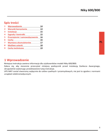 Niky 600/800 Spis treści 1 2 3 4 5 6 7 8 9 Wprowadzenie Warunki korzystania Instalacja Sygnały i kontrolki Przeciążenie i samowyłączwenie Cechy Wymiana akumulatorów Możliwe usterki Cechy techniczne 14 14 15 15 16 16 17 18 19 PL 1 Wprowadzenie Niniejsza instrukcja zawiera informacje dla użytkowników modeli Niky 600/800. Zaleca się, aby starannie przeczytać niniejszy podręcznik przed instalacją Zasilacza Awaryjnego, skrupulatnie wykonując przedstawione tutaj instrukcje. UPS NIKY został stworzony wyłącznie do celów cywilnych i przemysłowych; nie jest to zgodne z normami urządzeń elektromedycznych. 1 Niky 600/800 2 Warunki korzystania • UPS NIKY został zaprojektowany aby zasilać urządzenia przetwarzania danych. Zastosowane obciążenie nie może przekroczyć wartości wskazanej na tylnej etykiecie Twojego UPS. • Przycisk ON/OFF Twojego UPS nie izoluje elektrycznie części wewnętrznych. Aby odizolować Twój UPS odłącz go od gniazda sieci zasilania, • Nie otwierać obudowy UPS, gdyż mogą się wewnątrz znajdować części z niebezpiecznie wysokim napięciem, nawet gdy wtyczka sieci jest odłączona; wewnątrz nie ma części które użytkownik może naprawić. • UPS NIKY został zaprojektowany do pracy w zamkniętych, czystych pomieszczeniach, gdzie nie ma łatwopalnych płynów lub substancji żrących i gdzie nie jest zbyt wilgotno. • Nie należy umieszczać blisko urządzeń generujących mocne pole elektromagnetyczne i/lub blisko urządzeń, które są czułe na pole elektromagnetyczne. (silniki, napędy dyskietek, głośniki, adaptery, monitory, video, itp.) • Nie wylewać jakichkolwiek płynów na UPS lub wewnątrz UPS> • Nie umieszczać UPS w wilgotnym środowisku lub blisko płynów, takich jak woda, roztwory chemiczne… • Nie wystawiać UPS na bezpośrednie słońce lub na działanie źródeł ciepła. • Utrzymywać otwory wentylacyjne w czystości, aby efektywnie rozpraszać ciepło UPS. • Używać kabla zasilającego z uziemieniem do podłączania UPS do źródła zasilania. • Nie podłączać drukarek laserowych do UPS ze względu na ich duży prąd rozruchowy. • Nie podłączać domowych urządzeń elektrycznych, takich jak suszarka do włosów, urządzenia klimatyzacji i lodówkę do gniazd UPS. 2 Niky 600/800 3 Instalacja • Wyjmij UPS z jego opakowania. • Upewnij się, że napiecie zasilania sieci jest identyczne jak te, wskazane na etykiecie umieszczonej z PL tyłu UPS. • Włącz UPS przy pomocy przycisku ON/OFF i sprawdź, czy pracuje prawidłowo z siecią (zapalona zielona dioda LED). • Wyłącz UPS poprzez naciśnięcie przycisku ON/OFF dopóki dioda LED nie zgaśnie. • Po wyłączeniu UPS, podłącz kable zasilające obciążenie do wyjścia UPS używając gniazda umieszczonego z prawej strony UPS. • Włącz UPS, a następnie obciążenie aby sprawdzić czy pracuje prawidłowo z siecią (zapalona zielona dioda LED). • Pozostawić UPS włączony na 8 godzin aby naładować baterię przed rozpoczęciem jego użytkowania. • UPS może być również używany przed tym jak akumulatory zostaną całkowicie naładowane, ale w tym przypadku dostępny czas podtrzymania podczas zaniku zasilania będzie krótszy. UWAGA Podczas podłączania linii wyjściowej, należy upewnić się, że całkowita długość przewodu z UPS do najdalszego urządzenia nie przekracza 10 metrów. UWAGA Nigdy nie odłączać wtyczki zasilającej 230V, podczas gdy UPS pracuje, gdyż odłączy to zabezpieczenie uziemienia zarówno dla UPS, jak I podłączonego do niego obciążenia. 4 Sygnały i kontrolki Sygnały świetlne: Kolor diod LED na panelu przednim ma następujące znaczenia : • Dioda LED, stała zielona: napięcie zasilające obecne I prawidłowe, akumulatory są ładowane • Dioda LED, zielona migająca co 3 sekundy: praca na akumulatorach • Dioda LED, zielona migająca co 0.5 sekundy: autonomia w rezerwie • Dioda LED, zielona/czerwona migająca: test lub ponowne uruchomienie po końcu autonomii • Dioda LED, stała czerwona: awaria lub przeciążenie akumulatorów Sygnały dźwiękowe: • Przerywany dźwięk co 3 sekundy: praca na akumulatorach • Przerywany dźwięk co 0.5 sekundy: autonomia w rezerwie • Ciągły dźwięk: usterka, przeciążenie lub wyczerpane akumulatory 3 Niky 600/800 5 Przeciążenie i samo-wyłączenie Twój UPS jest wyposażony w system do pomiaru mocy dostarczonej na wyjście; gdy przekracza ona ustawiony próg, to zabezpieczenie i odpowiednie sygnały są aktywowane; wyłączenie jest automatyczne, z opóźnieniem odpowiednim do rozmiaru przeciążenia. W trybie linii zapali się zielona dioda LED. Jeśli przeciążenie wynosi 100% ± 10%; to UPS wyłączy się po 5 minutach I przejdzie do trybu błędu. Jeśli przeciążenie wynosi 110% ± 10%; UPS wyłączy sie bezzwłocznie I przejdzie do trybu błędu. W trybie akumulatorowym zapali się czerwona dioda LED. Jeśli przeciążenie wynosi 100% ± 10%; to UPS wyłączy się po 5 sekundach I przejdzie do trybu błędu. Jeśli przeciążenie wynosi 110% ± 10%; UPS wyłączy się bezzwłocznie I przejdzie do trybu błędu. 6 Cechy Autotest Automatyczny autotest jest wykonywany za każdym razem, gdy UPS jest włączany, aby zapewnić pewne działanie. Zabezpieczenie akumulatorów Automatyczny test akumulatorów I zabezpieczenie przed głębokim rozładowaniem. Możliwość startu DC UPS może być włączony w trybie DC (praca na akumulatorach). Gniazda zasilające UPS Jest to liniowo interaktywny UPS wyposażony w AVR, który pozwala na zasilanie obciążenia stabilizowanym napięciem wyjściowym, nawet gdy napięcie zasilania nie jest stałe. 4 Niky 600/800 6 Cechy Zabezpieczenie elektryczne Automatyczne wyłączeni po zwarciu. Sterowanie mikroprocesorowe CPU PL Funkcja zielona: jeśli akumulatory są rozładowywane bez obciążenia, UPS wyłączy się automatycznie aby w celu oszczędzania żywotności baterii. Filtrowanie EMI/RFI: Zła 