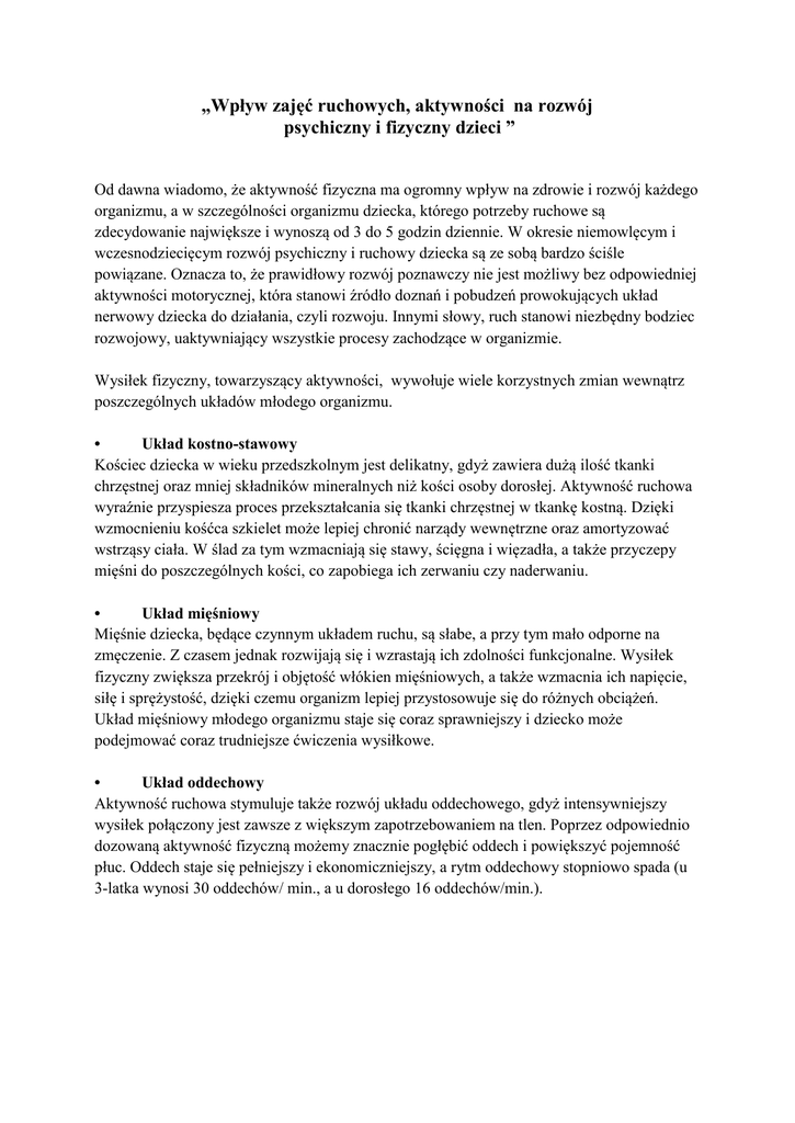 „Wpływ zajęć ruchowych, aktywności na rozwój psychiczny i fizyczny dzieci ” Od dawna wiadomo, że aktywność fizyczna ma ogromny wpływ na zdrowie i rozwój każdego organizmu, a w szczególności organizmu dziecka, którego potrzeby ruchowe są zdecydowanie największe i wynoszą od 3 do 5 godzin dziennie. W okresie niemowlęcym i wczesnodziecięcym rozwój psychiczny i ruchowy dziecka są ze sobą bardzo ściśle powiązane. Oznacza to, że prawidłowy rozwój poznawczy nie jest możliwy bez odpowiedniej aktywności motorycznej, która stanowi źródło doznań i pobudzeń prowokujących układ nerwowy dziecka do działania, czyli rozwoju. Innymi słowy, ruch stanowi niezbędny bodziec rozwojowy, uaktywniający wszystkie procesy zachodzące w organizmie. Wysiłek fizyczny, towarzyszący aktywności, wywołuje wiele korzystnych zmian wewnątrz poszczególnych układów młodego organizmu. • Układ kostno-stawowy Kościec dziecka w wieku przedszkolnym jest delikatny, gdyż zawiera dużą ilość tkanki chrzęstnej oraz mniej składników mineralnych niż kości osoby dorosłej. Aktywność ruchowa wyraźnie przyspiesza proces przekształcania się tkanki chrzęstnej w tkankę kostną. Dzięki wzmocnieniu kośćca szkielet może lepiej chronić narządy wewnętrzne oraz amortyzować wstrząsy ciała. W ślad za tym wzmacniają się stawy, ścięgna i więzadła, a także przyczepy mięśni do poszczególnych kości, co zapobiega ich zerwaniu czy naderwaniu. • Układ mięśniowy Mięśnie dziecka, będące czynnym układem ruchu, są słabe, a przy tym mało odporne na zmęczenie. Z czasem jednak rozwijają się i wzrastają ich zdolności funkcjonalne. Wysiłek fizyczny zwiększa przekrój i objętość włókien mięśniowych, a także wzmacnia ich napięcie, siłę i sprężystość, dzięki czemu organizm lepiej przystosowuje się do różnych obciążeń. Układ mięśniowy młodego organizmu staje się coraz sprawniejszy i dziecko może podejmować coraz trudniejsze ćwiczenia wysiłkowe. • Układ oddechowy Aktywność ruchowa stymuluje także rozwój układu oddechowego, gdyż intensywniejszy wysiłek połączony jest zawsze z większym zapotrzebowaniem na tlen. Poprzez odpowiednio dozowaną aktywność fizyczną możemy znacznie pogłębić oddech i powiększyć pojemność płuc. Oddech staje się pełniejszy i ekonomiczniejszy, a rytm oddechowy stopniowo spada (u 3-latka wynosi 30 oddechów/ min., a u dorosłego 16 oddechów/min.). • Układ krążenia Pojemność serca u dziecka jest niewielka, a mięsień sercowy jest słabo rozwinięty. W związku z tym regularne ćwiczenia fizyczne są bardzo korzystne dla tego organu. Pod wpływem wysiłku nie tylko zwiększają się wymiary mięśnia sercowego, ale także ilość krążącej krwi oraz pojemność wyrzutowa serca. Warunki krążenia stają się lepsze i zapewniają dobre ukrwienie narządów oraz mięśni. Ponadto systematyczny trening zwiększa liczbę erytrocytów i hemoglobiny, oraz zwiększa pojemność tlenową krwi. • Układ immunologiczny Regularny trening wpływa na poprawę systemu obronnego i uaktywnia mechanizmy immunologiczne, które zwiększają odporność ustroju, zwłaszcza na choroby zakaźne. Dzięki temu obserwujemy m.in. zmniejszoną zapadalność na choroby dzieci i młodzieży uprawiającej sport i różne formy rekreacji ruchowej. • Układ nerwowy Układ nerwowy ma za zadanie koordynować współdziałanie różnych elementów (układów, organów, narządów), tworzących niepodzielną całość organizmu. U dziecka układ nerwowy rozwija się w szybkim tempie dzięki wrodzonej ruchliwości i różnorodnej aktywności ruchowej. Nie chodzi tu o zwiększanie się masy mózgu czy liczby neuronów, ale w szczególności o mielinizację włókien nerwowych, czyli tworzenie wokół nich specjalnej otoczki. Dopóki otoczka ta nie ukształtuje się wyraźnie, ruchy dziecka są globalne, nieskoordynowane, rozrzutne, angażujące wielkie grupy mięśniowe, a co za tym idzie – nieekonomiczne. Pojawienie się otoczki mielinowej powoduje wzrost szybkości przewodzenia bodźców nerwowych i znacznie polepsza koordynację ruchową. Innymi słowy, ruchy stają się bardziej opanowane i celowe, przy jednocześnie oszczędniejszej gospodarce energetycznej. Na zajęciach ruchowych najistotniejszy jest jednak rozwój motoryki oraz zdolności kondycyjnych. Poprzez zabawy ruchowe i ćwiczenia gimnastyczne rozwijają się elementarne umiejętności motoryczne, takie jak chodzenie, bieganie, pełzanie, czworakowanie, dźwiganie, zwisanie, rzucanie, chwytanie, skakanie, wspinanie, przetaczanie, przewracanie. Na podstawie tych umiejętności rozwija się zdolności kondycyjne: a) wytrzymałość – odporność organizmu na zmęczenie, b) szybkość – zdolność wykonywania ruchów w jak najkrótszym czasie bez oznak zmęczenia, c) zwinność – synonim koordynacji ruchowej oraz suma szybkości, zręczności i gibkości warunkujących odpowiednią zmianę pozycji i postawy ciała, d) zręczność – zdolność do sprawnego i efektywnego wykonania elementów ruchowych przy wykorzystaniu koordynacji, szybkości i siły, e) równowagę – możliwość utrzymywania równowagi oraz powrotu do stanu równowagi po wykonaniu ruchu, f) gibkość – zdolność do wykonywania ruchów o dużej amplitudzie, uzależniona od elastyczności mięśni i ścięgien. Argumenty przekonujące, że warto ćwiczyć, że warto być aktywnym fizycznie: a) Polepsza nastrój Ćwiczenia fizyczne poprawiają stan układu nerwowego i wpływają na układ hormonalny. Dlatego ruch polepsza nastrój i przepędza ponure myśli, pomaga uspokoić emocje, rozładowuje napięcie i stres, ułatwia relaks. Podczas wysiłku fizycznego w mózgu powstają endorfiny zwane hormonami szczęścia. b) Lek na bezsenność Umiarkowane ćwiczenia mogą zlikwidować kłopoty ze snem. To dobry lek na bezsenność i nocne niepokoje. Poprawa snu jest ef