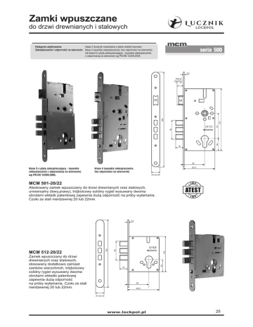 Zamki wpuszczane do drzwi drewnianych i stalowych Kategoria u¿ytkowania: klasa 2 (budynki mieszkalne a tak¿e obiekty biurowe) Zabezpieczenie i odpornoœæ na wiercenie: klasa 4 (wysokie zabezpieczenie, bez odpornoœci na wiercenie) lub klasa 5-z p³yt¹ zabezpieczaj¹c¹ - (wysokie zabezpieczenie z odpornoœci¹ na wiercenie) wg PN-EN 12209:2005. seria 500 2,5 34 52 72 177 240 Zakres regulacji 12 - 17 18 55 klasa 5-z p³yt¹ zabezpieczaj¹c¹ - (wysokie zabezpieczenie z odpornoœci¹ na wiercenie) wg PN-EN 12209:2005. 82,5 klasa 4 (wysokie zabezpieczenie, bez odpornoœci na wiercenie) 20 lub 22 MCM 501-20/22 Atestowany zamek wpuszczany do drzwi drewnianych oraz stalowych, uniwersalny (lewy,prawy), trójbolcowy solidny rygiel wysuwany dwoma obrotami wk³adk patentowej zapewnia du¿¹ odpornoœæ na próby wy³amania. Czo³o ze stali nierdzewnej 20 lub 22mm. 34 Zamek wpuszczany do drzwi drewnianych oraz stalowych, stosowany dodatkowo zamiast zamków wierzchnich, trójbolcowy solidny rygiel wysuwany dwoma obrotami wk³adki patentowej zapewnia du¿¹ odpornoœæ na próby wy³amania. Czo³o ze stali nierdzewnej 20 lub 22mm. 101 MCM 512-20/22 52 165 2,5 18 55 82,5 20 lub 22 18 www.lockpol.pl 25