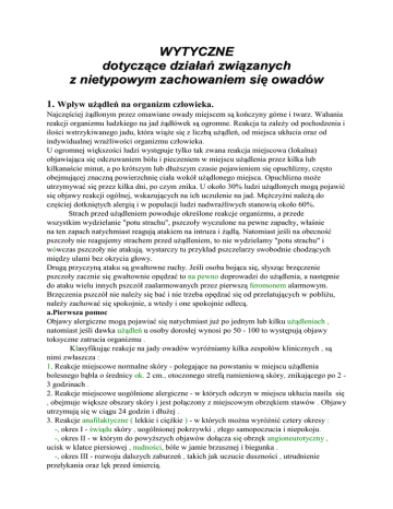 WYTYCZNE dotyczące działań związanych z nietypowym zachowaniem się owadów 1. Wpływ uŜądleń na organizm człowieka. Najczęściej Ŝądlonym przez omawiane owady miejscem są kończyny górne i twarz. Wahania reakcji organizmu ludzkiego na jad Ŝądłówek są ogromne. Reakcja ta zaleŜy od pochodzenia i ilości wstrzykiwanego jadu, która wiąŜe się z liczbą uŜądleń, od miejsca ukłucia oraz od indywidualnej wraŜliwości organizmu człowieka. U ogromnej większości ludzi występuje tylko tak zwana reakcja miejscowa (lokalna) objawiająca się odczuwaniem bólu i pieczeniem w miejscu uŜądlenia przez kilka lub kilkanaście minut, a po krótszym lub dłuŜszym czasie pojawieniem się opuchlizny, często obejmującej znaczną powierzchnię ciała wokół uŜądlonego miejsca. Opuchlizna moŜe utrzymywać się przez kilka dni, po czym znika. U około 30% ludzi uŜądlonych mogą pojawić się objawy reakcji ogólnej, wskazujących na ich uczulenie na jad. MęŜczyźni naleŜą do częściej dotkniętych alergią i w populacji ludzi nadwraŜliwych stanowią około 60%. Strach przed uŜądleniem powoduje określone reakcje organizmu, a przede wszystkim wydzielanie "potu strachu", pszczoły wyczulone na pewne zapachy, właśnie na ten zapach natychmiast reagują atakiem na intruza i Ŝądlą. Natomiast jeśli na obecność pszczoły nie reagujemy strachem przed uŜądleniem, to nie wydzielamy "potu strachu" i wówczas pszczoły nie atakują. wystarczy tu przykład pszczelarzy swobodnie chodzących między ulami bez okrycia głowy. Drugą przyczyną ataku są gwałtowne ruchy. Jeśli osoba bojąca się, słysząc brzęczenie pszczoły zacznie się gwałtownie opędzać to na pewno doprowadzi do uŜądlenia, a następnie do ataku wielu innych pszczół zaalarmowanych przez pierwszą feromonem alarmowym. Brzęczenia pszczół nie naleŜy się bać i nie trzeba opędzać się od przelatujących w pobliŜu, naleŜy zachować się spokojnie, a wtedy i one spokojnie odlecą. a.Pierwsza pomoc Objawy alergiczne mogą pojawiać się natychmiast juŜ po jednym lub kilku uŜądleniach , natomiast jeśli dawka uŜądleń u osoby dorosłej wynosi po 50 - 100 to występują objawy toksyczne zatrucia organizmu . Klasyfikując reakcje na jady owadów wyróŜniamy kilka zespołów klinicznych , są nimi zwłaszcza : 1. Reakcje miejscowe normalne skóry - polegające na powstaniu w miejscu uŜądlenia bolesnego bąbla o średnicy ok. 2 cm., otoczonego strefą rumieniową skóry, znikającego po 2 3 godzinach . 2. Reakcje miejscowe uogólnione alergiczne - w których odczyn w miejscu ukłucia nasila się , obejmuje większe obszary skóry i jest połączony z miejscowym obrzękiem stawów . Objawy utrzymują się w ciągu 24 godzin i dłuŜej . 3. Reakcje anafilaktyczne ( lekkie i cięŜkie ) - w których moŜna wyróŜnić cztery okresy : -, okres I - świądu skóry , uogólnionej pokrzywki , złego samopoczucia i niepokoju. -, okres II - w którym do powyŜszych objawów dołącza się obrzęk angioneurotyczny , ucisk w klatce piersiowej , nudności, bóle w jamie brzusznej i biegunka . -, okres III - rozwoju dalszych zaburzeń , takich jak uczucie duszności , utrudnienie przełykania oraz lęk przed śmiercią. -, okres IV - spadku ciśnienia krwi i utraty przytomności. W wielu przypadkach objawy okresu IV mogą rozwijać się niemal natychmiast po uŜądleniu. Gdy uŜądli Cię lub kogoś z otoczenia pszczoła, aby przerwać wnikanie jadu do ciała naleŜy jak najszybciej wyciągnąć Ŝądło. W tym celu podwaŜ je paznokciem lub ostrzem noŜa, a najlepiej zeskrob, prowadząc narzędzie od miejsca wbicia szczecinek w skórę ku aparatowi jadowemu. UwaŜaj - gdy usuwasz Ŝądło, chwytając je palcami, moŜesz wtłoczyć jad do ciała - Ŝądło pszczół wyrywa się najczęściej z pęcherzykiem jadowym - Ŝądło os nie pozostaje w ciele człowieka. Niebezpieczne dla kaŜdego człowieka moŜe być uŜądlenie w gardziel i szyję, szczególnie w Ŝyłę!!!!!!!. Ludzie zdrowi, bez uczuleń lekko znoszą od 5 do 15 uŜądleń równocześnie. CięŜkie zatrucie powoduje około 300-ta uŜądleń. Natomiast około 500 uŜądleń moŜe spowodować śmierć poŜądlonego. b.Przy udzielaniu pierwszej pomocy poszkodowanego naleŜy: - ułoŜyć w miejscu osłoniętym od słońca, zabronić chodzić, - aby uśmierzyć ból podać środek przeciwbólowy i uspokajający, - okolice uŜądleń przemyj w celu odkaŜenia wodą utlenioną lub jodyną, - moŜna wykonać okład z Altacetu - kwaśnej wody. c .Oprócz tego jeŜeli posiadamy specjalistyczną apteczkę naleŜy podać poszkodowanemu: - lek o nazwie Klemastyna lub mniej znany Difergan (moŜna zrobić zastrzyk z Adrenaliną), - bardzo wskazanym środekiem jest zastrzyk o nazwie Fastject. - wskazane są takŜe preparaty wapniowe doustne np. Thenaldin calcium oraz preparat pobudzający akcję serca - Cardiamdum lub Kardiamid z kofeiną. Uwaga! Gdy chory jest w stanie wstrząsu, traci przytomność, a jego oddech staje się przerywany - naleŜy zastosować sztuczne oddychanie jak przy reanimacji. Podczas wzywania lekarza do osoby powaŜnie - kilkakrotnie uŜądlonej informuj czy osoba jest przytomna, czy występują obrzęki w okolicach oczu, ust lub krtani, czy są problemy z oddychaniem, czy ma drgawki. PomoŜe to lekarzowi w przygotowaniu właściwych leków. 2. Przygotowanie techniczne oraz zasady postępowania ratownika usuwającego roje oraz gniazda owadów. • Sprawdź szczelność siatki i kapelusza pszczelarskiego. • ZałóŜ luźne ubranie nie krępujące ruchów i nie przylegające bezpośrednio do ciała. • WłóŜ odpowiednie obuwie (najlepiej skórzane) np. buty "skutery". • ZałóŜ rękawice tak, aby dokładnie chroniły przeguby rąk. • Sprawdź najdogodniejsze dojście do gniazda lub roju (usuń przeszkody). • Wszystkie czynności wykonuj w sposób opanowany, bez gwałtownych ruchów. • Ratownik biorący udział w takic