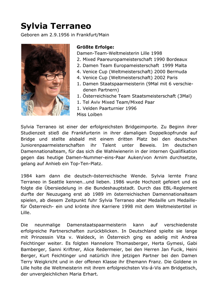 Sylvia Terraneo Geboren am 2.9.1956 in Frankfurt/Main Größte Erfolge: Damen-Team-Weltmeisterin Lille 1998 2. Mixed Paareuropameisterschaft 1990 Bordeaux 2. Damen Team Europameisterschaft 1999 Malta 4. Venice Cup (Weltmeisterschaft) 2000 Bermuda 4. Venice Cup (Weltmeisterschaft) 2002 Paris 1. Damen Staatspaarmeisterin (9Mal mit 6 verschiedenen Partnern) 1. Österreichische Team Staatsmeisterschaft (3Mal) 1. Tel Aviv Mixed Team/Mixed Paar 1. Velden Paarturnier 1996 Miss Loiben Sylvia Terraneo ist einer der erfolgreichsten Bridgeimporte. Zu Beginn ihrer Studienzeit stieß die Frankfurterin in ihrer damaligen Doppelkopfrunde auf Bridge und stellte alsbald mit einem dritten Platz bei den deutschen Juniorenpaarmeisterschaften ihr Talent unter Beweis. Im deutschen Damennationalteam, für das sich die Wahlwienerin in der internen Qualifikation gegen das heutige Damen-Nummer-eins-Paar Auken/von Arnim durchsetzte, gelang auf Anhieb ein Top-Ten-Platz. 1984 kam dann die deutsch-österreichische Wende. Sylvia lernte Franz Terraneo in Seattle kennen…und lieben. 1986 wurde Hochzeit gefeiert und es folgte die Übersiedelung in die Bundeshauptstadt. Durch das EBL-Reglement durfte der Neuzugang erst ab 1989 im österreichischen Damennationalteam spielen, ab diesem Zeitpunkt fuhr Sylvia Terraneo aber Medaille um Medaillefür Österreich- ein und krönte ihre Karriere 1998 mit dem Weltmeistertitel in Lille. Die neunmalige Damenstaatspaarmeisterin kann auf verschiedenste erfolgreiche Partnerschaften zurückblicken. In Deutschland spielte sie lange mit Prinzessin Vita v. Waldeck, in Österreich ging es adelig mit Andrea Feichtinger weiter. Es folgten Hannelore Thomasberger, Herta Gymesi, Gabi Bamberger, Sanni Kriftner, Alice Redermeier, bei den Herren Jan Fucik, Heini Berger, Kurt Feichtinger und natürlich ihre jetzigen Partner bei den Damen Terry Weigkricht und in der offenen Klasse ihr Ehemann Franz. Die Goldene in Lille holte die Weltmeisterin mit ihrem erfolgreichsten Vis-á-Vis am Bridgetisch, der unvergleichlichen Maria Erhart. Ursprünglich aus einer anderen Bridgeschule kommend spielt die Vizeeuropameisterin seit nunmehr 25 Jahren mit ihren jeweiligen Partnern blue club. Dieses System biete keine Nachteile und durch die limitierten Eröffnungen sowie die starke Treff-Eröffnung gäbe es einen enormen Wissensvorsprung vor herkömmlichen Lizitsystemen. „Nichtsdestotrotz laufen wir zurzeit bei den Damen hinter der Spitze her, da auch dort aggressiver als früher gespielt wird. Die „Jausengegner“ nehmen zahlenmäßig ab. Zudem leiden wir in Österreich an einem Mangel an Nachwuchs, der sich nicht nur im Open bemerkbar macht“, führt Sylvia Terraneo aus. Gibt es sonst noch Unterschiede seit ihren Bridgeanfängen? „Das Niveau bei den österreichischen Hausturnieren hat sich verschlechtert. Bridge wird oftmals lediglich als sozialer Faktor gesehen, nicht als Sportart im eigentlichen Sinn. Die „Naturspieler“ von früher sind ausgestorben, heute werden zumeist komplizierte Systeme gelehrt, die die Spieler überfordern.“ Ihre Lieblingspartie sieht die begeisterte Wanderin in einem Großschlemm gegen einen ihrer ehemaligen Angstgegner. In Atout durfte sie mit AKxx zu J98xxx – logischer Weise- keinen Stich abgeben, was bei jedem 2-1-Stand der Fall und bei jedem 3-0-Stand -nahezu- unmöglich ist. Für den Fall eines 3Standes mit QTx davor kombiniert mit einem Konzentrationsfehler spielte die Sylvia Terraneo den J vor, den sie natürlich nie hätte laufen lassen. Der Bube wurde von der Dame gedeckt und der letzte blinkte aus. Der 3-0 Stand wurde ohne Stichverlust gelöst und der Turniersieg ob dieser psychologischen Raffinesse eingefahren.