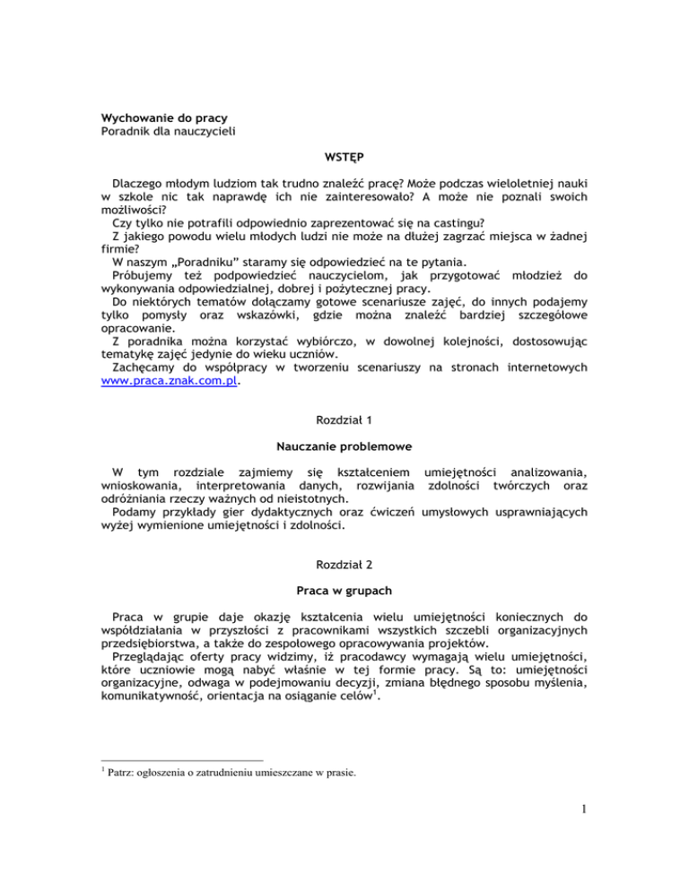 Wychowanie do pracy Poradnik dla nauczycieli WSTĘP Dlaczego