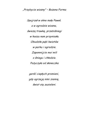 „Przybycie wiosny” – Bożena Forma Spojrzał w okno mały Paweł, a w ogrodzie wiosna, świeżą trawkę, przebiśniegi w koszu nam przyniosła. Obudziła pąki kwiatów w parku i ogrodzie. Zapomnijcie moi mili o śniegu i chłodzie. Pożyczyła od słoneczka garść ciepłych promieni, gdy ogrzeję nimi ziemię, świat się zazieleni. „Prośba do słoneczka” – Bożena Forma Malutka główka krokusa nad śniegiem się pojawiła. To znaczy, że już wkrótce przybędzie wiosna miła. Słoneczko nasze kochane, bardzo cię prosimy, ogrzewaj mocno ziemię, ścieraj ślady zimy.