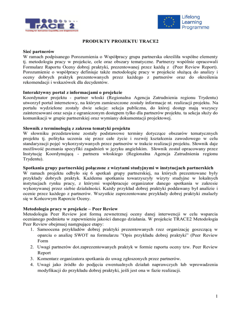 PRODUKTY PROJEKTU TRACE2 Sieć partnerów W ramach podpisanego Porozumienia o Współpracy grupa partnerska określiła wspólne elementy tj. metodologia pracy w projekcie, cele oraz obszary tematyczne. Partnerzy wspólnie opracowali Formularz Raportu Oceny dobrej praktyki, prezentowanej przez każdą z (Peer Review Report). Porozumienie o współpracy definiuje także metodologię pracy w projekcie służącą do analizy i oceny dobrych praktyk prezentowanych przez każdego z partnerów oraz do określenia rekomendacji i wskazówek dla decydentów. Interaktywny portal z informacjami o projekcie Koordynator projektu - partner włoski (Regionalna Agencja Zatrudnienia regionu Trydentu) utworzył portal internetowy, na którym zamieszczone zostały informacje nt. realizacji projektu. Na portalu wydzielone zostały dwie sekcje: sekcja publiczna, do której dostęp mają wszyscy zainteresowani oraz sesja z ograniczonym dostępem tylko dla partnerów projektu. ta sekcja służy do komunikacji w grupie partnerskiej oraz wymiany dokumentacji projektowej. Słownik z terminologią z zakresu tematyki projektu W słowniku przedstawione zostały podstawowe terminy dotyczące obszarów tematycznych projektu tj. polityka uczenia się przez całe życie i rozwój kształcenia zawodowego w celu standaryzacji pojęć wykorzystywanych przez partnerów w trakcie realizacji projektu. Słownik daje możliwość poznania specyfiki zagadnień w języku angielskim. Słownik został opracowany przez Instytucję Koordynującą - partnera włoskiego (Regionalna Agencja Zatrudnienia regionu Trydentu). Spotkania grupy partnerskiej połączone z wizytami studyjnymi w instytucjach partnerskich W ramach projektu odbyło się 6 spotkań grupy partnerskiej, na których prezentowane były przykłady dobrych praktyk. Każdemu spotkaniu towarzyszyły wizyty studyjne w lokalnych instytucjach rynku pracy, z którymi współpracuje organizator danego spotkania w zakresie wykonywanej przez siebie działalności. Każdy przykład dobrej praktyki poddawany był analizie i ocenie przez każdego z partnerów. Wszystkie zaprezentowane przykłady dobrej praktyki znalazły się w Końcowym Raporcie Oceny. Metodologia pracy w projekcie – Peer Review Metodologia Peer Review jest formą zewnetrznej oceny danej interwencji w celu wsparcia ocenianego podmiotu w zapewnieniu jakości danego działania. W projekcie TRACE2 Metodologia Peer Review obejmuej następujące etapy: 1. Samoocena przykładów dobrej praktyki prezentowanych rzez organizację goszczącą w oparciu o analizę SWOT na formularzu ”Opis przykładu dobrej praktyki” (Peer Review Form 2. Uwagi partnerów dot.zaprezentowanych praktyk w formie raportu oceny tzw. Peer Review Report 3. Komentarz organizatora spotkania do uwag zgłoszonych przez partnerów. 4. Uwagi jako źródło do podjęcia ewentualnych działań naprawczych lub wprowadzenia modyfikacji do przykładu dobrej praktyki, jeśli jest ona w fazie realizacji. 1 Raporty oceny końcowej i średniookresowej Każdy etap realizacji projektu podlegał ocenie przez partnerów projektu. Ewaluacja obejmowała elementy tj. przyjęta metodologia pracy w projekcie (peer review), osiągnięte rezultaty, jakość prezentowanych przykładów dobrych praktyk oraz zadowolenie z udziału w projekcie. Wyniki oceny zostały zebrane przez Koordynatora projektu - Regionalną Agencję Zatrudnienia Trydentu w formie raportu z oceny średniookresowej i końcowej. Końcowy Raport Oceny Przykładów Dobrych Praktyk Końcowy Raport Oceny Przykładów Dobrych Praktyk, opracowany w jęz.angielskim i włoskim zawiera charakterystykę wszystkich 12 przykładów dobrych praktyk, jakie zostały zaprezentowane przez partnerów na spotkaniach grupy partnerskiej, zbiór 6 rekomendacji opracowanych na podstawie wskazówek wcześniejszej edycji projektu TRACE oraz ewaluacji końcowej. Zestaw 6 rekomendacji Partner belgijski - ESF-Agency Flanders przygotował zbiór 6 rekomendacji, które zostały opracowane na podstawie wniosków płynących z dyskusji partnerów podczas spotkań grupy partnerskiej oraz wskazówek wcześniejszej edycji projektu TRACE. Rekomendacje odnoszą się są do 12 przykładów dobrych praktyk, które były prezentowane przez każda z instytucji partnerskich na spotkania projektowych. 2