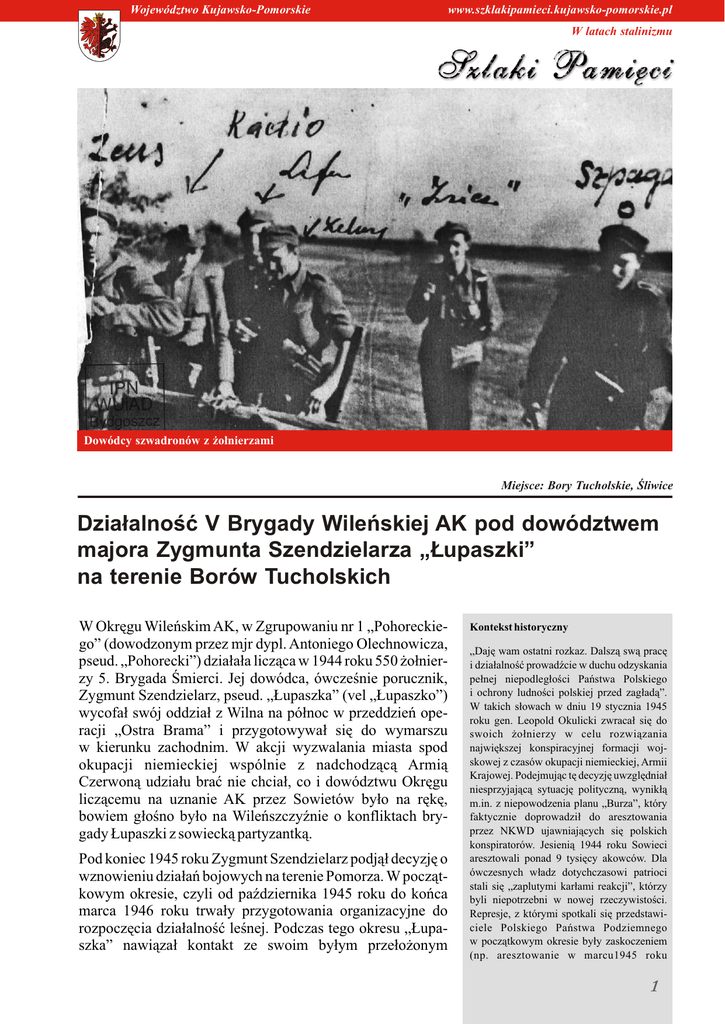 Województwo Kujawsko-Pomorskie www.szklakipamieci.kujawsko-pomorskie.pl W latach stalinizmu Dowódcy szwadronów z żołnierzami Miejsce: Bory Tucholskie, Śliwice Działalność V Brygady Wileńskiej AK pod dowództwem majora Zygmunta Szendzielarza „Łupaszki” na terenie Borów Tucholskich W Okręgu Wileńskim AK, w Zgrupowaniu nr 1 „Pohoreckiego” (dowodzonym przez mjr dypl. Antoniego Olechnowicza, pseud. „Pohorecki”) działała licząca w 1944 roku 550 żołnierzy 5. Brygada Śmierci. Jej dowódca, ówcześnie porucznik, Zygmunt Szendzielarz, pseud. „Łupaszka” (vel „Łupaszko”) wycofał swój oddział z Wilna na północ w przeddzień operacji „Ostra Brama” i przygotowywał się do wymarszu w kierunku zachodnim. W akcji wyzwalania miasta spod okupacji niemieckiej wspólnie z nadchodzącą Armią Czerwoną udziału brać nie chciał, co i dowództwu Okręgu liczącemu na uznanie AK przez Sowietów było na rękę, bowiem głośno było na Wileńszczyźnie o konfliktach brygady Łupaszki z sowiecką partyzantką. Pod koniec 1945 roku Zygmunt Szendzielarz podjął decyzję o wznowieniu działań bojowych na terenie Pomorza. W początkowym okresie, czyli od października 1945 roku do końca marca 1946 roku trwały przygotowania organizacyjne do rozpoczęcia działalność leśnej. Podczas tego okresu „Łupaszka” nawiązał kontakt ze swoim byłym przełożonym Kontekst historyczny „Daję wam ostatni rozkaz. Dalszą swą pracę i działalność prowadźcie w duchu odzyskania pełnej niepodległości Państwa Polskiego i ochrony ludności polskiej przed zagładą”. W takich słowach w dniu 19 stycznia 1945 roku gen. Leopold Okulicki zwracał się do swoich żołnierzy w celu rozwiązania największej konspiracyjnej formacji wojskowej z czasów okupacji niemieckiej, Armii Krajowej. Podejmując tę decyzję uwzględniał niesprzyjającą sytuację polityczną, wynikłą m.in. z niepowodzenia planu „Burza”, który faktycznie doprowadził do aresztowania przez NKWD ujawniających się polskich konspiratorów. Jesienią 1944 roku Sowieci aresztowali ponad 9 tysięcy akowców. Dla ówczesnych władz dotychczasowi patrioci stali się „zaplutymi karłami reakcji”, którzy byli niepotrzebni w nowej rzeczywistości. Represje, z którymi spotkali się przedstawiciele Polskiego Państwa Podziemnego w początkowym okresie były zaskoczeniem (np. aresztowanie w marcu1945 roku 1 Województwo Kujawsko-Pomorskie www.szklakipamieci.kujawsko-pomorskie.pl W latach stalinizmu Grupa Władysława Chelińskiego „Małego” po połączeniu z grupą „Zeusa” Antonim Olechnowiczem „Pohoreckim”, który w tym okresie był komendantem eksterytorialnego Wileńskiego Okręgu AK (od III 1947 roku funkcjonował on pod nazwą Ośrodek Mobilizacyjny Wileńskiego Okręgu AK). Podczas spotkania obu konspiratorów w październiku postanowiono przerzucić część grupy V Brygady Wileńskiej na teren Pomorza. Wznowienie akcji zbrojnej wiązało się z dużym ryzykiem, gdyż partyzanci mieli zacząć działać na całkiem nowym obszarze, bez stałych, wypróbowanych kontaktów, w obcym otoczeniu. Z drugiej strony, mogli oni liczyć na pomoc repatriantów z obszaru Wileńszczyzny, którzy mieli świadomość tego, jakie porządki chcą zaprowadzić władze komunistyczne, gdyż pamiętali o represjach wobec Polaków walczących w szeregach AK na Wileńszczyźnie. V Brygada Wileńska wyróżniała się jednolitym umundurowaniem, świadczącym o wojskowym charakterze działań. Na podkreślenie zasługują noszone przez partyzantów ryngrafy Matki Boskiej Ostrobramskiej. Działalność V Brygady Wileńskiej AK na obszarze Borów Tucholskich trwała od IV 1946 roku do XI 1946 roku. Funkcjonowanie V Brygady na terenie Pomorza zostało dopasowane do określonych warunków, które wynikały z braku odpowiedniego zaplecza. Do Brygady przyjmowano najczęściej osoby już wcześniej znane, nieraz jednak odstępowano od tej zasady. Większa część partyzantów przeszła szlak bojowy z „Łupaszką” i wywodziła się z Kresów Wschodnich. Strata każdego żołnierza była niepowetowana z punktu widzenia dalszej działalności . Łączny stan brygady przez cały okres jej działalności na Pomorzu nie przekraczał 60 osób. Dużym utrudnieniem był brak znajomości terenu. W pierwszym okresie funkcjonowania w Borach Tucholskich partyzanci nie posiadali odpowiednich map. Brak kontaktów i osób zaufanych w terenie ograniczał możliwości członków grupy. czołowych działaczy z okresu II wojny światowej – proces 16), lecz wkrótce duża część młodych ludzi wróciła do konspiracji, tworząc różne organizacje o ogólnopolskim bądź lokalnym zasięgu, czynnie manifestując niezgodę na porządki „Polski lubelskiej”. Ppłk Tadeusz Danilewicz „Domana” z Narodowego Zjednoczenia Wojskowego (NZW) uważał, iż „rozwój działań wojennych przyniósł nam po okupacji niemieckiej drugą okupację – sowiecką”. Wielu sądziło podobnie. Nie chcieli być pachołkami Moskwy, nie godzili się z sowietyzacją kraju. W 1945 roku w szeregach oddziałów zbrojnych walczyło 13 – 17 tys. partyzantów różnych formacji. W swych rachubach liczyli oni na wybuch nowego konflikt zbrojnego. „Weszliśmy w stan przejściowy między wojnami – napisał gen. Klemens Rudnicki w liście do ppłk. Antoniego Olechnowicza – a długotrwałość tego okresu nie da się przewidzieć. Okres ten jednak musi się zakończyć konfliktem zbrojnym Anglosasów ze Związkiem Radzieckim. Ponieważ przewaga po stronie Anglosasów jest zdecydowana pod względem materialnym, więc zwycięstwo będzie po ich stronie. Dlatego też polska racja stanu wymaga stanąć po stronie Anglosasów, gdybyśmy stanęli po stronie Związku Radzieckiego, tym samym znaleźlibyśmy się wśród państw, które przyszłą wojnę przegrają”. W wyniku niesprzyjającej sytuacji politycznej nie udało się „ostatnim leśny