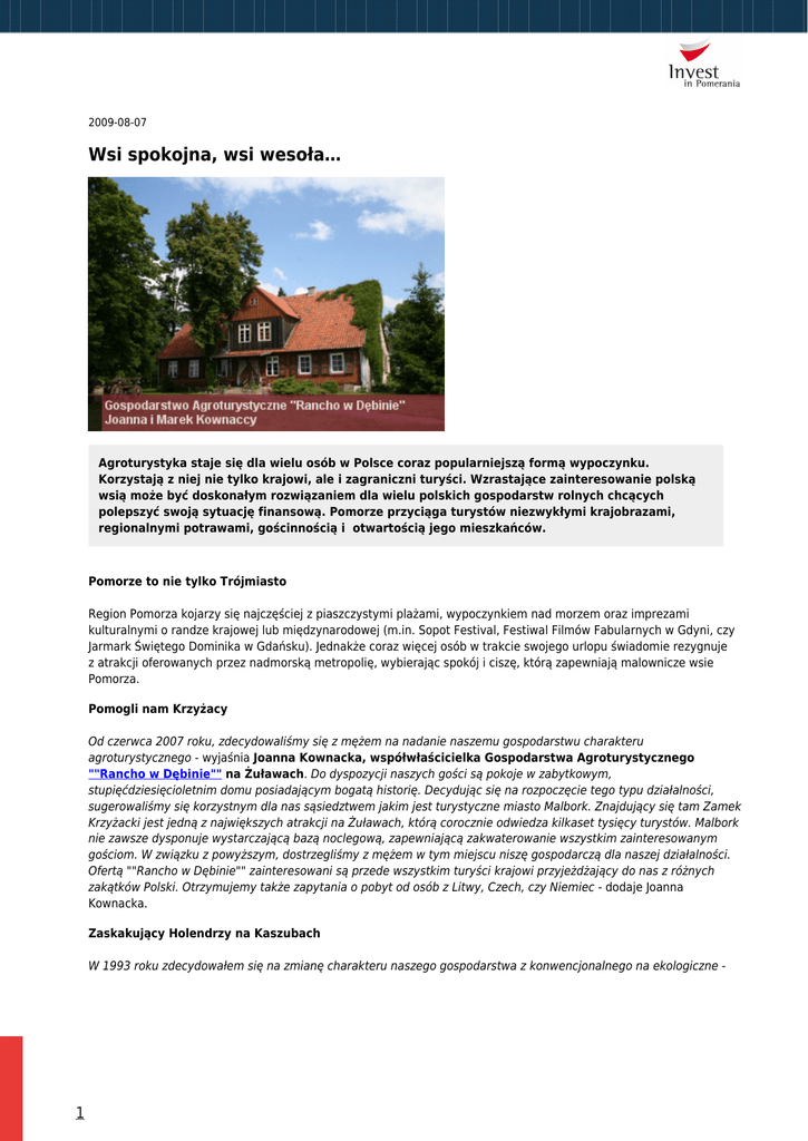 2009-08-07 Wsi spokojna, wsi wesoła… Agroturystyka staje się dla wielu osób w Polsce coraz popularniejszą formą wypoczynku. Korzystają z niej nie tylko krajowi, ale i zagraniczni turyści. Wzrastające zainteresowanie polską wsią może być doskonałym rozwiązaniem dla wielu polskich gospodarstw rolnych chcących polepszyć swoją sytuację finansową. Pomorze przyciąga turystów niezwykłymi krajobrazami, regionalnymi potrawami, gościnnością i otwartością jego mieszkańców. Pomorze to nie tylko Trójmiasto Region Pomorza kojarzy się najczęściej z piaszczystymi plażami, wypoczynkiem nad morzem oraz imprezami kulturalnymi o randze krajowej lub międzynarodowej (m.in. Sopot Festival, Festiwal Filmów Fabularnych w Gdyni, czy Jarmark Świętego Dominika w Gdańsku). Jednakże coraz więcej osób w trakcie swojego urlopu świadomie rezygnuje z atrakcji oferowanych przez nadmorską metropolię, wybierając spokój i ciszę, którą zapewniają malownicze wsie Pomorza. Pomogli nam Krzyżacy Od czerwca 2007 roku, zdecydowaliśmy się z mężem na nadanie naszemu gospodarstwu charakteru agroturystycznego - wyjaśnia Joanna Kownacka, współwłaścicielka Gospodarstwa Agroturystycznego ""Rancho w Dębinie"" na Żuławach. Do dyspozycji naszych gości są pokoje w zabytkowym, stupięćdziesięcioletnim domu posiadającym bogatą historię. Decydując się na rozpoczęcie tego typu działalności, sugerowaliśmy się korzystnym dla nas sąsiedztwem jakim jest turystyczne miasto Malbork. Znajdujący się tam Zamek Krzyżacki jest jedną z największych atrakcji na Żuławach, którą corocznie odwiedza kilkaset tysięcy turystów. Malbork nie zawsze dysponuje wystarczającą bazą noclegową, zapewniającą zakwaterowanie wszystkim zainteresowanym gościom. W związku z powyższym, dostrzegliśmy z mężem w tym miejscu niszę gospodarczą dla naszej działalności. Ofertą ""Rancho w Dębinie"" zainteresowani są przede wszystkim turyści krajowi przyjeżdżający do nas z różnych zakątków Polski. Otrzymujemy także zapytania o pobyt od osób z Litwy, Czech, czy Niemiec - dodaje Joanna Kownacka. Zaskakujący Holendrzy na Kaszubach W 1993 roku zdecydowałem się na zmianę charakteru naszego gospodarstwa z konwencjonalnego na ekologiczne - 1 podkreśla Andrzej Konkol właściciel Gospodarstwa Ekologicznego ""Teresy i Andrzeja Konkol"" znajdującego się we wsi Kosy koło Kartuz. Od tego samego roku jestem członkiem międzynarodowej organizacji ECEAT (Europejskiego Centrum Ekologicznego Rolnictwa i Turystyki) tworzącej sieć gospodarstw zajmujących się produkcją i dystrybucją żywności ekologicznej. Członkostwo w ECEAT zapewnia także gospodarstwom eko-turystycznym wpisanie ich do międzynarodowego folderu wydawanego m.in. w Holandii, Francji, Niemczech czy Hiszpanii. Dzięki temu ich oferta agroturystyczna dociera do szerszego grona odbiorców. Nasze gospodarstwo najczęściej odwiedzają Holendrzy - zauważa Andrzej Konkol. To co najbardziej mnie w nich zaskoczyło, to ich otwartość i chęć obcowania z dziewiczą naturą. Mimo, iż w większości przypadków odwiedzający nas goście są osobami zamożnymi, mogącymi pozwolić sobie na mieszkanie w luksusowych hotelach i podróżowanie po całym świecie, to jednak wybierają nocowanie w namiotach pod kaszubskim niebem, nierzadko w niesprzyjających warunkach atmosferycznych - wyjaśnia gospodarz z Kos. Urokliwe zakątki Kociewia Kociewie jako region nie jest tak bardzo rozpoznawalne jak Kaszuby. Pomimo tego posiada ono wiele atutów. Turyści odwiedzający ten obszar Pomorza doceniają malownicze krajobrazy Borów Tucholskich w postaci jezior, lasów i rzek. Na szczególną uwagę zasługuje tutaj, unikalne na skalę światową Arboretum i Ogród Dendrologiczny w Wirtach. Kociewie to nie tylko przyroda, to również zabytki w postaci średniowiecznej katedry w Pelplinie, starówki w Starogardzie Gdańskim czy zamku w Gniewie - podkreśla Sylwia Dróżkowska z agrogospodarstwa ""Zagroda u Hanki"" w Borzechowie. Agroturystyka, daje młodszemu pokoleniu wywodzącemu się z miast szansę zaobserwowania życia na wsi poprzez bezpośrednie obcowanie z naturą i zwierzętami. Starszym osobom daje możliwość odpoczynku od miejskiego zgiełku i hałasu - tłumaczy Sylwia Dróżkowska. Magdalena Wroniak Autor MW 2