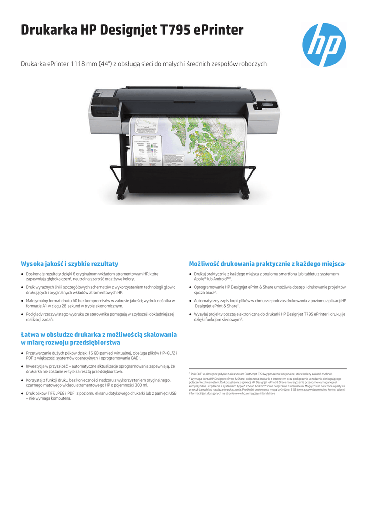 Drukarka HP Designjet T795 ePrinter Drukarka ePrinter 1118 mm (44") z obsługą sieci do małych i średnich zespołów roboczych Wysoka jakość i szybkie rezultaty Możliwość drukowania praktycznie z każdego miejsca ● Doskonałe rezultaty dzięki 6 oryginalnym wkładom atramentowym HP, które zapewniają głęboką czerń, neutralną szarość oraz żywe kolory. ● Drukuj praktycznie z każdego miejsca z poziomu smartfona lub tabletu z systemem Apple® lub Android™2. ● Druk wyraźnych linii i szczegółowych schematów z wykorzystaniem technologii głowic drukujących i oryginalnych wkładów atramentowych HP. ● Oprogramowanie HP Designjet ePrint & Share umożliwia dostęp i drukowanie projektów spoza biura2. ● Maksymalny format druku A0 bez kompromisów w zakresie jakości; wydruk nośnika w formacie A1 w ciągu 28 sekund w trybie ekonomicznym. ● Automatyczny zapis kopii plików w chmurze podczas drukowania z poziomu aplikacji HP Designjet ePrint & Share2. ● Podglądy rzeczywistego wydruku ze sterownika pomagają w szybszej i dokładniejszej realizacji zadań. ● Wysyłaj projekty pocztą elektroniczną do drukarki HP Designjet T795 ePrinter i drukuj je dzięki funkcjom sieciowym2. 2 Łatwa w obsłudze drukarka z możliwością skalowania w miarę rozwoju przedsiębiorstwa ● Przetwarzanie dużych plików dzięki 16 GB pamięci wirtualnej, obsługa plików HP-GL/2 i PDF z większości systemów operacyjnych i oprogramowania CAD1. ● Inwestycja w przyszłość – automatyczne aktualizacje oprogramowania zapewniają, że drukarka nie zostanie w tyle za resztą przedsiębiorstwa. ● Korzystaj z funkcji druku bez konieczności nadzoru z wykorzystaniem oryginalnego, czarnego matowego wkładu atramentowego HP o pojemności 300 ml. ● Druk plików TIFF, JPEG i PDF1 z poziomu ekranu dotykowego drukarki lub z pamięci USB – nie wymaga komputera. 1 Pliki PDF są dostępne jedynie z akcesorium PostScript (PS) (wyposażenie opcjonalne, które należy zakupić osobno). 2 Wymaga konta HP Designjet ePrint & Share, połączenia drukarki z Internetem oraz podłączenia urządzenia obsługującego połączenie z Internetem. Do korzystania z aplikacji HP Designjet ePrint & Share na urządzenia przenośne wymagane jest kompatybilne urządzenie z systemem Apple® iOS lub Android™ oraz połączenie z Internetem. Mogą zostać naliczone opłaty za przesył danych lub nawiązanie połączenia. Prędkości drukowania mogą być różne. 5 GB tymczasowej pamięci na konto. Więcej informacji jest dostępnych na stronie www.hp.com/go/eprintandshare Drukarka HP Designjet T795 ePrinter Dane techniczne Drukowanie Zawartość opakowania Rysunki liniowe 28 s/str., 103 wydruki w formacie A1 na godz. Kolorowe obrazy 41 m²/godz. na nośnikach powlekanych; 6,7 m²/godz. na nośnikach błyszczących Rozdzielczość druku Z optymalizacją do 2400 x 1200 dpi Marginesy (górny x dolny x lewy x prawy) Rolka: 5 x 5 x 5 x 5 mm Arkusz: 5 x 17 x 5 x 5 mm Technologia Technologia termiczna HP Inkjet Typy atramentów Barwnikowe (C, G, M, pK, Y); pigmentowe (mK) Kolory atramentu 6 (błękitny, szary, purpurowy, czarny matowy, czarny fotograficzny, żółty) Objętość kropli atramentu 6 pl (C, G, M, pK); 9 pl (mK, Y) Pojemność Czarny matowy (300 ml); błękitny, szary, purpurowy, czarny matowy, czarny fotograficzny, żółty (130 ml); błękitne, szary, purpurowy, czarny fotograficzny, żółty (69 ml) CR649C Drukarka HP Designjet T795 1118 mm ePrinter; głowice drukujące; startowe wkłady atramentowe; podstawa drukarki; oś na rolkę papieru; skrócona instrukcja obsługi; plakat instalacyjny; oprogramowanie startowe; przewód zasilania Certyfikaty Bezpieczeństwo Zgodny z wymogami UE (dyrektywa niskonapięciowa i EN 60950-1); GOST (Rosja) Elektromagnetyczne Zgodne z wymaganiami klasy A, w tym: UE (dyrektywa o kompatybilności elektromagnetycznej) Ochrona środowiska ENERGY STAR®; WEEE; RoHS (UE); RoHS (Chiny); RoHS (Korea); RoHS (Indie); REACH; EPEAT Bronze ENERGY STAR Tak Gwarancja Roczna ograniczona gwarancja na sprzęt. Opcje gwarancji i pomocy technicznej są różne w zależności od produktu, kraju oraz lokalnych przepisów prawnych. Ilość dysz głowicy drukującej 1056 Głowice drukujące 3 (1 z każdego rodzaju: czarny matowy i żółty, purpurowy i błękitny, czarny fotograficzny i szary) Prędkość druku 103 wydruki w formacie A1 na godz. Dokładność linii +/- 0.1% Informacje o precyzji linii: +/- 0,1% podanej długości wektora lub +/- 0,2 mm (większa z tych wartości) przy temperaturze 23°C i wilgotności względnej 50-60%, na nośniku matowym HP A0 w trybie najwyższej lub normalnej jakości i z wykorzystaniem oryginalnych atramentów HP Minimalna grubość linii 0,02 mm (adresowalne przez HP-GL/2) Gwarantowana min szerokość wiersza 0,06 mm (ISO/IEC 13660:2001(E)) Maksymalna waga nośnika 11,9 kg Maks. gęstość optyczna 6 L* min/2,15 D Produkt Obsługa Podawanie arkuszy; podawanie z rolki; automatyczna obcinarka Akcesoria Typy Papier typu bond i powlekany (bond, powlekany, powlekany o wysokiej gramaturze, papier o bardzo wysokiej gramaturze oraz matowy, kolorowy), papier techniczny (kalka kreślarska, papier bond półprzezroczysty, welinowy), folia (przezroczysta, matowa, poliestrowa), papier fotograficzny (satynowany, błyszczący, półbłyszczący, matowy, o wysokim połysku), nośnik podświetlany, nośnik samoprzylepny (two-view cling, papier do użytku w pomieszczeniach, polipropylenowy, winylowy) CN500B Zestawy do rozbudowy PostScript dla drukarek HP Designjet CN538A 3-calowy adapter rdzenia HP Designjet CQ654C Skaner HD HP Designjet J8025A Serwer druku HP Jetdirect 640n Q6709A Oś rolki podającej do drukarek HP Designjet 1118 mm Waga od 60 do 328 g/m² C9370A HP 72 wkład atramentowy czarny fotograficzny 130 ml Format od 210x279 do 1118x1676 mm C9371A HP 72 wkład atramentowy błękitny 130 ml Grubość Maks. 800 mikronów C9372A HP 72 wkład atramentowy purpuro