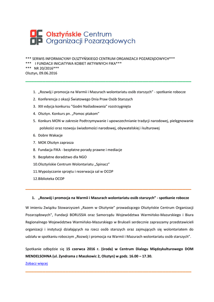 *** SERWIS INFORMACYJNY OLSZTYŃSKIEGO CENTRUM ORGANIZACJI POZARZĄDOWYCH*** *** I FUNDACJI INICJATYWA KOBIET AKTYWNYCH FIKA*** *** NR 20/2016*** Olsztyn, 09.06.2016 __________________________________________________________ 1. „Rozwój i promocja na Warmii i Mazurach wolontariatu osób starszych” - spotkanie robocze 2. Konferencja z okazji Światowego Dnia Praw Osób Starszych 3. XIII edycja konkursu "Godni Naśladowania" rozstrzygnięta 4. Olsztyn. Konkurs pn. „Pomoc ptakom” 5. Konkurs MON w zakresie Podtrzymywanie i upowszechnianie tradycji narodowej, pielęgnowanie polskości oraz rozwoju świadomości narodowej, obywatelskiej i kulturowej 6. Dobre Wakacje 7. MOK Olsztyn zaprasza 8. Fundacja FIKA - bezpłatne porady prawne i mediacje 9. Bezpłatne doradztwo dla NGO 10.Olsztyńskie Centrum Wolontariatu „Spinacz” 11.Wypożyczanie sprzętu i rezerwacja sal w OCOP 12.Biblioteka OCOP __________________________________________________________ 1. „Rozwój i promocja na Warmii i Mazurach wolontariatu osób starszych” - spotkanie robocze W imieniu Związku Stowarzyszeń „Razem w Olsztynie” prowadzącego Olsztyńskie Centrum Organizacji Pozarządowych", Fundacji BORUSSIA oraz Samorządu Województwa Warmińsko-Mazurskiego i Biura Regionalnego Województwa Warmińsko-Mazurskiego w Brukseli serdecznie zapraszamy przedstawicieli organizacji i instytucji działających na rzecz osób starszych oraz zajmujących się wolontariatem do udziału w spotkaniu roboczym „Rozwój i promocja na Warmii i Mazurach wolontariatu osób starszych”. Spotkanie odbędzie się 15 czerwca 2016 r. (środa) w Centrum Dialogu Międzykulturowego DOM MENDELSOHNA (ul. Zyndrama z Maszkowic 2, Olsztyn) w godz. 16.00 – 17.30. Zobacz więcej __________________________________________________________ 2. Konferencja z okazji Światowego Dnia Praw Osób Starszych Wojewódzka konferencja z okazji Światowego Dnia Praw Osób Starszych „Prawo osób starszych do przyjaznej przestrzeni publicznej, aktywności społecznej oraz bezpieczeństwa” odbędzie się 15 czerwca 2016 roku w Hotelu Park w Olsztynie (al. Warszawska 119), godz. 11.00 do 14.00 SZCZEGÓŁY ORAZ PROGRAM KONFERENCJI __________________________________________________________ 3. XIII edycja konkursu "Godni Naśladowania" rozstrzygnięta Po raz 13. w Olsztynie odbyła się gala, podczas której samorząd Warmii i Mazur wyróżnił organizacje pozarządowe aktywnie działające w naszym regionie. W tym roku przyznano nagrody w 8 kategoriach. Celem konkursu jest promowanie działalności obywatelskiej i aktywności społecznej, realizowanych przez organizacje pozarządowe, ale również przez grupy nieformalne. Zobacz więcej __________________________________________________________ 4. Olsztyn. Konkurs pn. „Pomoc ptakom” Prezydent Olsztyna ogłosił konkurs ofert na realizację zadania publicznego. Przedmiotem konkursu jest zlecenie wykonania zadania publicznego, w formie wsparcia wraz z udzieleniem dotacji na jego dofinansowanie pn.: „Pomoc ptakom”. Oferty należy składać do dnia 21 czerwca 2016 r. OGŁOSZENIE O KONKURSIE __________________________________________________________ 5. Konkurs MON w zakresie Podtrzymywanie i upowszechnianie tradycji narodowej, pielęgnowanie polskości oraz rozwoju świadomości narodowej, obywatelskiej i kulturowej Minister Obrony Narodowej ogłosił otwarty konkurs ofert na realizację zadań publicznych w formie wsparcia w zakresie: Podtrzymywanie i upowszechnianie tradycji narodowej, pielęgnowanie polskości oraz rozwoju świadomości narodowej, obywatelskiej i kulturowej. Organizacja i przeprowadzenie przedsięwzięć upamiętniających operację „Ostra Brama” w Wilnie. Oferty należy składać do 23 czerwca 2016 r. SZCZEGÓŁY KONKURSU _________________________________________________________ 6. Dobre Wakacje Uniwersytet Nowoczesnego Obywatela i Przyjaciele, zapraszają na Arystotelesowski program edukacyjny "DOBRE WAKACJE" 16 czerwca od godz. 9.30 do Parku Jakubowego. Zobacz więcej ____________________________________________________ 7. MOK Olsztyn zaprasza Miejski Ośrodek Kultury w Olsztynie serdecznie zaprasza do wspólnej zabawy w Retrobawialnii familijnej. 18 czerwca w godz. 11:00-14.00, Muzeum Nowoczesności, ul. Knosały 3b. Zobacz więcej __________________________________________________________ 8. Fundacja FIKA - bezpłatne porady prawne i mediacje Zapraszamy na bezpłatne porady prawne: środy w godzinach 11.00-14.00 - porady prawne, piątki w godzinach 11.00-14.00 - porady prawne i mediacje Fundacja "Inicjatywa Kobiet Aktywnych" FIKA; 10-274 Olsztyn, ul. Tarasa Szewczenki 1, tel. 505 344 605 Nieodpłatną pomoc prawną można uzyskać również w Urzędzie Miasta Olsztyna, ul. Wyzwolenia 30, pok. 19, tel. 527-31-11. Pomoc prawna świadczona jest od poniedziałku do piątku w godz. 8.00-16.00. Pomoc prawną w Urzędzie Miasta Olsztyna mogą uzyskać tylko osoby określone w ustawie ( ustawa z dnia 5 sierpnia 2015 r. o nieodpłatnej pomocy prawnej). Zapraszamy. __________________________________________________________ 9. Bezpłatne doradztwo dla NGO Olsztyńskie Centrum Organizacji Pozarządowych oferuje bezpłatną pomoc przy przygotowaniu ofert konkursowych. Organizacje zainteresowane ofertą OCOP proszone są o kontakt: [email protected], Tel. 503 680 500 Bezpłatne doradztwo uzyskać można również w zakresie między innymi: rozliczania ofert z realizacji zadań publicznych oraz pisania i rozliczania projektów. Osoby zajmujące się w organizacji sprawami księgowymi i finansowymi zapraszamy do skorzystania z bezpłatnego doradztwa we wtorki godz. 17.00-18.00 w Olsztyńskim Centrum Organizacji Pozarządowych, ul. Tarasa Szewczenki 1, 10-274 Olsztyn mapa >> Doradztwo jest organizowane przez Związek Stowarzyszeń „Razem w Olsztynie” w ramach projektu „Olsztyńskie Centrum Organizacji Pozarządowych” realizowanego przy współudziale finansowym Gminy Olsztyn ________