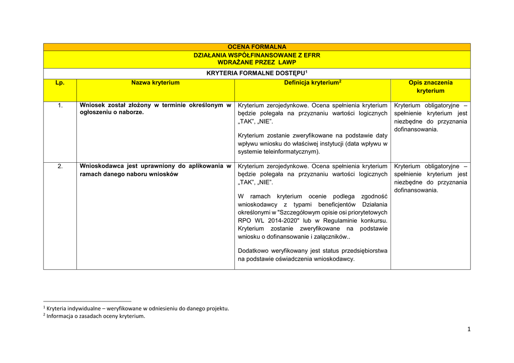 OCENA FORMALNA DZIAŁANIA WSPÓŁFINANSOWANE Z EFRR WDRAŻANE PRZEZ LAWP KRYTERIA FORMALNE DOSTĘPU1 Lp. Nazwa kryterium Definicja kryterium2 Opis znaczenia kryterium 1. Wniosek został złożony w terminie określonym w ogłoszeniu o naborze. Kryterium zerojedynkowe. Ocena spełnienia kryterium będzie polegała na przyznaniu wartości logicznych „TAK”, „NIE”. Kryterium obligatoryjne – spełnienie kryterium jest niezbędne do przyznania dofinansowania. Kryterium zostanie zweryfikowane na podstawie daty wpływu wniosku do właściwej instytucji (data wpływu w systemie teleinformatycznym). 2. Wnioskodawca jest uprawniony do aplikowania w ramach danego naboru wniosków Kryterium zerojedynkowe. Ocena spełnienia kryterium będzie polegała na przyznaniu wartości logicznych „TAK”, „NIE”. W ramach kryterium ocenie podlega zgodność wnioskodawcy z typami beneficjentów Działania określonymi w "Szczegółowym opisie osi priorytetowych RPO WL 2014-2020" lub w Regulaminie konkursu. Kryterium zostanie zweryfikowane na podstawie wniosku o dofinansowanie i załączników.. Kryterium obligatoryjne – spełnienie kryterium jest niezbędne do przyznania dofinansowania. Dodatkowo weryfikowany jest status przedsiębiorstwa na podstawie oświadczenia wnioskodawcy. 1 2 Kryteria indywidualne – weryfikowane w odniesieniu do danego projektu. Informacja o zasadach oceny kryterium. 1 3. Każdy z partnerów jest uprawniony do aplikowania w ramach danego naboru wniosków (jeśli dotyczy) Kryterium zerojedynkowe. Ocena spełnienia kryterium będzie polegała na przyznaniu wartości logicznych „TAK”, „NIE”, ,,NIE DOTYCZY”. W ramach kryterium ocenie podlega zgodność partnerów wnioskodawcy z typami beneficjentów Działania określonymi w "Szczegółowym opisie osi priorytetowych RPO WL 2014-2020" lub w Regulaminie konkursu. Kryterium zostanie zweryfikowane na podstawie wniosku o dofinansowanie i załączników.. 4. Wnioskodawca nie został wykluczony z możliwości ubiegania się o wsparcie z funduszy strukturalnych w trybie określonym w przepisach o finansach publicznych i/lub wobec wnioskodawcy nie orzeczono zakazu dostępu do środków funduszy europejskich na podstawie ustawy o skutkach powierzenia wykonywania pracy cudzoziemcom przebywającym wbrew przepisom na terytorium Rzeczpospolitej Polskiej i/lub ustawy o odpowiedzialności podmiotów zbiorowych za czyny zabronione pod groźbą kary Dodatkowo weryfikowany jest status przedsiębiorstwa na podstawie oświadczenia. Kryterium zerojedynkowe. Ocena spełnienia kryterium będzie polegała na przyznaniu wartości logicznych „TAK”, „NIE”. W tym kryterium mowa jest o wykluczeniu, na podstawie art. 207 ust. 4 ustawy o finansach publicznych, art. 12 ust. 1 pkt. 1 ustawy o skutkach powierzenia wykonywania pracy cudzoziemcom przebywającym wbrew przepisom na terenie RP, art. 9 ust. 1 pkt. 2a ustawy o odpowiedzialności podmiotów zbiorowych za czyny zabronione pod groźbą kary. Członkowie KOP dokonują weryfikacji kryterium wyłącznie na podstawie oświadczenia wnioskodawcy. Kryterium obligatoryjne – spełnienie kryterium jest niezbędne do przyznania dofinansowania (jeśli dotyczy). Kryterium obligatoryjne – spełnienie kryterium jest niezbędne do przyznania dofinansowania. 2 5. 6. 7. Żaden z partnerów wnioskodawcy nie został wykluczony z możliwości ubiegania się o wsparcie z funduszy strukturalnych w trybie określonym w przepisach o finansach publicznych i/lub żadnego z partnerów nie orzeczono zakazu dostępu do środków funduszy europejskich na podstawie ustawy o skutkach powierzenia wykonywania pracy cudzoziemcom przebywającym wbrew przepisom na terytorium Rzeczpospolitej Polskiej i/lub ustawy o odpowiedzialności podmiotów zbiorowych za czyny zabronione pod groźbą kary (jeśli dotyczy). Kryterium zerojedynkowe. Ocena spełnienia kryterium będzie polegała na przyznaniu wartości logicznych „TAK”, „NIE”, ,,NIE DOTYCZY”. Całkowita wartość projektu oraz wartość wydatków kwalifikowalnych mieszczą się w przedziałach minimalnej i maksymalnej wartości projektu oraz wartości wydatków kwalifikowalnych dla danego Działania/typu projektów Kryterium zerojedynkowe. Ocena spełnienia kryterium będzie polegała na przyznaniu wartości logicznych „TAK”, „NIE”. Kwota dofinansowania jest zgodna z przedziałem kwotowym minimalnej i maksymalnej kwoty dofinansowania, przewidzianym dla danego Działania/typu projektu W tym kryterium mowa jest o wykluczeniu, na podstawie art. 207 ust. 4 ustawy o finansach publicznych, art. 12 ust. 1 pkt. 1 ustawy o skutkach powierzenia wykonywania pracy cudzoziemcom przebywającym wbrew przepisom na terenie RP, art. 9 ust. 1 pkt. 2a ustawy o odpowiedzialności podmiotów zbiorowych za czyny zabronione pod groźbą kary. Członkowie KOP dokonują weryfikacji kryterium wyłącznie na podstawie oświadczenia. W ramach kryterium ocenie podlega zgodność całkowitej wartości projektu oraz wartości wydatków kwalifikowanych z wartościami przewidzianymi dla danego Działania/typu projektu określonymi w "Szczegółowym opisie osi priorytetowych RPO WL 2014-2020" lub w Regulaminie konkursu. Kryterium zerojedynkowe. Ocena spełnienia kryterium będzie polegała na przyznaniu wartości logicznych „TAK”, „NIE”. W ramach kryterium ocenie podlega zgodność kwoty dofinansowania z przedziałem kwotowym minimalnej i maksymalnej kwoty dofinansowania, przewidzianym dla danego Działania/typu projektu w Regulaminie konkursu. Kryterium obligatoryjne – spełnienie kryterium jest niezbędne do przyznania dofinansowania (jeśli dotyczy). Kryterium obligatoryjne – spełnienie kryterium jest niezbędne do przyznania dofinansowania. Kryterium obligatoryjne – spełnienie kryterium jest niezbędne do przyznania dofinansowania. 3 8. Wniosek jest pierwszym złożonym przez Wnioskodawcę w ramach danego naboru (jeśli dotyczy zgodnie z Regulaminem konkursu). Kryt