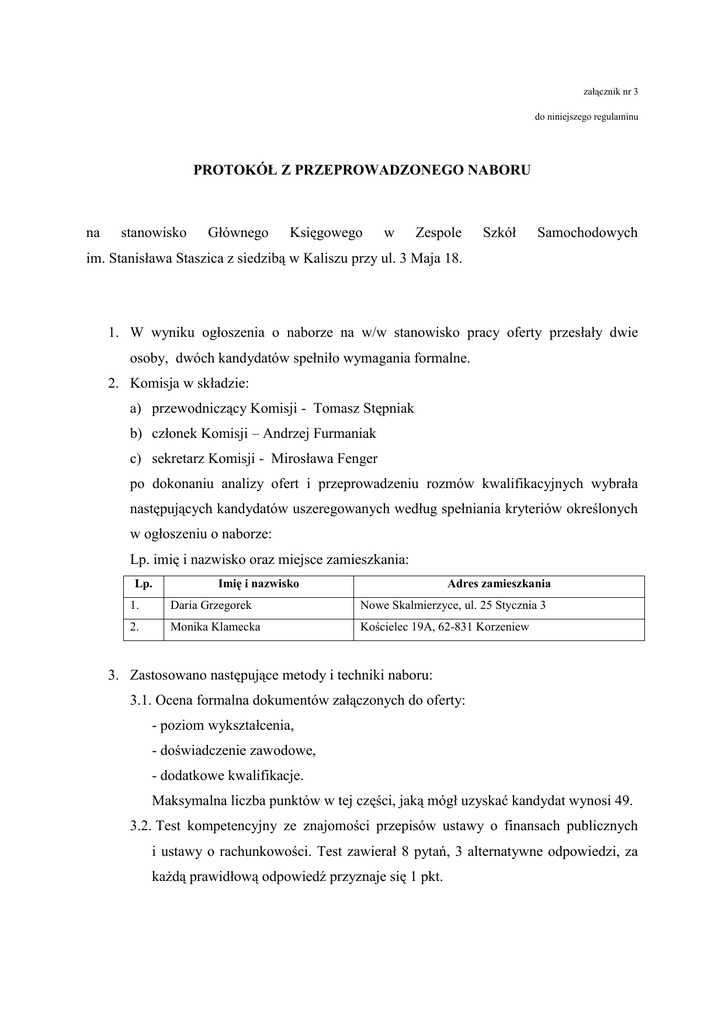 załącznik nr 3 do niniejszego regulaminu PROTOKÓŁ Z PRZEPROWADZONEGO NABORU na stanowisko Głównego Księgowego w Zespole Szkół Samochodowych im. Stanisława Staszica z siedzibą w Kaliszu przy ul. 3 Maja 18. 1. W wyniku ogłoszenia o naborze na w/w stanowisko pracy oferty przesłały dwie osoby, dwóch kandydatów spełniło wymagania formalne. 2. Komisja w składzie: a) przewodniczący Komisji - Tomasz Stępniak b) członek Komisji – Andrzej Furmaniak c) sekretarz Komisji - Mirosława Fenger po dokonaniu analizy ofert i przeprowadzeniu rozmów kwalifikacyjnych wybrała następujących kandydatów uszeregowanych według spełniania kryteriów określonych w ogłoszeniu o naborze: Lp. imię i nazwisko oraz miejsce zamieszkania: Lp. Imię i nazwisko Adres zamieszkania 1. Daria Grzegorek Nowe Skalmierzyce, ul. 25 Stycznia 3 2. Monika Klamecka Kościelec 19A, 62-831 Korzeniew 3. Zastosowano następujące metody i techniki naboru: 3.1. Ocena formalna dokumentów załączonych do oferty: - poziom wykształcenia, - doświadczenie zawodowe, - dodatkowe kwalifikacje. Maksymalna liczba punktów w tej części, jaką mógł uzyskać kandydat wynosi 49. 3.2. Test kompetencyjny ze znajomości przepisów ustawy o finansach publicznych i ustawy o rachunkowości. Test zawierał 8 pytań, 3 alternatywne odpowiedzi, za każdą prawidłową odpowiedź przyznaje się 1 pkt. 3.3. Rozmowa kwalifikacyjna z zakresu wiedzy fachowej z uwzględnieniem specyfiki stanowiska, funkcjonowania samorządu terytorialnego, ordynacji podatkowej, przepisów ZUS oraz przepisów oświatowych. Maksymalna liczba punktów w tej części, jaką mógł uzyskać kandydat wynosi 51. 4. Uzasadnienie wyboru: W wyniku przeprowadzonego postępowania konkursowego, niżej wymienione osoby uzyskały następującą liczbę punktów: 4.1. Monika Klamecka – zamieszkała Kościelec 19A – 60 pkt. 4.2. Daria Grzegorek – zamieszkała Nowe Skalmierzyce, ul. 25 Stycznia 3 – 54pkt. Na podstawie uzyskanej liczby punktów cząstkowych dokonano powyższego wyboru. 5. Załączniki do protokołu: a) kopia ogłoszenia o naborze, b) kopie ofert kandydatów – 2 szt. c) protokół z rozmowy kwalifikacyjnej Protokół sporządził: 12 lutego 2016r Mirosława Fenger (data, imię i nazwisko) Zatwierdził: Podpisy członków Komisji: a) Przewodniczący Komisji - Tomasz Stępniak b) członek Komisji – Andrzej Furmaniak