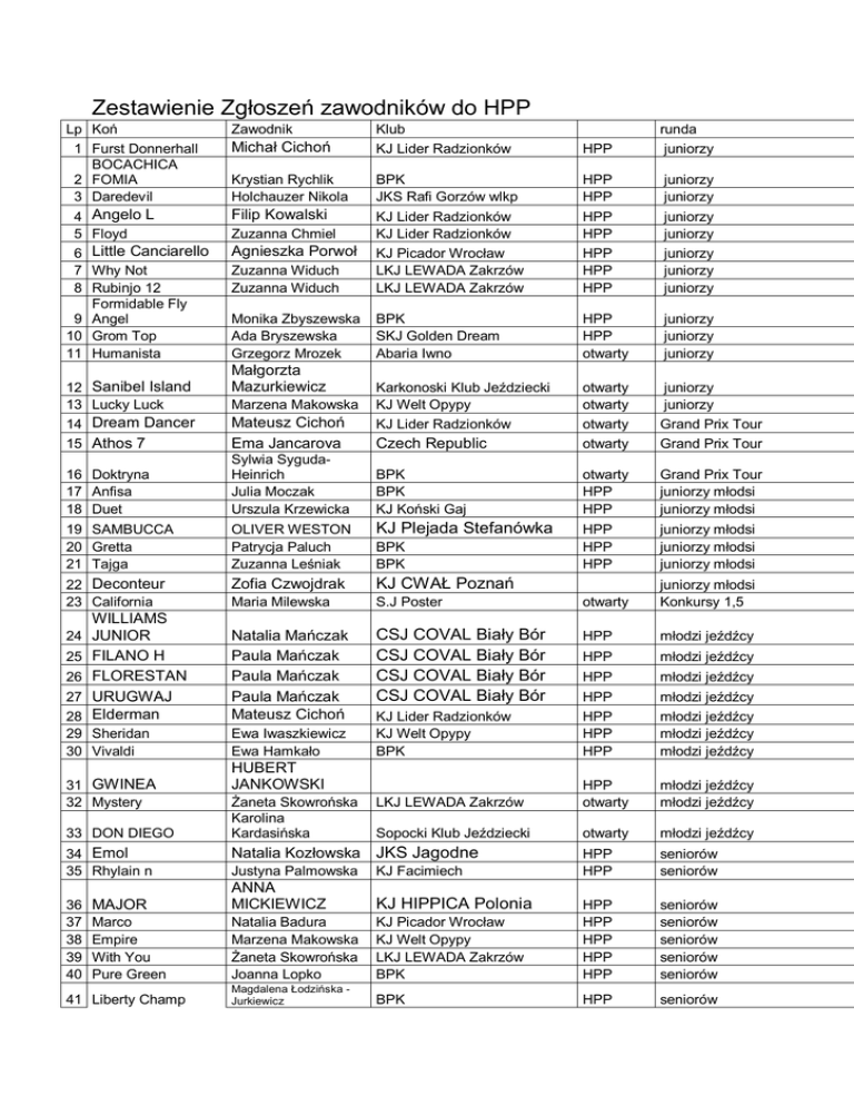 Zestawienie Zgłoszeń zawodników do HPP Lp Koń 1 Furst Donnerhall BOCACHICA 2 FOMIA 3 Daredevil 4 Angelo L 5 Floyd 6 Little Canciarello 7 Why Not 8 Rubinjo 12 Formidable Fly 9 Angel 10 Grom Top 11 Humanista 12 13 14 15 Zawodnik Klub KJ Lider Radzionków HPP runda juniorzy Zuzanna Widuch Zuzanna Widuch BPK JKS Rafi Gorzów wlkp KJ Lider Radzionków KJ Lider Radzionków KJ Picador Wrocław LKJ LEWADA Zakrzów LKJ LEWADA Zakrzów HPP HPP HPP HPP HPP HPP HPP juniorzy juniorzy juniorzy juniorzy juniorzy juniorzy juniorzy Monika Zbyszewska Ada Bryszewska Grzegorz Mrozek BPK SKJ Golden Dream Abaria Iwno HPP HPP otwarty juniorzy juniorzy juniorzy Karkonoski Klub Jeździecki KJ Welt Opypy KJ Lider Radzionków Czech Republic otwarty otwarty otwarty otwarty juniorzy juniorzy Grand Prix Tour Grand Prix Tour BPK BPK KJ Koński Gaj otwarty HPP HPP Grand Prix Tour juniorzy młodsi juniorzy młodsi HPP HPP HPP juniorzy młodsi juniorzy młodsi juniorzy młodsi Michał Cichoń Krystian Rychlik Holchauzer Nikola Filip Kowalski Zuzanna Chmiel Agnieszka Porwoł Sanibel Island Małgorzta Mazurkiewicz Lucky Luck Marzena Makowska Dream Dancer Athos 7 Mateusz Cichoń Ema Jancarova 16 Doktryna 17 Anfisa 18 Duet Sylwia SygudaHeinrich Julia Moczak Urszula Krzewicka 19 SAMBUCCA 20 Gretta 21 Tajga OLIVER WESTON Patrycja Paluch Zuzanna Leśniak KJ Plejada Stefanówka 22 Deconteur 23 California Zofia Czwojdrak KJ CWAŁ Poznań Maria Milewska S.J Poster otwarty juniorzy młodsi Konkursy 1,5 Natalia Mańczak Paula Mańczak Paula Mańczak Paula Mańczak Mateusz Cichoń CSJ COVAL Biały Bór CSJ COVAL Biały Bór CSJ COVAL Biały Bór CSJ COVAL Biały Bór HPP młodzi jeźdźcy HPP młodzi jeźdźcy HPP młodzi jeźdźcy KJ Lider Radzionków KJ Welt Opypy BPK HPP HPP HPP HPP młodzi jeźdźcy młodzi jeźdźcy młodzi jeźdźcy młodzi jeźdźcy LKJ LEWADA Zakrzów HPP otwarty młodzi jeźdźcy młodzi jeźdźcy Sopocki Klub Jeździecki otwarty młodzi jeźdźcy HPP HPP seniorów seniorów 24 25 26 WILLIAMS JUNIOR FILANO H FLORESTAN URUGWAJ Elderman 27 28 29 Sheridan 30 Vivaldi 31 GWINEA 32 Mystery 33 DON DIEGO 34 Emol 35 Rhylain n 36 37 38 39 40 Ewa Iwaszkiewicz Ewa Hamkało BPK BPK HUBERT JANKOWSKI Żaneta Skowrońska Karolina Kardasińska Natalia Kozłowska JKS Jagodne Justyna Palmowska KJ Facimiech MAJOR ANNA MICKIEWICZ KJ HIPPICA Polonia Marco Empire With You Pure Green Natalia Badura Marzena Makowska Żaneta Skowrońska Joanna Lopko KJ Picador Wrocław KJ Welt Opypy LKJ LEWADA Zakrzów BPK HPP HPP HPP HPP HPP seniorów seniorów seniorów seniorów seniorów Magdalena Łodzińska Jurkiewicz BPK HPP seniorów 41 Liberty Champ 42 Falsterbau 43 Long Time 44 LIST 45 Zimba 46 Diplomat Sylwia SygudaHeinrich Zofia Milewska Karolina Kardasińska Gabriela JaworskaMazur, Ema Jancarova BPK S.J Poster HPP HPP seniorów seniorów Sopocki Klub Jeździecki Stowarzyszenie Klub Jeździecki Legia Konielska HPP seniorów HPP Czech Republic otwarty seniorów seniorów