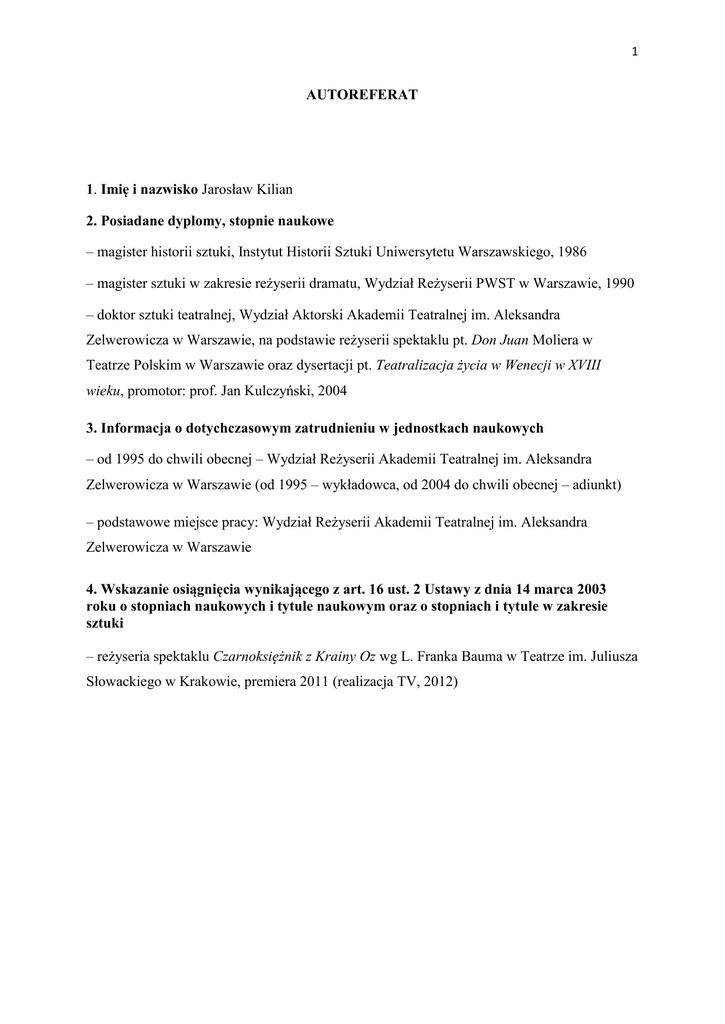 1 AUTOREFERAT 1. Imię i nazwisko Jarosław Kilian 2. Posiadane dyplomy, stopnie naukowe – magister historii sztuki, Instytut Historii Sztuki Uniwersytetu Warszawskiego, 1986 – magister sztuki w zakresie reżyserii dramatu, Wydział Reżyserii PWST w Warszawie, 1990 – doktor sztuki teatralnej, Wydział Aktorski Akademii Teatralnej im. Aleksandra Zelwerowicza w Warszawie, na podstawie reżyserii spektaklu pt. Don Juan Moliera w Teatrze Polskim w Warszawie oraz dysertacji pt. Teatralizacja życia w Wenecji w XVIII wieku, promotor: prof. Jan Kulczyński, 2004 3. Informacja o dotychczasowym zatrudnieniu w jednostkach naukowych – od 1995 do chwili obecnej – Wydział Reżyserii Akademii Teatralnej im. Aleksandra Zelwerowicza w Warszawie (od 1995 – wykładowca, od 2004 do chwili obecnej – adiunkt) – podstawowe miejsce pracy: Wydział Reżyserii Akademii Teatralnej im. Aleksandra Zelwerowicza w Warszawie 4. Wskazanie osiągnięcia wynikającego z art. 16 ust. 2 Ustawy z dnia 14 marca 2003 roku o stopniach naukowych i tytule naukowym oraz o stopniach i tytule w zakresie sztuki – reżyseria spektaklu Czarnoksiężnik z Krainy Oz wg L. Franka Bauma w Teatrze im. Juliusza Słowackiego w Krakowie, premiera 2011 (realizacja TV, 2012) 2 Wstęp Zbudowanie opowieści jest, w moim przekonaniu, głównym zadaniem reżysera. Fabuła skonstruowana przez dramaturga i dana w tekście lub scenariuszu jest teatralną kanwą dzieła teatralnego.1 „Partyturę” tę, zawierającą didaskalia i opisy działań, dostają do ręki: reżyser, scenograf, kompozytor, aktorzy i starają się opowiedzieć ją środkami teatralnymi. Opowieść buduje się na scenie przede wszystkim poprzez wykrycie funkcji dramaturgicznych perypetii bohatera (takich, jak np.: identyfikacja, dojrzewanie, konfrontacja, ofiarność, zagrożenie, ucieczka, powrót) i poprzez działania inscenizacyjne. Autorzy dramatów: Sofokles, Szekspir, Molier, Słowacki, Czechow stawiają przed reżyserem konieczność odczytania partytury fabularnej, wykrycia faktury narracyjnej, która posłuży reżyserowi do konstruowania własnego opowiadania środkami teatralnymi. Fabuły są rusztowaniem do budowania interpretacji i metafory teatralnej. Działania inscenizacyjne stanowią jeden z podstawowych sposobów opowiadania w teatrze. Inscenizowanie jest procesem, w wyniku którego scenariusz (dramat) przyobleka się w kształt sceniczny. Jest realizacją tekstu w przestrzeni i w czasie. „Opowiadanie” w teatrze interesuje mnie z perspektywy wykorzystania wynalazków inscenizacyjnych. Zabiegi te określiłbym mianem wehikułów opowieści, dzięki którym widzowie podążają za historią, rozgrywającą się na scenie. W niniejszym autoreferacie chciałbym przedstawić problematykę związaną z konstruowaniem opowieści w teatrze oraz zająć się zagadnieniem narracji teatralnej w moich inscenizacjach, ze szczególnym uwzględnieniem spektaklu Czarnoksiężnik z krainy Oz. Przedstawię też główne tematy-motywy, pojawiające się w zrealizowanych przeze mnie przedstawieniach. Są nimi: podróż i utopia. 1 Arystoteles w Poetyce mówi, że „naśladowczym przedstawieniem akcji są działania ludzkie (a nie właściwości postaci), dlatego głównym zadaniem poety jest skonstruowanie fabuły, czyli pokazanie uporządkowanego biegu zdarzeń”. (Poetyka, 1450a.) 3 Czarnoksiężnik z Krainy Oz Wiele doświadczeń, nabytych podczas realizacji blisko czterdziestu widowisk teatralnych, wykorzystuję w reżyserii spektaklu, który jest dziełem zgłoszonym w przewodzie habilitacyjnym. Czarnoksiężnik z Krainy Oz2 powstaje w Teatrze im. Juliusza Słowackiego w Krakowie w 2011 roku (rejestracja TV 2012). Spektakl pozostaje do dziś w repertuarze Teatru. Amerykańska opowieść L. Franka Bauma o Dorotce z Kansas, porwanej przez huragan i zaniesionej przez wiatr do Krainy Oz, jest częścią światowej klasyki dziecięcej. Scenariusz widowiska jest moją adaptacją. Jestem też autorem słów piosenek, a Grzegorz Turnau – muzyki. Czarnoksiężnik z Krainy Oz jest opowieścią inicjacyjną. Baśń inicjacyjna ma przygotować młodego człowieka na spotkanie z okrutnym, nieprzewidywalnym, a zarazem różnorodnym i pięknym światem. Historie takie opowiadane są dzieciom, by pomóc im stawić czoła przeciwnościom losu i niebezpieczeństwom, jakie niesie realne życie. Bohaterka – mała dziewczynka z amerykańskiej prowincji, poddana zostaje próbie odwagi, wkracza w nieznany świat, w którym musi sobie sama radzić. Czarnoksiężnik… jest zaprawioną goryczą opowieścią o iluzji raju, o Utopii. Dorotka, porwana przez huragan, ląduje w niezwykłym świecie. Za wszelką cenę jednak chce znaleźć się znów w szarej i smutnej krainie, która jest jej domem. Bohaterka rusza w podróż, by dowiedzieć się, jak powrócić do Kansas. Czarnoksiężnik z Krainy Oz wpisuje się w schemat mitycznych opowieści, który nakreśla w swoich pracach Joseph Campbell3. Myśl amerykańskiego antropologa podejmuje Christopher Vogler4, konstruując uniwersalny i zakodowany w wielu kulturach wzór opowieści, którą nazywa „podróżą bohatera”. Zgodnie z tą koncepcją, Dorotka, wyrwana zostaje ze „Zwykłego Świata” i wezwana do podróży do „Niezwykłego Świata”, spotyka w drodze „Mentora”, który pomaga jej przejść przez kolejne „Progi, Pułapki i Sprawdziany”, dotrzeć do „Najgłębszej Groty”, by w końcu zdobyć „Nagrodę” i „Powrócić do domu z Eliksirem”. Dorotka spotyka na swojej drodze upośledzone przez los stworzenia. Strach na Wróble, Blaszany Drwal, Tchórzliwy Lew to istoty, które nie wierzą w siebie, są przekonane, 2 3 4 Adaptacja Czarnoksiężnika z Krainy Oz wg. tłumaczenia A. Łopatki. J. Campbell, Potęga mitu, tłum. I. Kania, Kraków 1994. Ch. Vogler, Podróż autora – struktury mityczne dla scenarzystów i pisarzy, tłum. K. Kosińska, Warszawa 2010. Podobną zresztą teorię wysnuwa