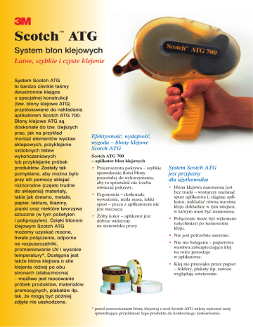 3 ™ Scotch ATG System b∏on klejowych ¸atwe, szybkie i czyste klejenie System Scotch ATG to bardzo cienkie taÊmy dwustronnie klejàce o specjalnej konstrukcji (tzw. b∏ony klejowe ATG) przystosowane do nak∏adania aplikatorem Scotch ATG 700. B∏ony klejowe ATG sà doskona∏e do tzw. l˝ejszych prac, jak na przyk∏ad monta˝ elementów wystaw sklepowych, przyklejanie ozdobnych listew wykoƒczeniowych lub przyklejanie próbek produktów. Zosta∏y tak pomyÊlane, aby mo˝na by∏o przy ich pomocy sklejaç ró˝norodne (cz´sto trudne do sklejenia) materia∏y, takie jak drewno, metale, papier, tektura, tkaniny, pianki oraz niektóre tworzywa sztuczne (w tym polietylen i polipropylen). Dzi´ki b∏onom klejowym Scotch ATG mo˝emy uzyskaç mocne, trwa∏e po∏àczenie, odporne na rozpuszczalniki, promieniowanie UV i wysokie temperatury*. Dost´pna jest tak˝e b∏ona klejowa o sile klejenia ró˝nej po obu stronach (s∏aba/mocna) – mo˝liwe jest mocowanie próbek produktów, materia∏ów promocyjnych, plakatów itp. tak, ˝e mogà byç póêniej zdj´te nie uszkodzone. EfektywnoÊç, wydajnoÊç, wygoda – b∏ony klejowe Scotch ATG Scotch ATG 700 – aplikator b∏on klejowych • Przezroczysta pokrywa – szybkie sprawdzenie iloÊci b∏ony pozosta∏ej do wykorzystania, aby to sprawdziç nie trzeba otwieraç pokrywy. • Ergonomia – doskona∏e wywa˝enie, ma∏a masa, lekki spust – praca z aplikatorem nie jest m´czàca. • ˚ó∏ty kolor – aplikator jest dobrze widoczny na stanowisku pracy System Scotch ATG jest przyjazny dla u˝ytkownika • b∏ona klejowa nanoszona jest bez trudu – wystarczy nacisnàç spust aplikatora i, ciàgnàc aplikator, nak∏adaç równà warstw´ kleju dok∏adnie w tym miejscu, w którym musi byç naniesiona. • Po∏àczenie mo˝e byç wykonane natychmiast po naniesieniu kleju. • Nie jest potrzebne suszenie. • Nie ma ba∏aganu – papierowa warstwa zabezpieczajàca klej na rolce pozostaje w aplikatorze. • Klej nie przesiàka przez papier – foldery, plakaty itp. zawsze wyglàdajà estetycznie. * przed zastosowaniem b∏ony klejowej z serii Scotch ATG nale˝y wykonaç testy sprawdzajàce przydatnoÊc tego produktu do konkretnego zastosowania. Zastosowania b∏on klejowych Scotch™ ATG Reklama przyklejanie zdj´ç, liter, elementów, plakatów, mocowanie próbek produktów, aran˝acja wystaw sklepowych i targowych, wklejki do czasopism, kartonowe stojaki na materia∏y reklamowe Poligrafia, introligatorstwo Produkcja mebli i artyku∏ów tekstylnych Elektronika przyklejanie listew wykoƒczeniowych i ozdobnych, klejenie zamiast fastrygowania przed zszyciem, przyklejanie próbek tkanin do wzorników, mocowanie poczàtku beli tkaniny. pozycjonowanie cz´Êci przed lutowaniem, przyklejanie uszczelek gumowych i elementów wyg∏uszajàcych. Opakowania klejenie folderów, kart okolicznoÊciowych, mocowanie poczàtku zwoju papieru, „galanteria papiernicza”: teczki, wzorniki itp. mocowanie etykiet i dokumentów, wklejanie „usztywniaczy” ze styropianu do kartonu, zamykanie ma∏ych pude∏ek, wklejanie wk∏adek z pianek do pude∏ek i szkatu∏ek. Charakterystyka b∏on klejowych Scotch ATG* Nr GruboÊç taÊmy (mm) Max. wytrzyma∏oÊç temperaturowa krótkotrw. (min/godz) d∏ugotrw. (dni/tyg) OdpornoÊç na rozpuszczalniki Opis/uwagi Materia∏y klejone Przyk∏adowe zastosowania 904 0,05 200°C 120°C du˝a TaÊma ogólnego zastosowania. Wysoka poczàtkowa si∏a klejenia. Doskona∏a odpornoÊç na UV Papier, folie, klisze, tkaniny, pianki. Mocowanie poczàtku roli. Przyklejanie plakatów. Galanteria papiernicza: teczki, wzorniki itp. Kartonowe stojaki na materia∏y reklamowe. 924 0,05 120°C 80°C du˝a Wysoka poczàtkowa si∏a klejenia. Doskona∏a odpornoÊç na promienie UV. Metale, drewno, szk∏o, papier, powierzchnie malowane, wi´kszoÊç tworzyw sztucznych. Mocowanie poczàtku roli. Przyklejanie etykiet i instrukcji na butelki. Przyklejanie plakatów, fotografii i pianek. Przyklejanie metalowych i plastykowych tabliczek. 926 0,13 230°C 150°C du˝a Bardzo mocne po∏àczenie wielu materia∏ów. Doskona∏a odpornoÊç na promienie UV. Metale, drewno, niektóre tworzywa sztuczne. Przyklejanie listew wykoƒczeniowych. 928 0,05 65°C 50°C brak Ró˝na (s∏aba i mocna) si∏a klejenia z obu stron taÊmy. Nie transferuje kleju (dotyczy warstwy klejàcej o mniejszej sile klejenia). Umo˝liwia repozycjonowanie, zdejmowanie klejonych elementów. Papier, folie, klisze. Mocowanie materia∏ów promocyjnych. Mocowanie fotografii. Aran˝acja wystaw. Usuwalne „wrzutki” do czasopism, ksià˝ek itp. 969 0,13 120°C 80°C Êrednia Do ogólnego mocowania i monta˝u. S∏aba odpornoÊç na UV – nie zaleca si´ ekspozycji na Êwiat∏o s∏oneczne. OdpornoÊç na plastyfikatory. Nie przesiàka przez papier. Agresywny klej o wysokiej poczàtkowej sile klejenia. Papier (tak˝e powlekany), folie, tkaniny, metal, niektóre tworzywa sztuczne. Przyklejanie fotografii. Przyklejanie tkanin. Mocowanie metalowych i plastykowych tabliczek. Przyklejanie druków informacyjnych do opakowaƒ. 976 0,05 120°C 80°C Êrednia Do ogólnego mocowania i monta˝u. S∏aba odpornoÊç na UV – nie zaleca si´ ekspozycji na Êwiat∏o s∏oneczne. OdpornoÊç na plastyfikatory. Nie przesiàka przez papier. Agresywny klej o wysokiej poczàtkowej sile klejenia. Papier (tak˝e powlekany), folie, tkaniny, metal, niektóre tworzywa sztuczne. Przyklejanie fotografii. Przyklejanie tkanin. Mocowanie metalowych i plastykowych tabliczek. Wszystkie informacje, dane techniczne oraz zalecenia odnoszàce si´ do produktów firmy 3M oparte sà na testach, które oceniamy jako wiarygodne; ze wzgl´du jednak na ró˝norodnoÊç materia∏ów, pod∏o˝y i odmiennych warunków pracy nie mo˝emy zagwarantowaç ca∏kowitej skutecznoÊci aplikacji. U˝ytkownik ponosi ca∏kowità odpowiedzialnoÊç za decyzj´, czy dany produkt jest odpowiedni do zastosowania