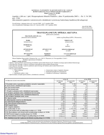 KOMISJA PAPIERÓW WARTOŚCIOWYCH i GIEŁD 00-950 WARSZAWA PLAC POWSTAŃCÓW WARSZAWY 1 Raport roczny SA- R/2005 (rok bieżący) (zgodnie z §86 ust. 1 pkt.3 Rozporządzenia Ministra Finansów z dnia 19 października 2005 r. - Dz. U. Nr 209, poz. 1744) (dla emitentów papierów wartościowych o działalności wytwórczej, budowlanej, handlowej lub usługowej) Za rok bieżący obejmuje okres od 1 stycznia 2005r do 31 grudnia 2005r oraz rok poprzedni obejmujące okres od 1 stycznia 2004r do 31 grudnia 2004r dnia 09 06 2006 (data przekazania) TRAVELPLANET.PL SPÓŁKA AKCYJNA (pełna nazwa emitenta) TRAVELPLANET.PL S.A. (skrócona nazwa emitenta) (sektor wg klasyfikacji GPW w Warszawie) 50-066 kod pocztowy) WROCŁAW (miejscowość) ŚWIDNICKA (ulica) 13 (numer) (071)341-82-45 (telefon) (071)343-17-49 (fax) 897-16-52-554 (NIP) 932281575 (REGON) [email protected] (e-mail) www.travelplanet.pl (www) Moore Stephens Smoczyński i Partnerzy Sp. z o.o., 00-511 Warszawa, ul. Nowogrodzka 12 lok.3. (Podmiot uprawniony do badania) Raport roczny zawiera : x Opinię i raport podmiotu uprawnionego do badania sprawozdań finansowych z badania rocznego sprawozdania finansowego x Oświadczenie Zarządu w sprawie rzetelności sporządzenia sprawozdania finansowego x Oświadczenie Zarządu w sprawie podmiotu uprawnionego do badania sprawozdań finansowych x Pismo Prezesa Zarządu x Roczne sprawozdanie finansowe x Wprowadzenie x Zestawienie zmian w kapitale własnym x Bilans x Rachunek przepływów pieniężnych x Rachunek zysków i strat x Dodatkowe informacje i objaśnienia x Sprawozdanie zarządu (sprawozdanie z działalności emitenta) WYBRANE DANE FINANSOWE I. Przychody netto ze sprzedaży produktów, towarów i materiałów II. Zysk (strata) z działalności operacyjnej III. Zysk (strata) brutto IV. Zysk (strata) netto V. Przepływy pieniężne netto z działalności operacyjnej VI. Przepływy pieniężne netto z działalności inwestycyjnej VII. Przepływy pieniężne netto z działalności finansowej VIII. Przepływy pieniężne netto, razem IX. Aktywa razem X. Zobowiązania i rezerwy na zobowiązania XI. Zobowiązania długoterminowe XII. Zobowiązania krótkoterminowe XIII. Kapitał własny XIV. Kapitał zakładowy XV. Liczba akcji (w szt.) XVI. Zysk (strata) netto na jedną akcję zwykłą (w zł / EUR) XVII. Rozwodniony zysk (strata) netto na jedną akcję zwykłą (w zł / EUR) XVIII Wartość księgowa na jedną akcję (w zł / EUR) XIX. Rozwodniona wartość księgowa na jedną akcję (w zł / EUR) XX. Zadeklarowana lub wypłacona dywidenda na jedną akcję (w zł / EUR) w tys. zł rok bieżący rok poprzedni 2005 2004 16 450 -18 44 63 688 -1 613 5 767 4 842 9 209 2 917 47 2 532 6 292 2 146 2 145 740 0,03 0,03 2 932,13 2 932,13 - 5 196 -129 3 11 -114 -237 484 133 2 235 1 761 14 1 487 474 1 775 1 775 370 0,01 0,01 266,98 266,98 - w tys. EUR rok bieżący rok poprzedni 2005 2004 4 089 -4 11 16 178 -418 1 494 1 254 2 386 756 12 656 1 630 556 2 145 740 0,01 0,01 759,66 759,66 - Raport roczny powinien być przekazany do Komisji Papierów Wartościowych i Giełd, Giełdy Papierów Wartościowych w Warszawie SA oraz Polskiej Agencji Prasowej zgodnie z przepisami prawa Global Reports LLC 1 150 -29 1 2 -28 -58 119 33 548 432 3 365 116 435 1 775 370 0,00 0,00 65,45 65,45 - Travelplanet.pl S.A. ul. Świdnicka 13, 50-066 Wrocław NIP: 897-16-52-554 REGON: 932281575 Roczne sprawozdanie finansowe za okres od 1 stycznia do 31 grudnia 2005 roku Global Reports LLC Travelplanet.pl Roczne sprawozdanie finansowe za okres obrotowy od 1 stycznia do 31 grudnia 2005. WPROWADZENIE DO SPRAWOZDANIA FINANSOWEGO 1. Informacje o Spółce a. Travelplanet.pl S.A. powstała w wyniku zawarcia umowy Spółki sporządzonej w dniu 06.12.2000 r., w formie aktu notarialnego, Repertorium nr A nr 9351/2000 w Kancelarii Notarialnej we Wrocławiu przy pl. Solnym 13, przed Notariuszem Heleną Szymczyk-Grabińską. Zgodnie z umową Spółka została zawiązana na czas nieokreślony. b. Siedziba Spółki mieści się we Wrocławiu przy ul. Świdnickiej 13. c. W dniu 15.12.2000 r. postanowieniem Sądu Gospodarczego we Wrocławiu Spółka została wpisana do rejestru handlowego pod nr RHB 10106. W dniu 24.10.2001 Postanowieniem Sądu Rejonowego we Wrocławiu VI Wydział Gospodarczy Krajowego Rejestru Sądowego Spółka została wpisana do Krajowego Rejestru Sądowego – Rejestru Przedsiębiorców pod numerem KRS 0000055057. d. Przedmiotem działalności Spółki jest przede wszystkim: • działalność agencji podróży 63.30 B. 2. Skład Zarządu i Prokury 2005 rok a. W skład Zarządu wchodzą : • Pan Piotr Multan • Pan Tomasz Moroz • Pan Krzysztof Wachowski Prezes Zarządu; Wiceprezes Zarządu; Członek Zarządu. b. W skład Prokury wchodzi : • Jakub Mazur Prokurent. 2006 rok a. W skład Zarządu wchodzi • Tomasz Moroz Prezes Zarządu. b. • • W skład Pokury wchodzą: Anna Chryplewicz Radosław Tadajewski Prokurent; Prokurent. 3. Zasady przyjęte przy sporządzeniu sprawozdania finansowego a. Niniejsze sprawozdanie finansowe obejmuje okres od 1.01.2005 do 31.12.2005 i zostało sporządzone przy założeniu, że Spółka będzie kontynuować działalność gospodarczą w dającej się przewidzieć przyszłości oraz że nie zamierza ani nie musi zaniechać działalności lub istotnie zmniejszyć jej zakresu. Zgodnie z wiedzą Zarządu Spółki nie istnieją okoliczności wskazujące na zagrożenie kontynuowania działalności przez Spółkę. b. Rachunek przepływów pieniężnych jest sporządzony metodą pośrednią. 4. Średnie kursy wymiany złotego w stosunku do EURO ogłoszone przez Narodowy Bank Polski Okres Kurs średni w Minimalny kurs Maksymalny Kurs na ostatni okresie w okresie kurs w okresie dzień okresu 1 styczeń 2004 – 31 grudnia 2004 4,5182 4,0518 4,9149 4,0790 1 styczeń 2005 – 31 grudnia 2005 4,0233 3,8223 4,2756 3,8598 1 Global Reports LLC Travelplanet.pl Roczne sprawozdanie finansowe za okres obrotowy o
