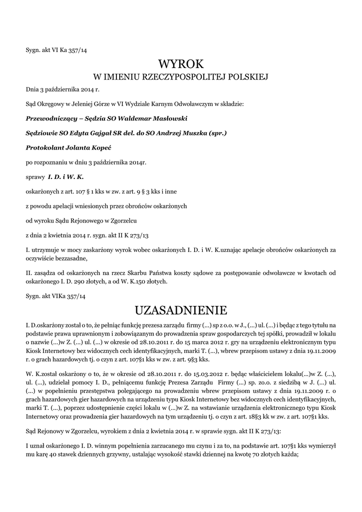 Sygn. akt VI Ka 357/14 WYROK W IMIENIU RZECZYPOSPOLITEJ POLSKIEJ Dnia 3 października 2014 r. Sąd Okręgowy w Jeleniej Górze w VI Wydziale Karnym Odwoławczym w składzie: Przewodniczący – Sędzia SO Waldemar Masłowski Sędziowie SO Edyta Gajgał SR del. do SO Andrzej Muszka (spr.) Protokolant Jolanta Kopeć po rozpoznaniu w dniu 3 października 2014r. sprawy I. D. i W. K. oskarżonych z art. 107 § 1 kks w zw. z art. 9 § 3 kks i inne z powodu apelacji wniesionych przez obrońców oskarżonych od wyroku Sądu Rejonowego w Zgorzelcu z dnia 2 kwietnia 2014 r. sygn. akt II K 273/13 I. utrzymuje w mocy zaskarżony wyrok wobec oskarżonych I. D. i W. K.uznając apelacje obrońców oskarżonych za oczywiście bezzasadne, II. zasądza od oskarżonych na rzecz Skarbu Państwa koszty sądowe za postępowanie odwoławcze w kwotach od oskarżonego I. D. 290 złotych, a od W. K.150 złotych. Sygn. akt VIKa 357/14 UZASADNIENIE I. D.oskarżony został o to, że pełniąc funkcję prezesa zarządu firmy (...) sp z o.o. w J., (...) ul. (...) i będąc z tego tytułu na podstawie prawa uprawnionym i zobowiązanym do prowadzenia spraw gospodarczych tej spółki, prowadził w lokalu o nazwie (...)w Z. (...) ul. (...) w okresie od 28.10.2011 r. do 15 marca 2012 r. gry na urządzeniu elektronicznym typu Kiosk Internetowy bez widocznych cech identyfikacyjnych, marki T. (...), wbrew przepisom ustawy z dnia 19.11.2009 r. o grach hazardowych tj. o czyn z art. 107§1 kks w zw. z art. 9§3 kks. W. K.został oskarżony o to, że w okresie od 28.10.2011 r. do 15.03.2012 r. będąc właścicielem lokalu(...)w Z. (...), ul. (...), udzielał pomocy I. D., pełniącemu funkcję Prezesa Zarządu Firmy (...) sp. zo.o. z siedzibą w J. (...) ul. (...) w popełnieniu przestępstwa polegającego na prowadzeniu wbrew przepisom ustawy z dnia 19.11.2009 r. o grach hazardowych gier hazardowych na urządzeniu typu Kiosk Internetowy bez widocznych cech identyfikacyjnych, marki T. (...), poprzez udostępnienie części lokalu w (...)w Z. na wstawianie urządzenia elektronicznego typu Kiosk Internetowy oraz prowadzenia gier hazardowych na tym urządzeniu tj. o czyn z art. 18§3 kk w zw. z art. 107§1 kks. Sąd Rejonowy w Zgorzelcu, wyrokiem z dnia 2 kwietnia 2014 r. w sprawie sygn. akt II K 273/13: I uznał oskarżonego I. D. winnym popełnienia zarzucanego mu czynu i za to, na podstawie art. 107§1 kks wymierzył mu karę 40 stawek dziennych grzywny, ustalając wysokość stawki dziennej na kwotę 70 złotych każda; II uznał oskarżonego W. K.za winnego popełnienia zarzucanego mu czynu i za to, na podstawie art. 107§1 kks w zw. z art. 19§1 kk wymierzył mu karę 20 stawek dziennych grzywny przy przyjęciu jednej stawki w kwocie po 20 złotych każda; III na podstawie art. 30§5 kks orzekł przepadek dowodów rzeczowych wymienionych w wykazie dowodów rzeczowych na k. 169 pod pozycją 1 i 2 IV zasądził od oskarżonych na rzecz Skarbu Państwa koszty sądowe w częściach równych i wymierzył im opłaty: wobec I. D. w kwocie 280 złotych oraz wobec W. K.w kwocie 140 złotych. Apelację od wyroku wniósł obrońca oskarżonego I. D. i zaskarżając go w całości zarzucił: 1. błąd w ustaleniach faktycznych poprzez błędne przyjęcie przez Sąd I instancji, że oskarżony I. D.prowadził gry na urządzeniu elektronicznym – kiosku internetowym o nazwie T. (...) wbrew przepisom ustawy o grach hazardowych, podczas gdy działania oskarżonego D. ( polegające tylko i wyłącznie udzielaniu korzystającym z terminala internetowego możliwości dostępu do sieci Internet ) nie posiadają cech tego rodzaju zachowań, gdyż ani oskarżony, ani Spółka gier hazardowych nie prowadziła, ani też takich gier nie organizowała, zatem w konsekwencji należy uznać, że samo wstawienie terminala internetowego do lokalu o nazwie „(...)” w Z. przy ul. (...) przez spółkę reprezentowaną przez oskarżonego nie mogło stanowić czynu zabronionego z art. 107 kks , również mając na uwadze stronę podmiotową tego czyn; 2. błędne przyjęcie przez Sąd a quo, że przedmiotowy terminal internetowy ( kiosk internetowy) był automatem do gier, o którym mowa w art. 2 ust. 5 ugh podczas gdy urządzenie to jest prostą konstrukcyjnie formą komputer (...) wraz z możliwością korzystania z Internetu, ale dopiero po podłączeniu dodatkowych urządzeń zewnętrznych, takich jak np. router, a gdyby nawet przyjąć, że na urządzeniu tym potencjalni klienci, wbrew obowiązującemu regulaminowi korzystania z tego urządzenia, wchodzili na strony internetowe związane z grami hazardowymi, to robili to na własne ryzyko, bowiem właściciel urządzenia nie może ponosić negatywnych konsekwencji za czyny osób trzecich; obrazę prawa materialnego tj. 1. art. 2 ust. 6 i 7 ustawy z dnia 19 listopada 2009 r. o grach hazardowych poprzez ich niezastosowanie w niniejszej sprawie, mimo, iż mocą tych przepisów, to tylko Minister Finansów posiada wyłączna kompetencję do rozstrzygania decyzją między innymi o tym, czy dana gra jest grą na automacie lub grą hazardową w rozumieniu ustawy o grach hazardowych 2. art. 8 stu. 1 w zw. z art. 1 pkt 11 dyrektywy nr 98/34/WE z dnia 22 czerwca 1998 r. ustanawiającej procedurę udzielania informacji w dziedzinie norm i przepisów technicznych oraz zasad dotyczących usług społeczeństwa informacyjnego ( Dz. U. UE L. 98.204.37 ze zm. ) mające postać wydania sprzecznego z prawem Unii Europejskiej orzeczenia opartego o przepis art. 14 ust. 1 ( i subsydiarnego względem niego przepisu art. 6 ust. 1 ) ustawy z dnia 19 listopada 2009 r. o grach hazardowych, które mocą wyroku Trybunału Sprawiedliwości Unii Europejskiej z dnia 19 lipca 2012 r. ( sygn. C- 213/11 F. i inni ) uznany został wprost za przepis techniczny, który tym samym, z uwagi na brak obligatoryjnej notyfikacji Komisji Europejskiej , nie mogą być stosowane przez Sądy w polskim systemie prawnym, a zatem są bezskuteczne równ