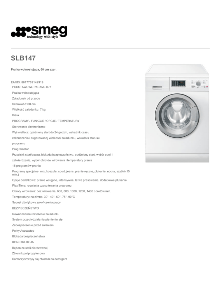 SLB147 Pralka wolnostojąca, 60 cm szer. EAN13: 8017709142919 PODSTAWOWE PARAMETRY Pralka wolnostojąca Załadunek od przodu Szerokość: 60 cm Wielkość załadunku: 7 kg Biała PROGRAMY / FUNKCJE / OPCJE / TEMPERATURY Sterowanie elektroniczne Wyświetlacz: opóźniony start do 24 godzin, wskaźnik czasu zakończenia i sugerowanej wielkości załadunku, wskaźnik statusu programu Programator Przyciski: start/pauza, blokada bezpieczeństwa, opóźniony start, wybór opcji i zatwierdzenie, wybór obrotów wirowania i temperatury prania 15 programów prania Programy specjalne: mix, koszule, sport, jeans, pranie ręczne, płukanie, nocny, szybki (15 min.) Opcje dodatkowe: pranie wstępne, intensywne, łatwe prasowanie, dodatkowe płukanie FlexiTime: regulacja czasu trwania programu Obroty wirowania: bez wirowania, 600, 800, 1000, 1200, 1400 obrotów/min. Temperatury: na zimno, 30°, 40°, 60°, 75°, 90°C Sygnał dźwiękowy zakończenia pracy BEZPIECZEŃSTWO Równomierne rozłożenie załadunku System przeciwdziałania pienieniu się Zabezpieczenie przed zalaniem Pełny Acquastop Blokada bezpieczeństwa KONSTRUKCJA Bęben ze stali nierdzewnej Zbiornik polipropylenowy Samoczyszczący się zbiornik na detergent Średnica drzwiczek: 30 cm Kąt otwarcia drzwiczek: 180° Łatwy dostęp do filtra SPECYFIKACJA TECHNICZNA Moc przyłączeniowa: 2 kW Zużycie energii: 1,08 kW/cykl Zużycie wody: 47 l/cykl Cykl normatywny: bawełna 60°C przy pełnym załadunku Czas trwania cyklu normatywnego: 150 min. Roczne zużycie energii podczas prania: 218 kWh Roczne zużycie wody podczas prania: 10 340 l Poziom hałasu (pranie) 59 dB(A) Poziom hałasu (wirowanie) 78 dB(A) Napięcie: 220-240 V Częstotliwość: 50 Hz Panel sterowania w języku włoskim Functions SMEG S.p.A. Via Leonardo da Vinci, 4 42016 Guastalla (RE) Tel. 0522 821 1 SLB147 pralki wolnostojące ładowane od przodu A+: Klasa A + pozwala na oszczędność energii do 10% w stosunku do urządzeń należących do klasy A. Wydajność urządzenia jest gwarantowana pomimo niskiego poziomu zużycia energii. ZAŁADUNEK PRANIA: W zależności od modelu załadunek jest możliwy od 6 do 9 kg. ACQUASTOP: System zapobiegający zalaniu pomieszczenia. Display LED: Per ottimizzare le prestazioni e semplificare al massimo l’utilizzo dell’elettrodomestico , alcune lavabiancheria e alcuni frigoriferi sono dotati di un display LED che permette di visualizzare lo stato di funzionamento del prodotto. Oblò largo 30cm: Le grandi dimensioni dell’oblò da 30 cm sino a 33 cm rendono le operazioni di carico e scarico del bucato ancora più agevoli e veloci favorendo la massima praticità d’uso. Опция FlexiTime: есть в различных моделях и может быть согласована с большинством программ. Эта опция позволяет сокращать время стирки в зависимости от потребностей и загрязнения белья без ущерба для качества стирки. SYGNAŁ AKUSTYCZNY: Sygnał akustyczny informuje o zakończeniu suszenia, aby jak najszybciej wyjąć ubrania. BLOKADA BEZPIECZEŃSTWA: Blokady przeciwko dzieciom są stosowane w takich urządzeniach jak kuchenki, płyty grzewcze i zmywarki. Gdy opcja jest włączona wszystkie funkcje i programy są zablokowane, włącznie z funkcjami włączania i wyłączania urządzenia, co zapewnia pełne bezpieczeństwo dla dzieci. POWŁOKA ZAPOBIEGAJĄCA POWSTAWANIU ODCISKÓW PALCÓW: W większości urządzeń firmy SMEG stosowana jest, przy użyciu specjalnej technologii, powłoka zapobiegająca pozostawianiu odcisków palców na powierzchni stali nierdzewnej. SMEG S.p.A. Via Leonardo da Vinci, 4 42016 Guastalla (RE) Tel. 0522 821 1 SLB147 pralki wolnostojące ładowane od przodu SMEG S.p.A. Via Leonardo da Vinci, 4 42016 Guastalla (RE) Tel. 0522 821 1